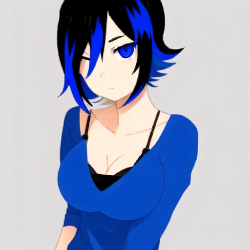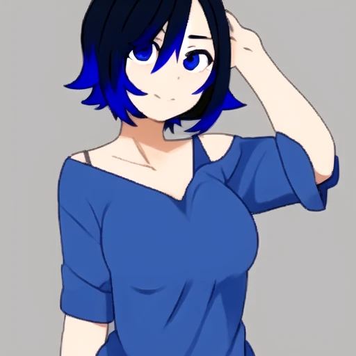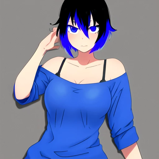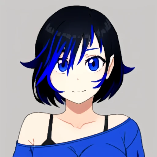 1girl, solo, simple background, large breasts, short hair, blue shirt, off shoulder, black pants, blue eyes, underwear, short hair, black hair, blue hair, two-tone hair, multicolored hair, bra, black bra, bra strap, hair over one eye