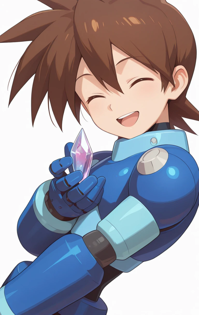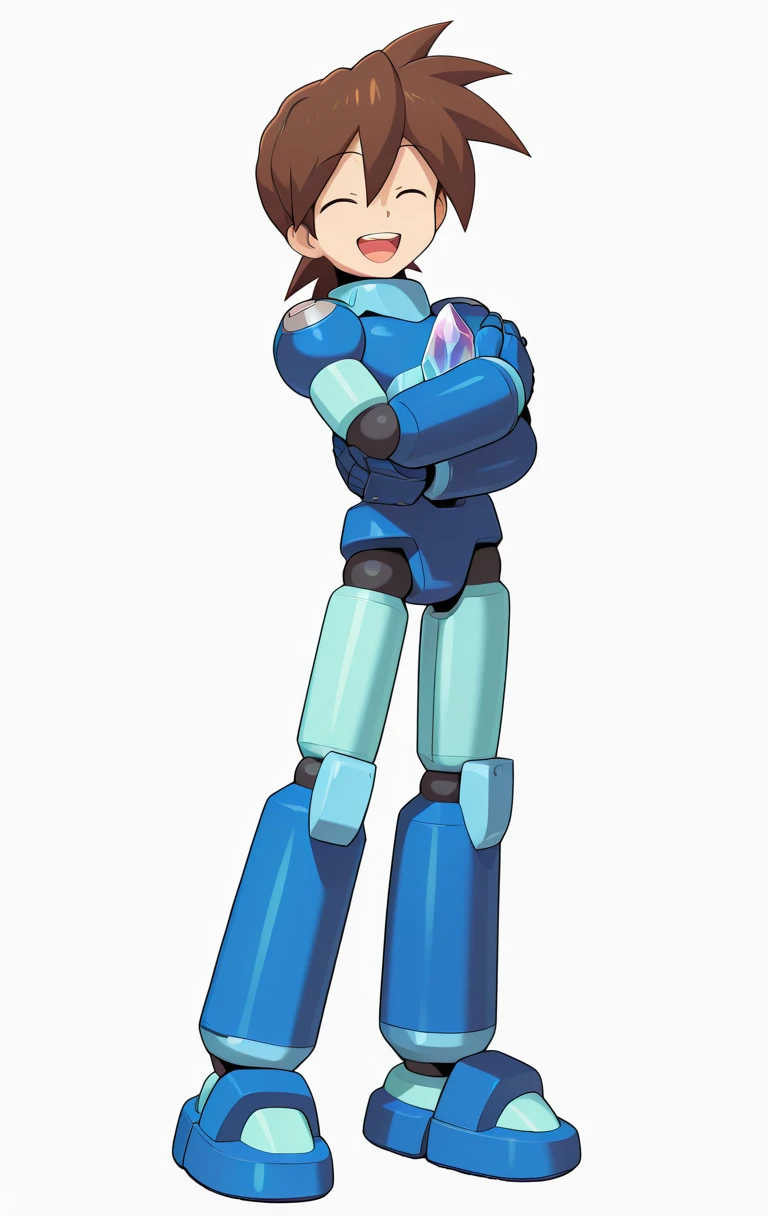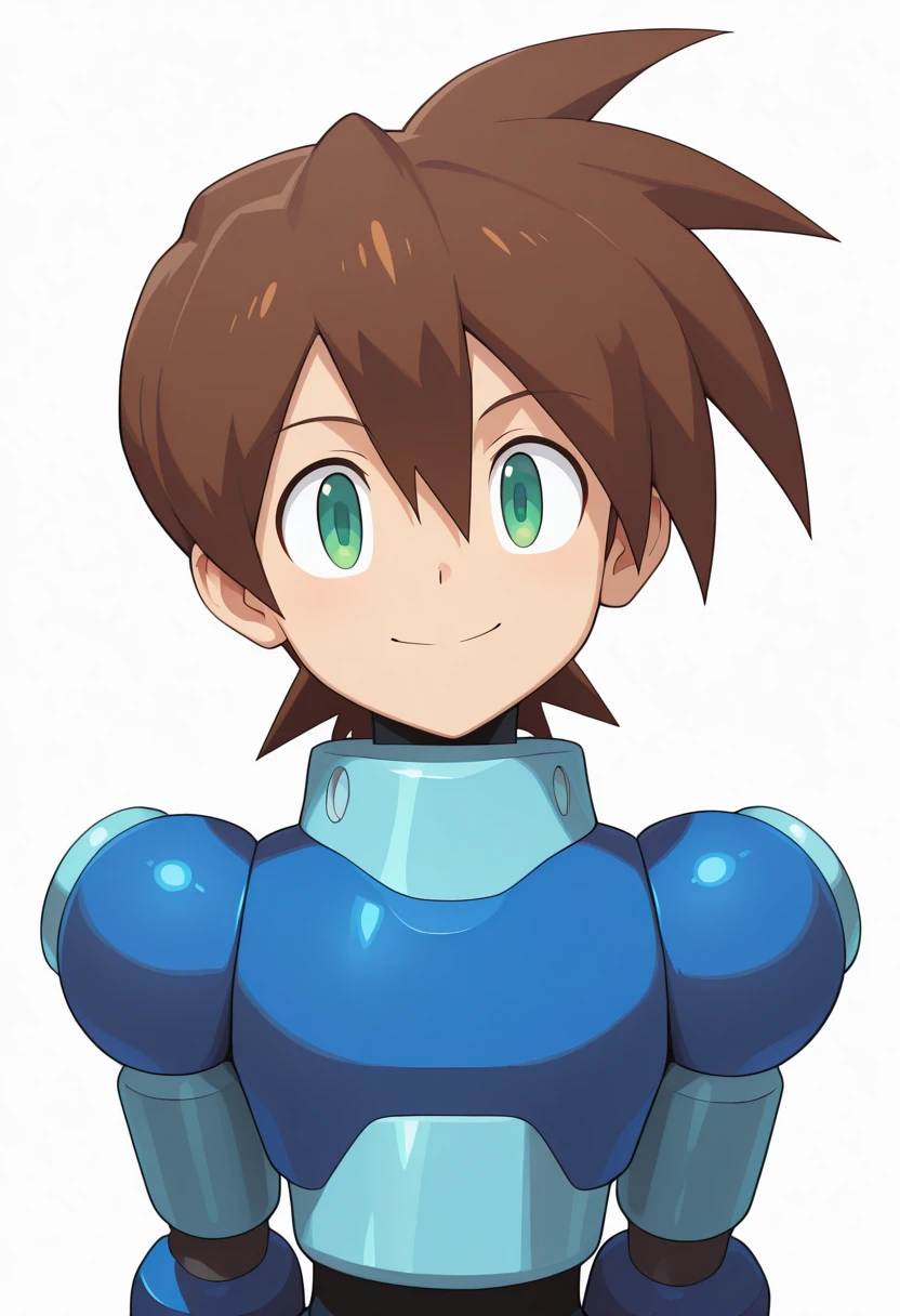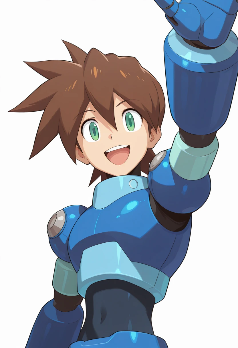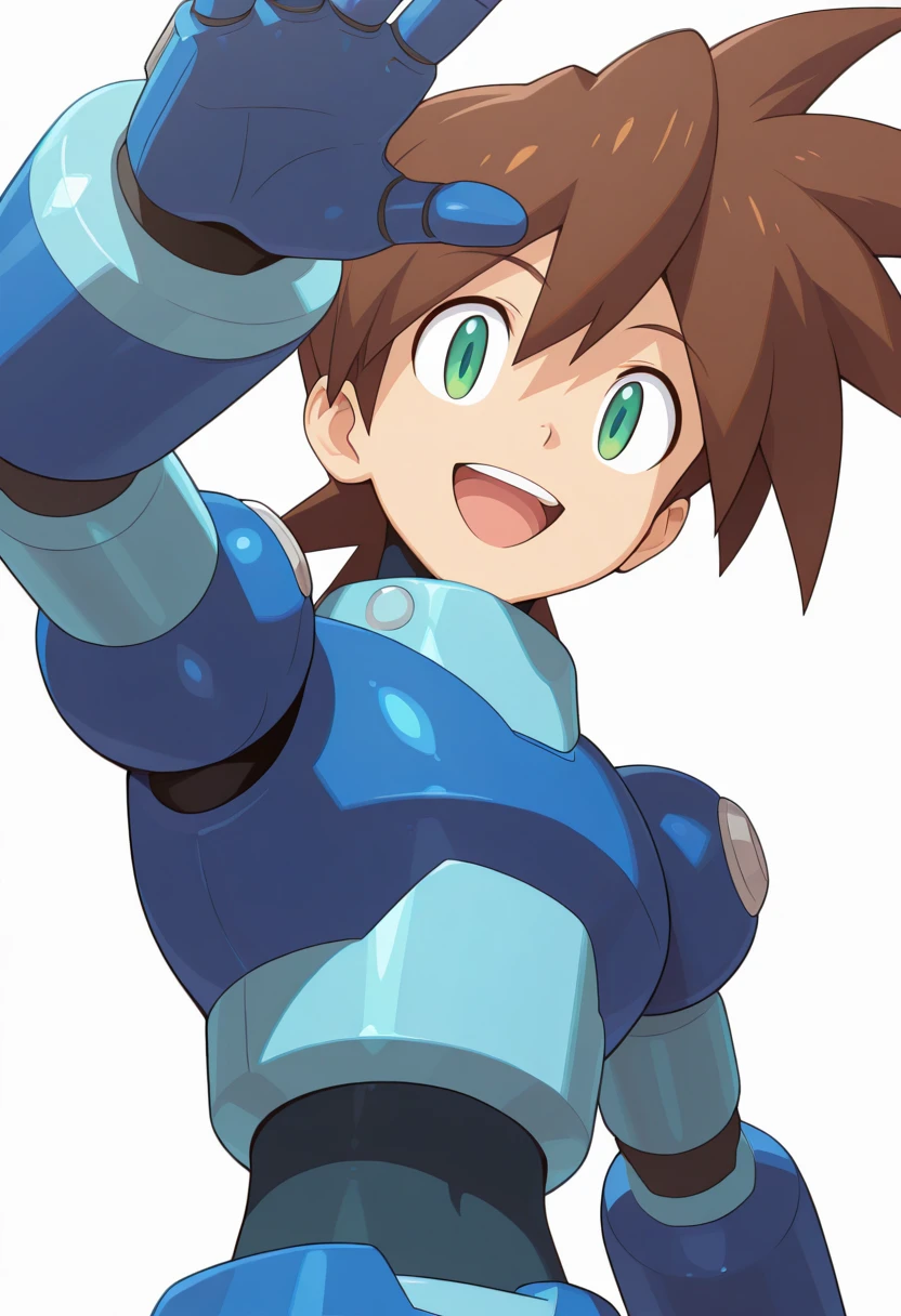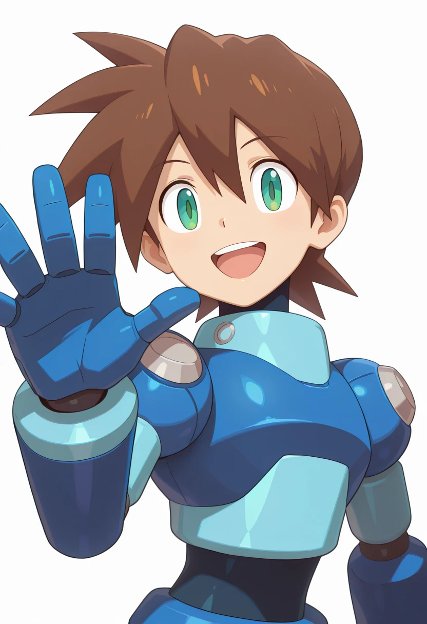 Prompt: masterpiece, best quality, (anime coloring:1.2), 1boy, solo, mega man volnutt, brown hair, green eyes, blue green and black armored body, portrait, looking at viewer, open mouth smile, arm to side, arm raised waving with open hand, white background