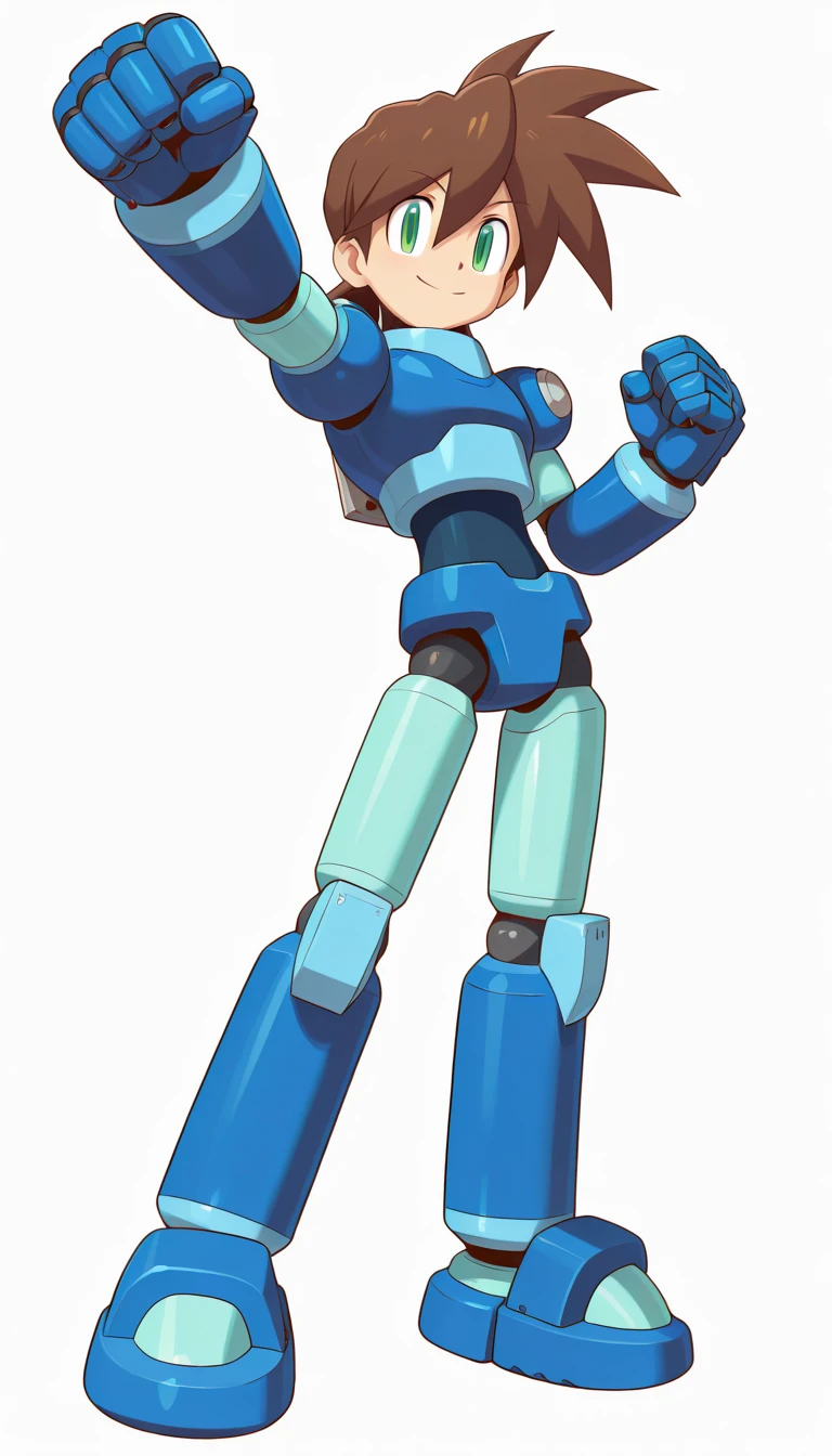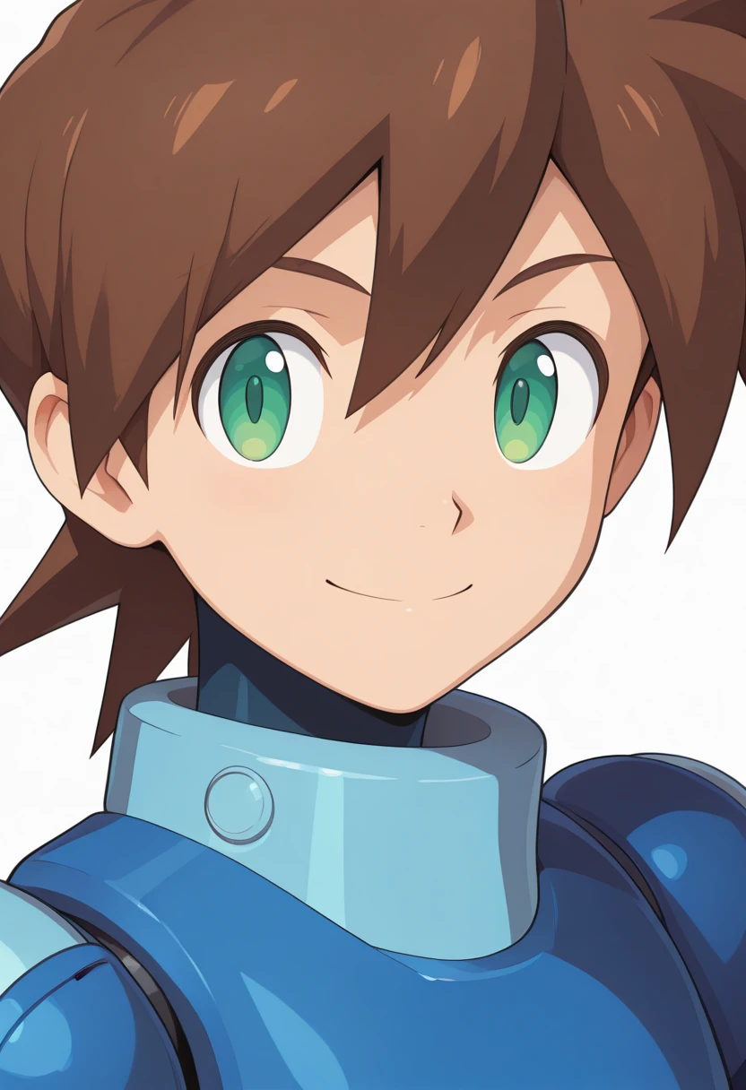 mega man volnutt, brown hair, green eyes, blue green and black armored body, helmet