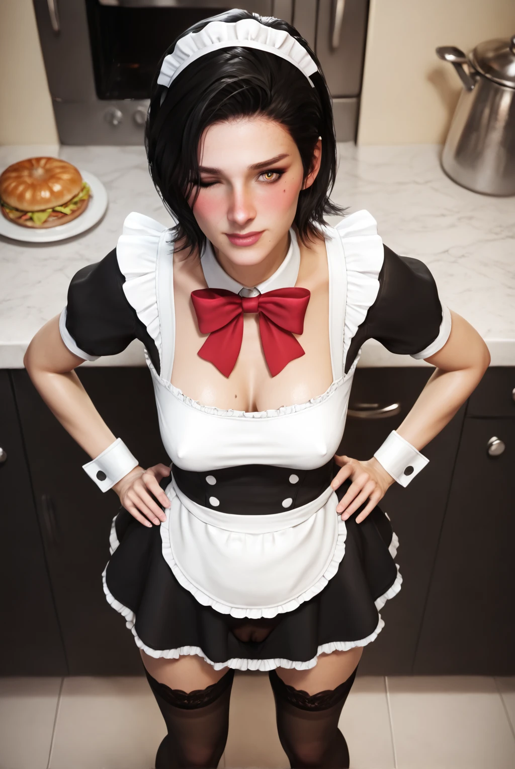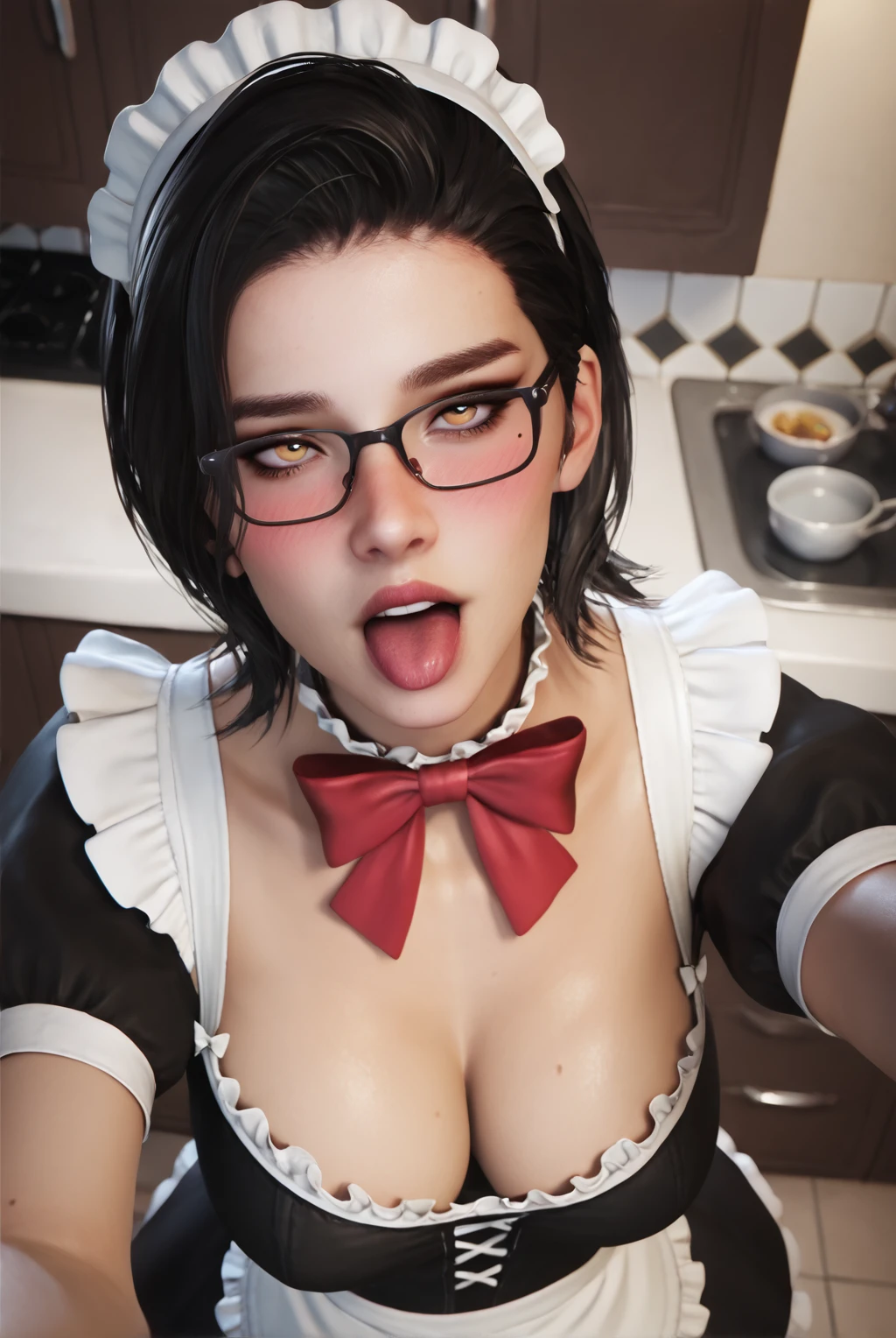 short hair, black hair, amber eyes, mole under eye, makeup