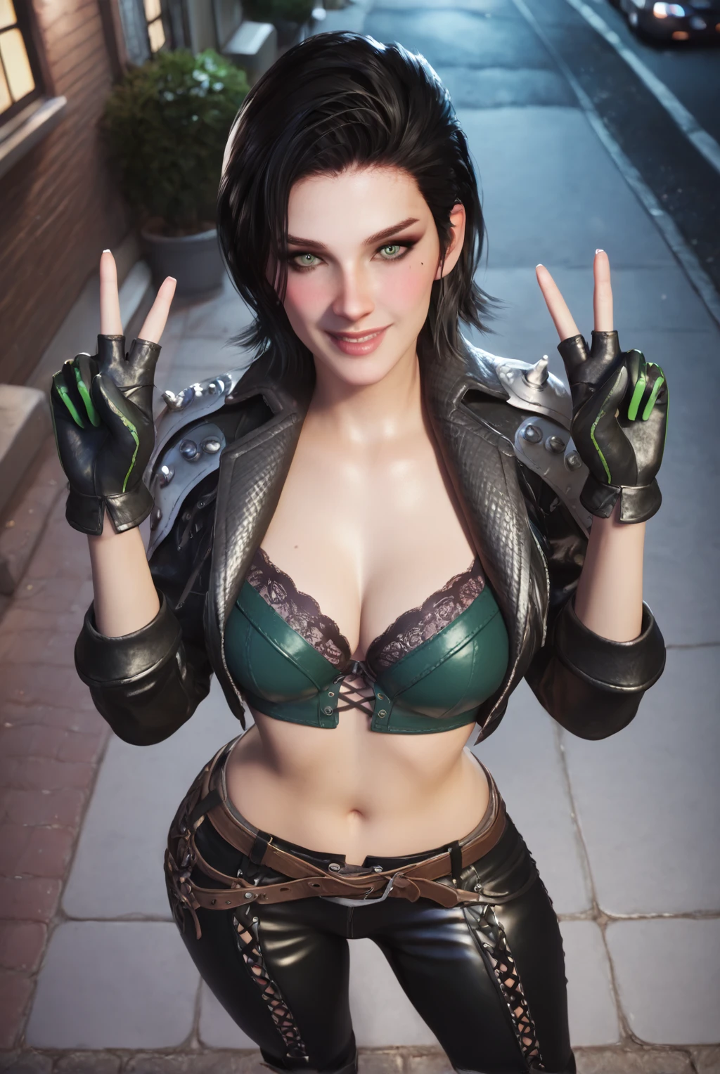 bra, open clothes, belt, midriff, armor, open jacket, black jacket, black pants, cropped jacket, cross-laced clothes, leather jacket, leather pants, gloves