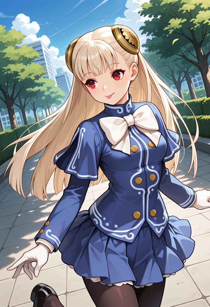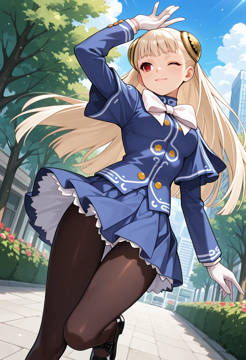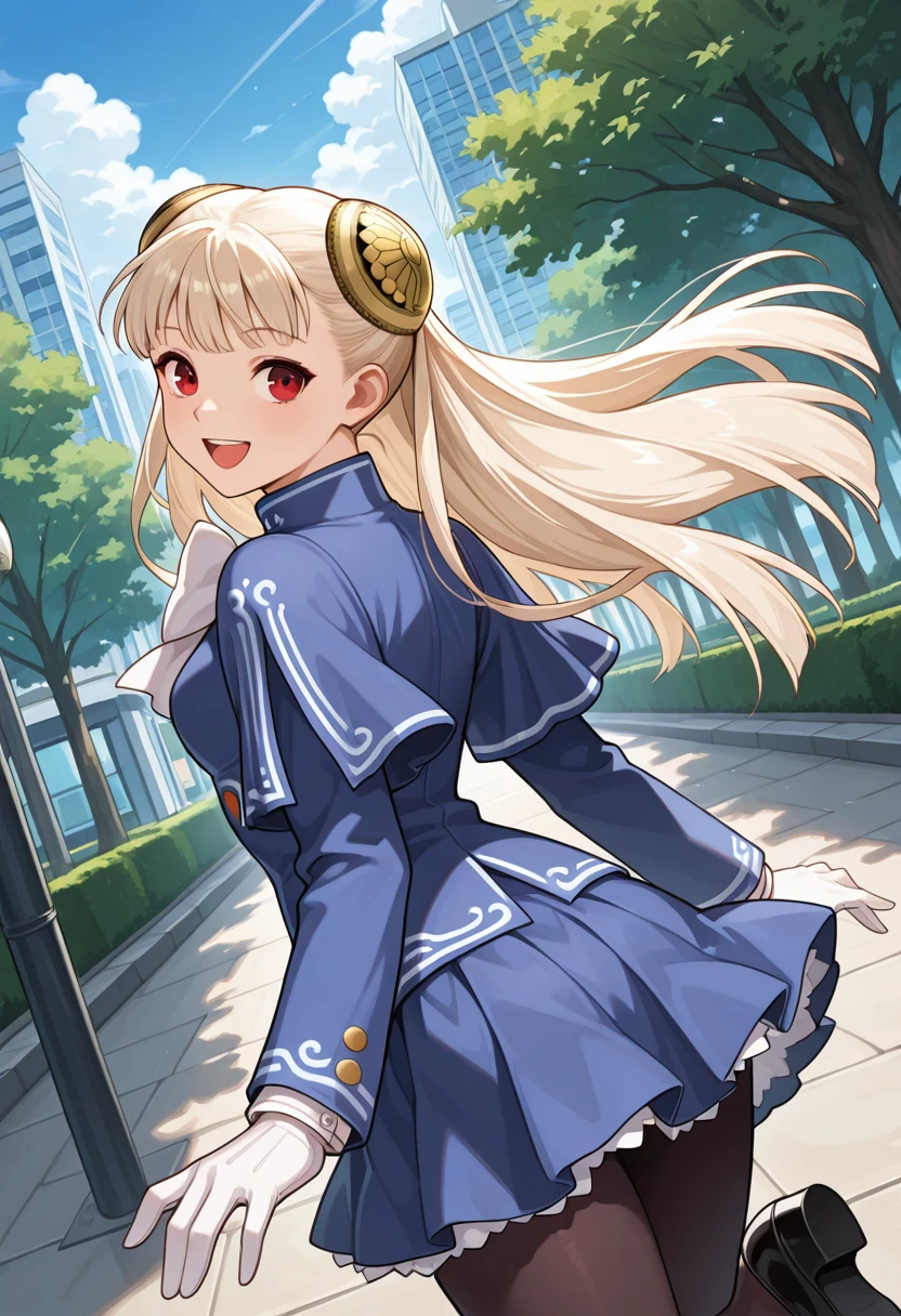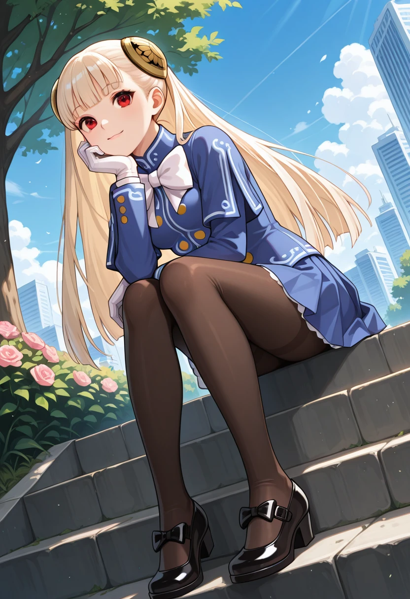 ingrid \(capcom\), platinum hair, blonde hair, long hair, blunt bangs, hair ornament, red eyes, blue dress, long sleeves, blue jacket, blue skirt, pleated skirt, white ribbon, white gloves, pantyhose,black footwear, footwear ribbon, mary janes, Description