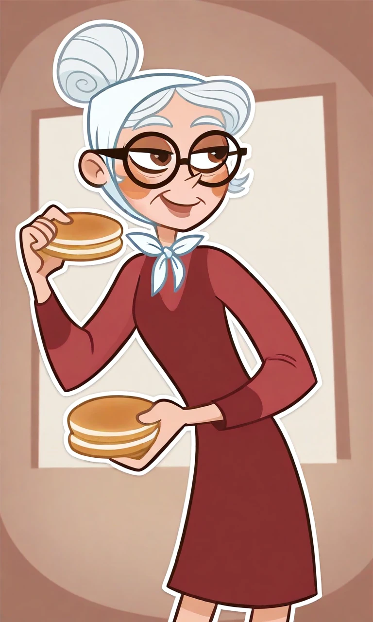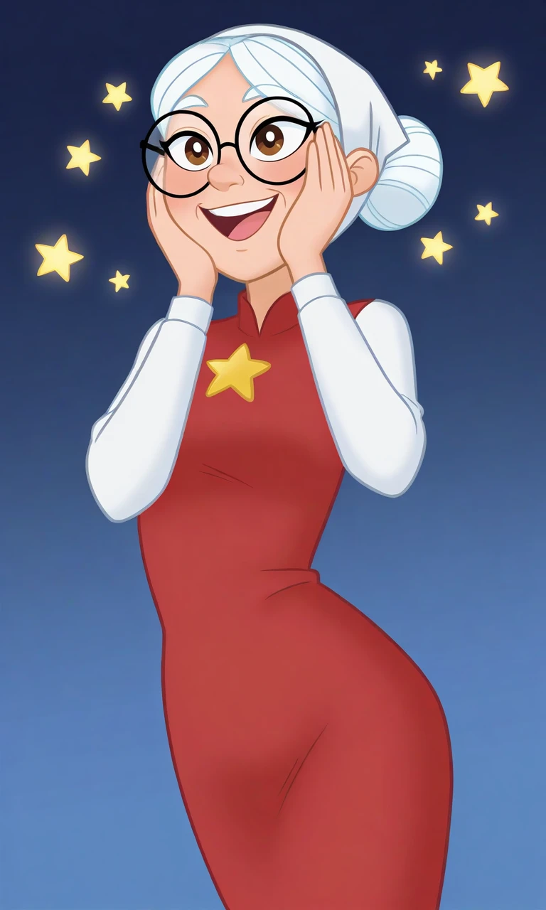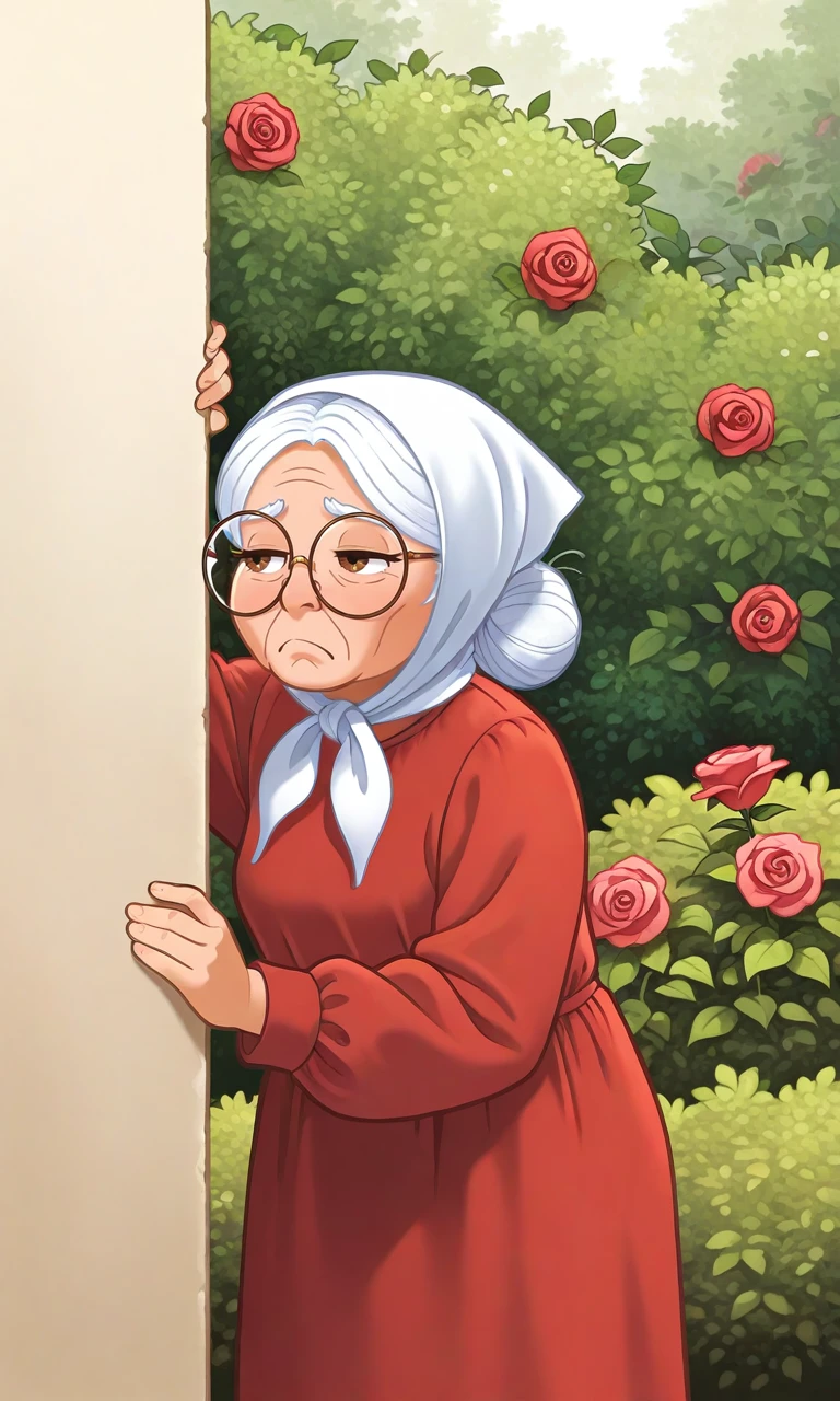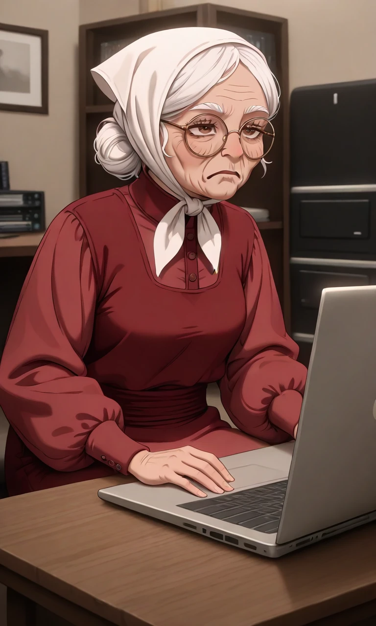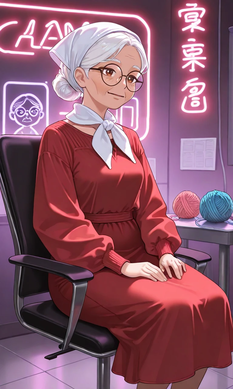 1girl,old woman,white headscarf,white hair,single hair bun,round eyewear,glasses,brown eyes,red dress,long sleeves