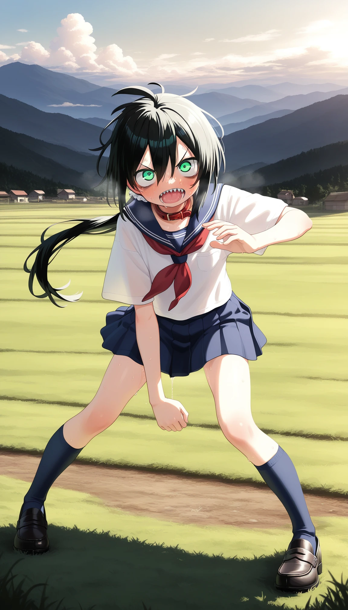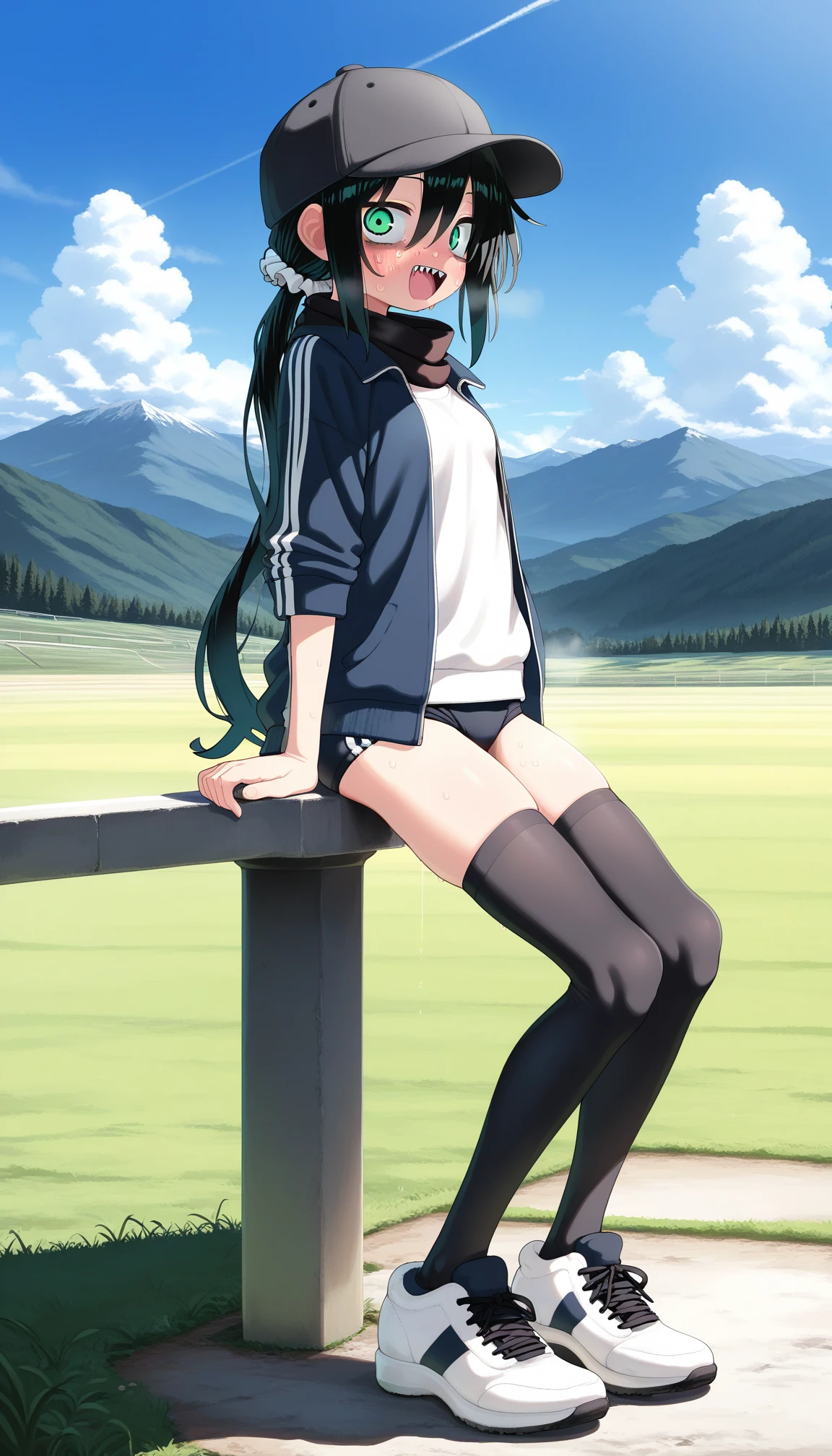 1girl, dycz, black hair, green eyes, low ponytail, white scrunchie,