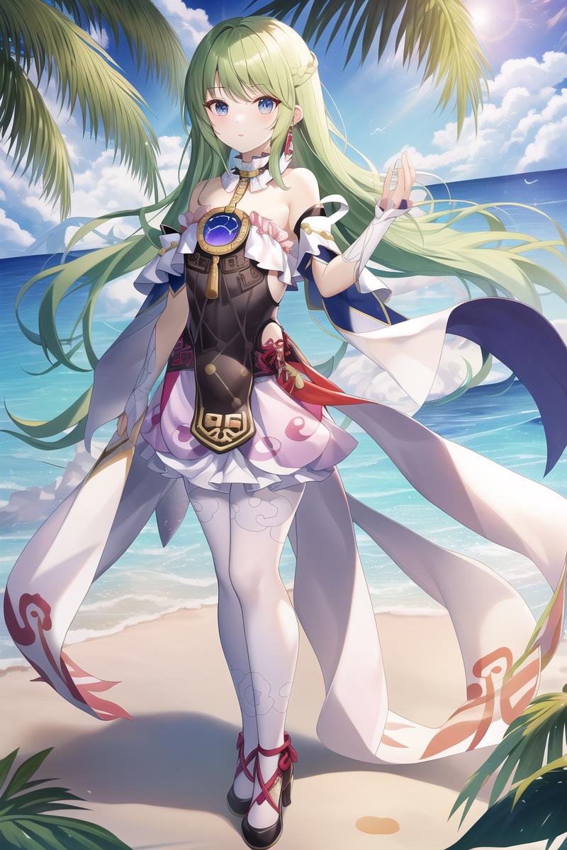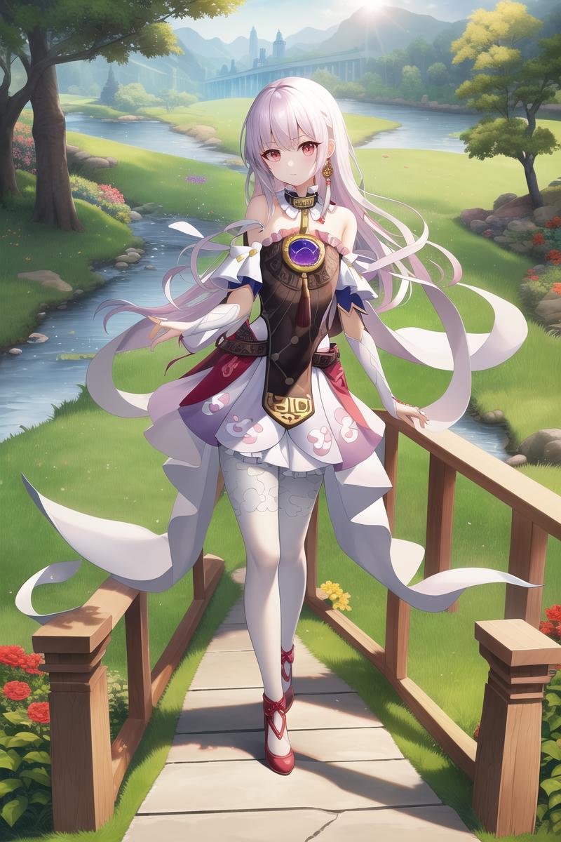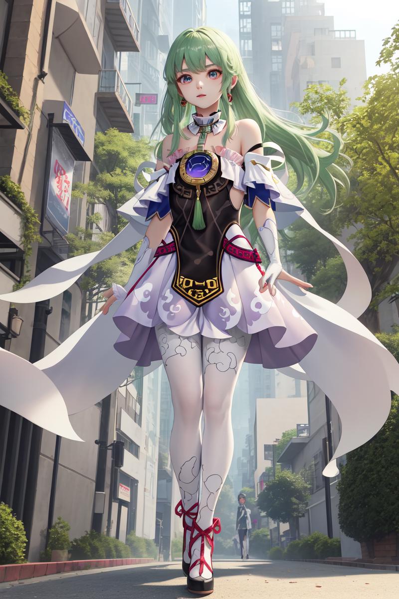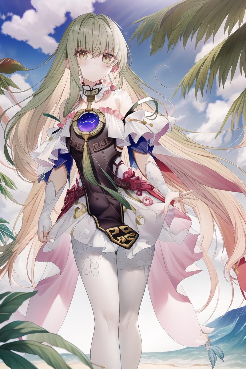 触发词: 1girl,solo,white legwear,dress,detached sleeves,pantyhose,white dress,bare shoulders,china clothes,choker,high heels,jewelry,white gloves,neck ring,tassel,frills