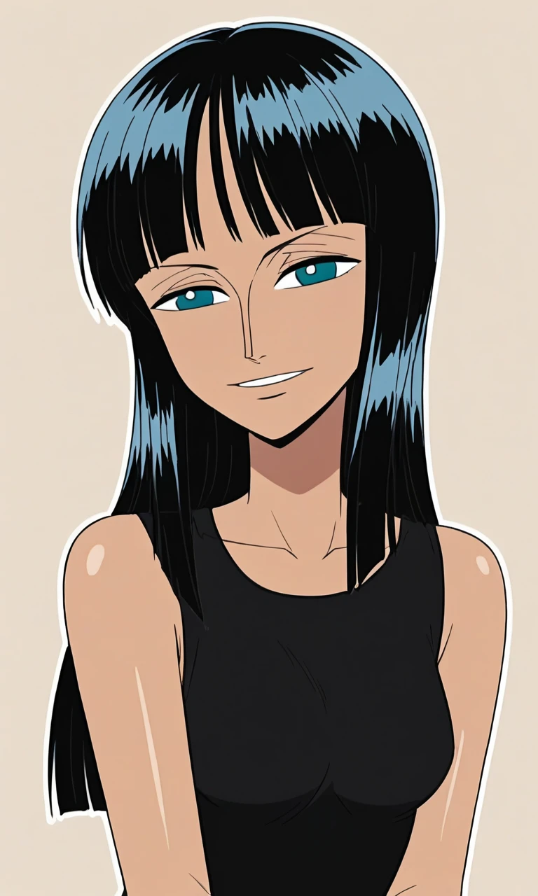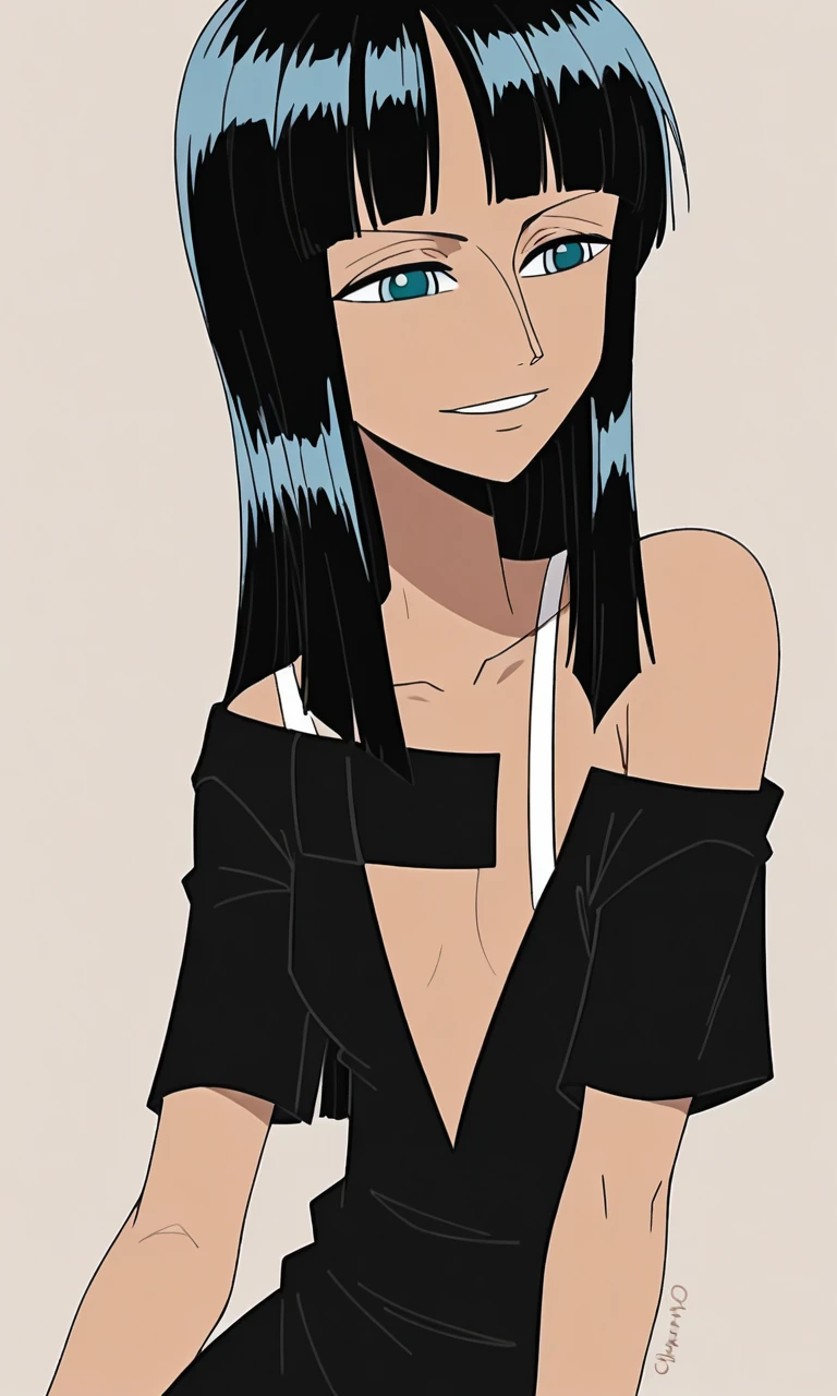 Example Prompt: <lora:nicorobinpre:1>,draw an attractive woman with black longbob hair wearing a black dress, skinny, blunt edges, blunt ends, tan, 1girl,solo