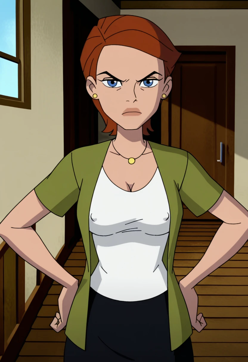 Prompt: natalieTennysonUAF, 1girl, solo, full body, blue eyes, short hair, brown hair, yellow earrings, yellow necklace, green cardigan, white undershirt, long skirt, black skirt, black footwear, mature female, dark-skinned female