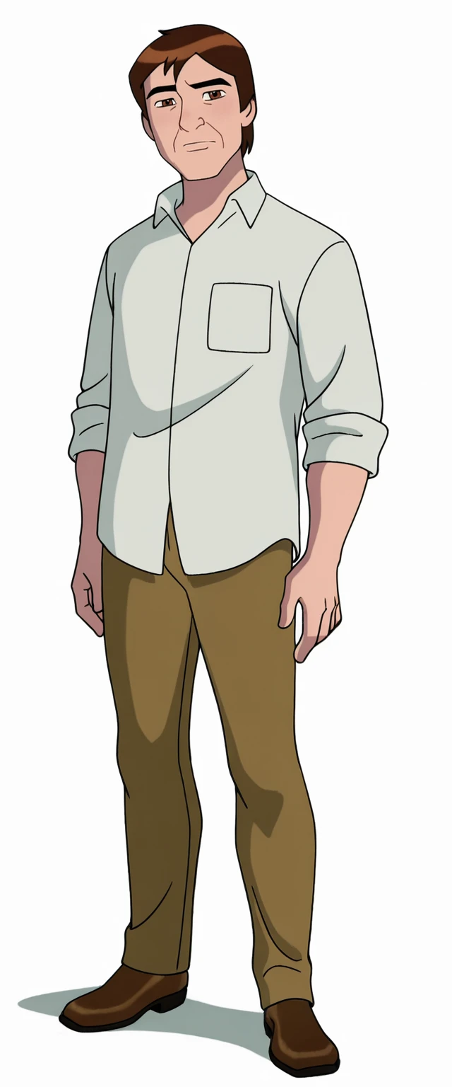 Prompt: carlTennysonUAF, 1boy, solo, full body, brown eyes, short hair, brown hair, white shirt, collared shirt, pocket, brown pants, brown footwear, mature male, dark skin