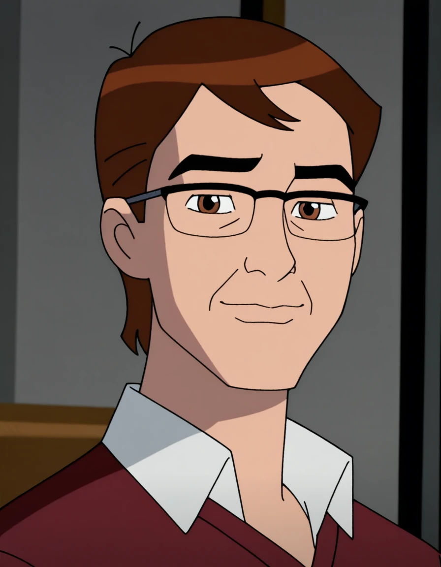 Prompt: frankTennysonUAF, 1boy, solo, full body, brown eyes, glasses, short hair, brown hair, red sweater, white shirt, collared shirt, brown pants, shoes, mature male, dark skin