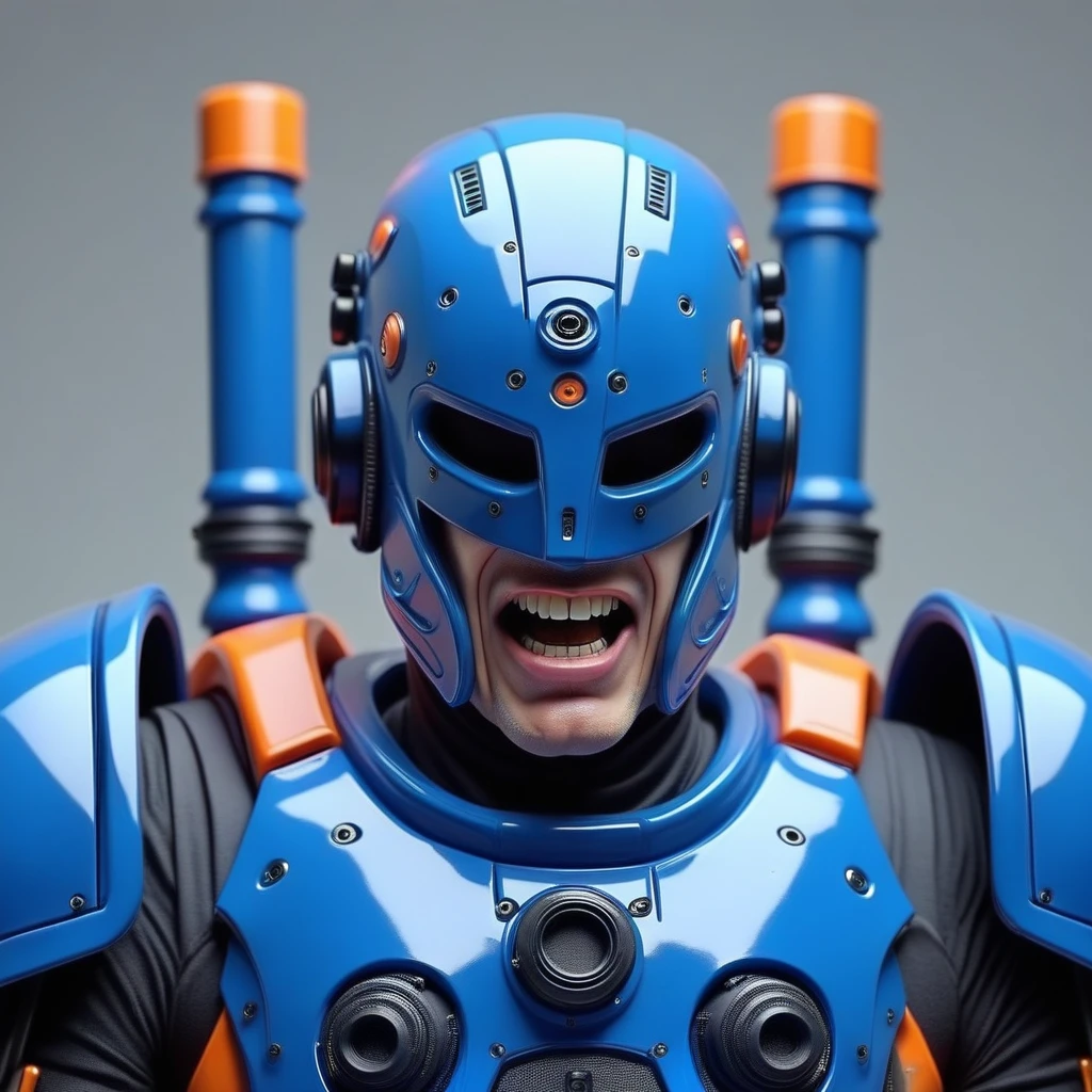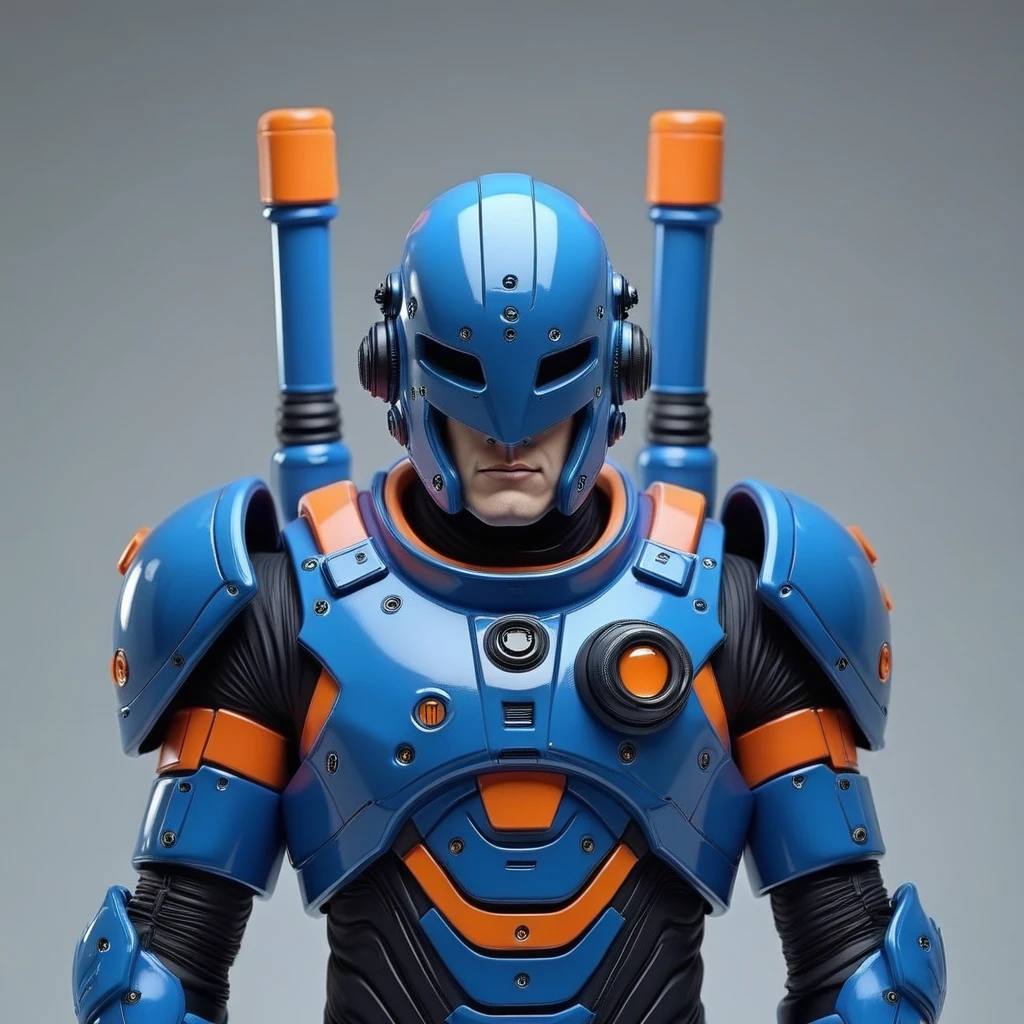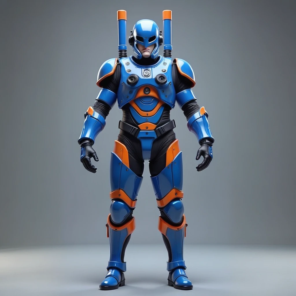 blue armor, orange armor accents, glossy armor surface, armored chestplate, circular chest detail, symmetrical chest design, black bodysuit under armor, mechanical shoulder pads, high-tech gauntlets, segmented arm armor, reinforced leg armor, black gloves, orange shoulder vents, dual shoulder cannons, upward-facing cannons, orange cannon tips, futuristic helmet, open lower face helmet, exposed mouth and chin, visible lips, strong jawline, neck guard, partial faceplate, closed visor with cutout, black visor, reinforced knee plates, belt with orange elements, sci-fi armor design, detailed panel lines, modular armor structure