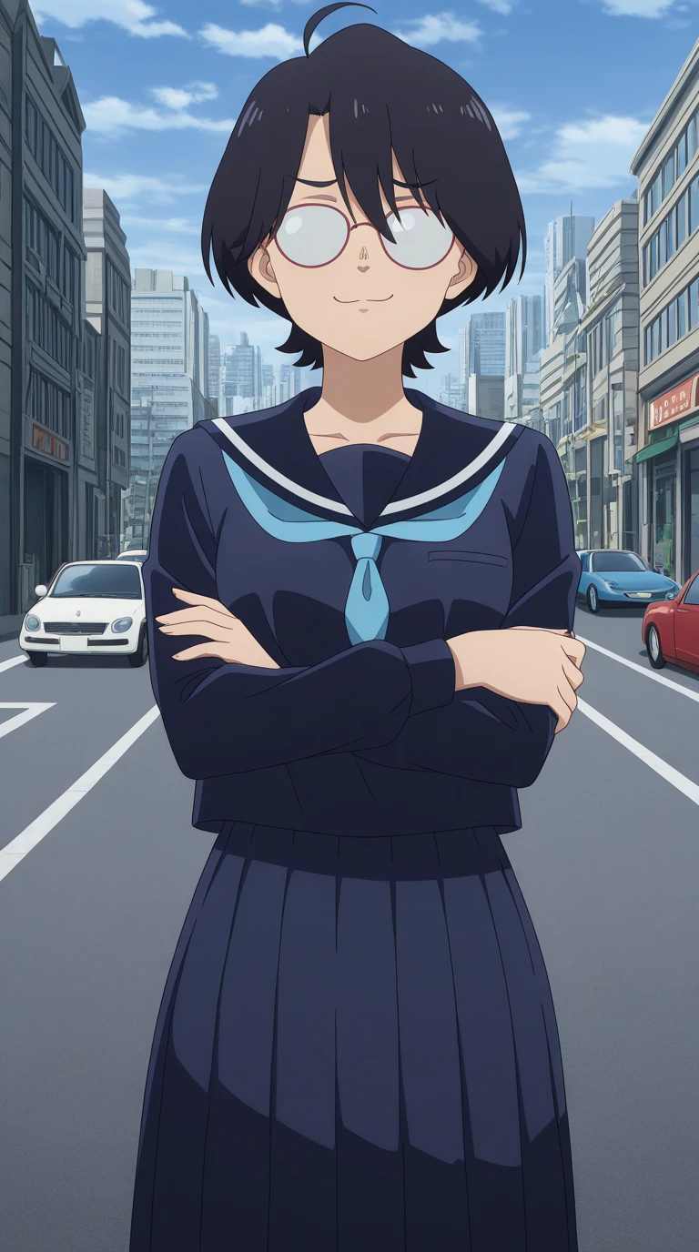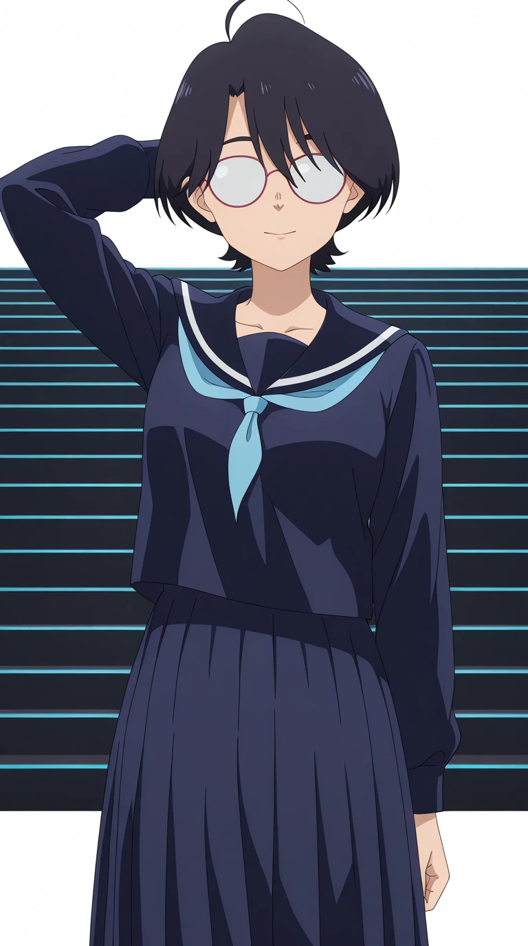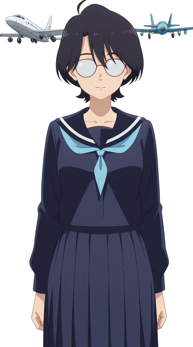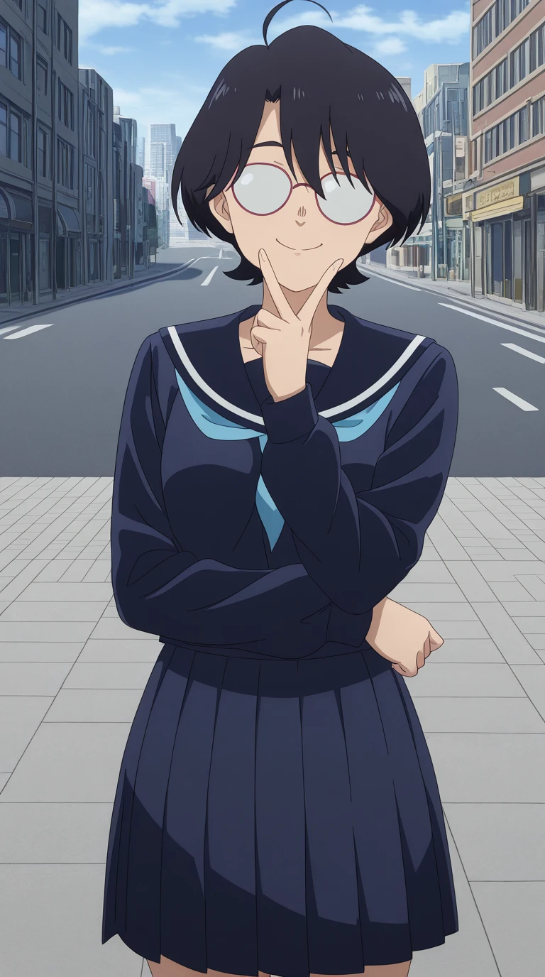 fumetsunoanatae hanna, short hair, black hair, ahoge, glasses, opaque glasses, mature female, small breasts, anime screencap
