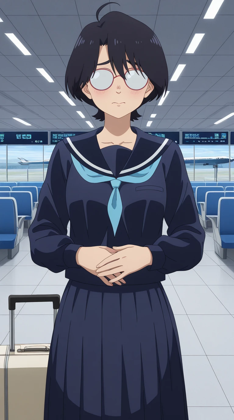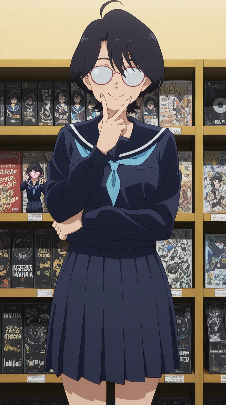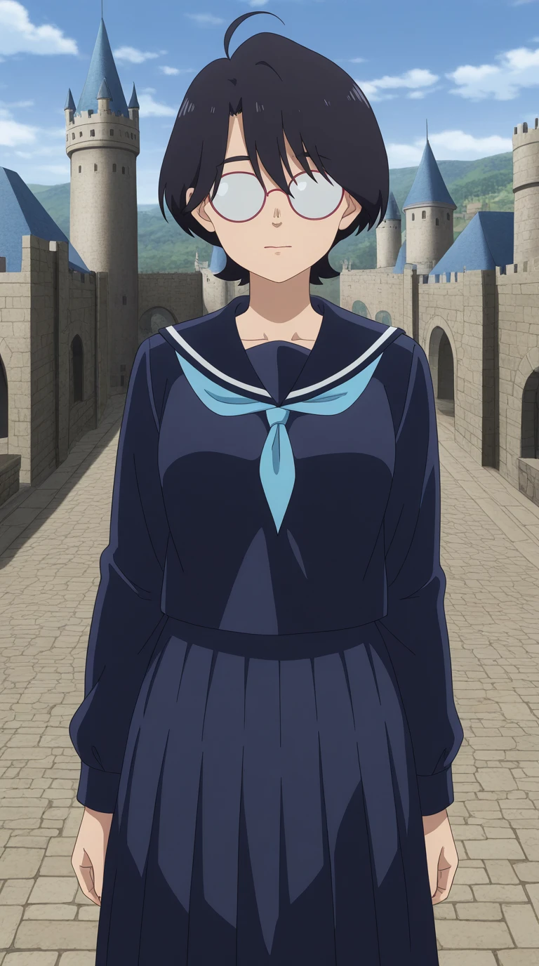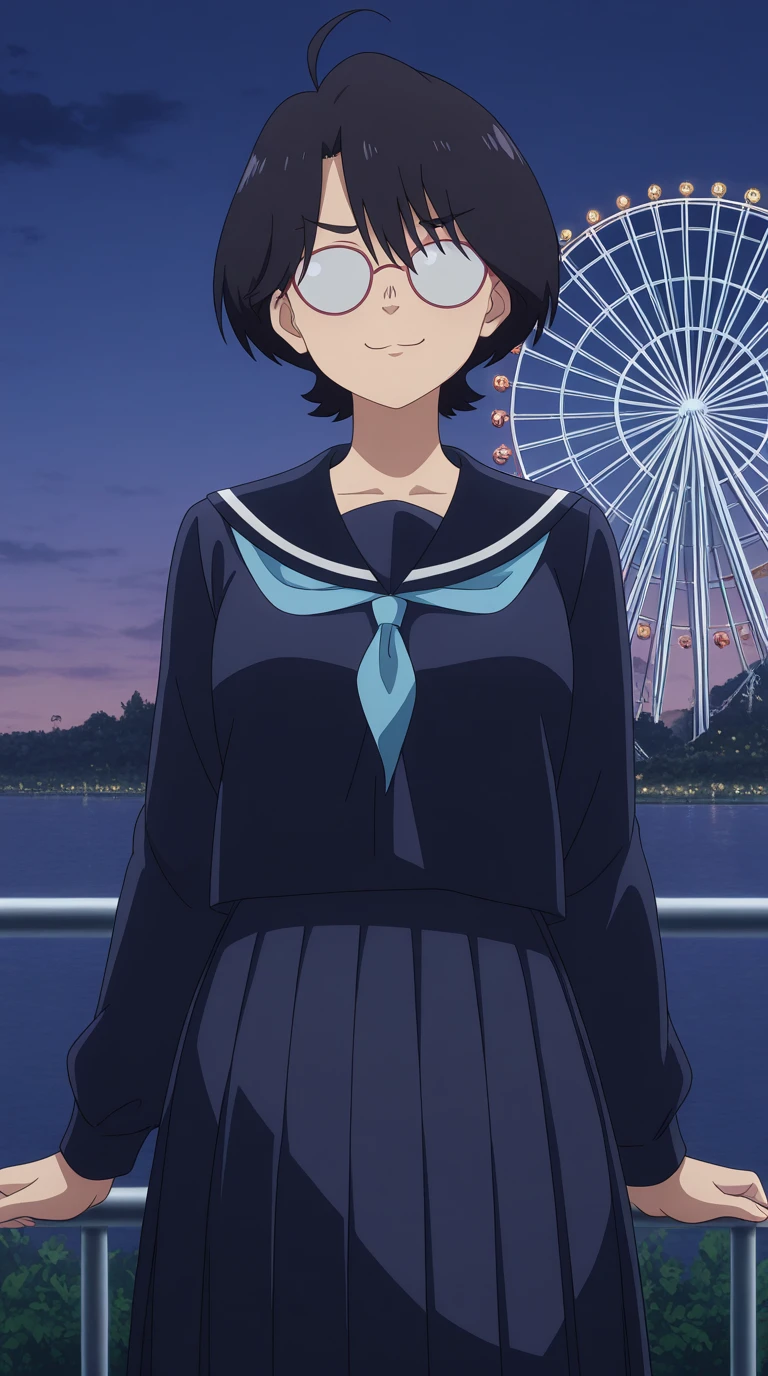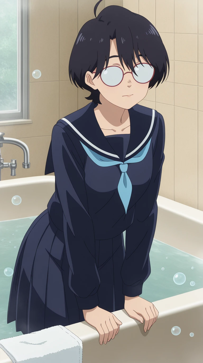 fumetsunoanatae hanna, short hair, black hair, ahoge, glasses, opaque glasses, mature female, small breasts, anime screencap