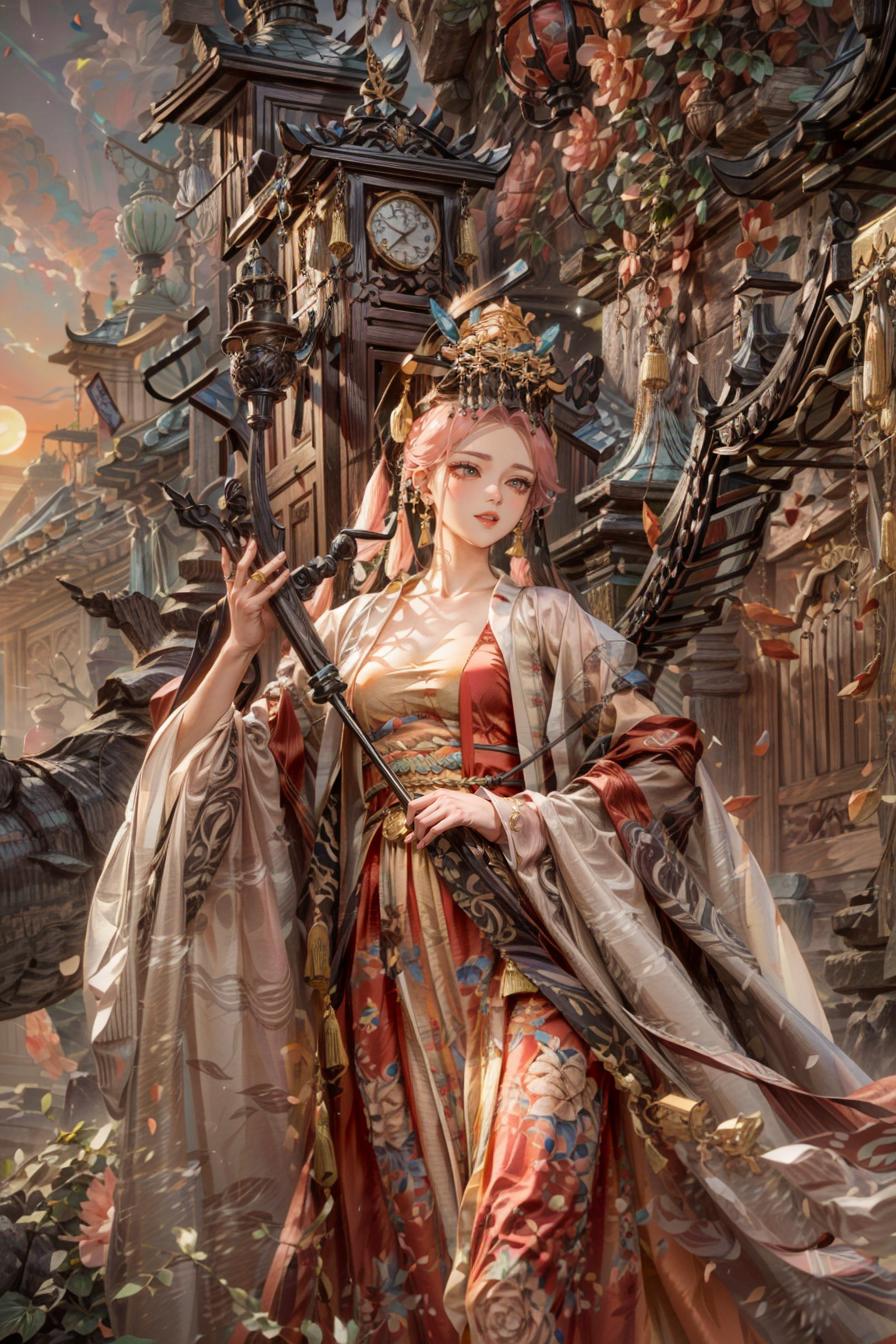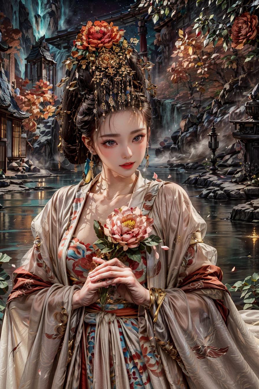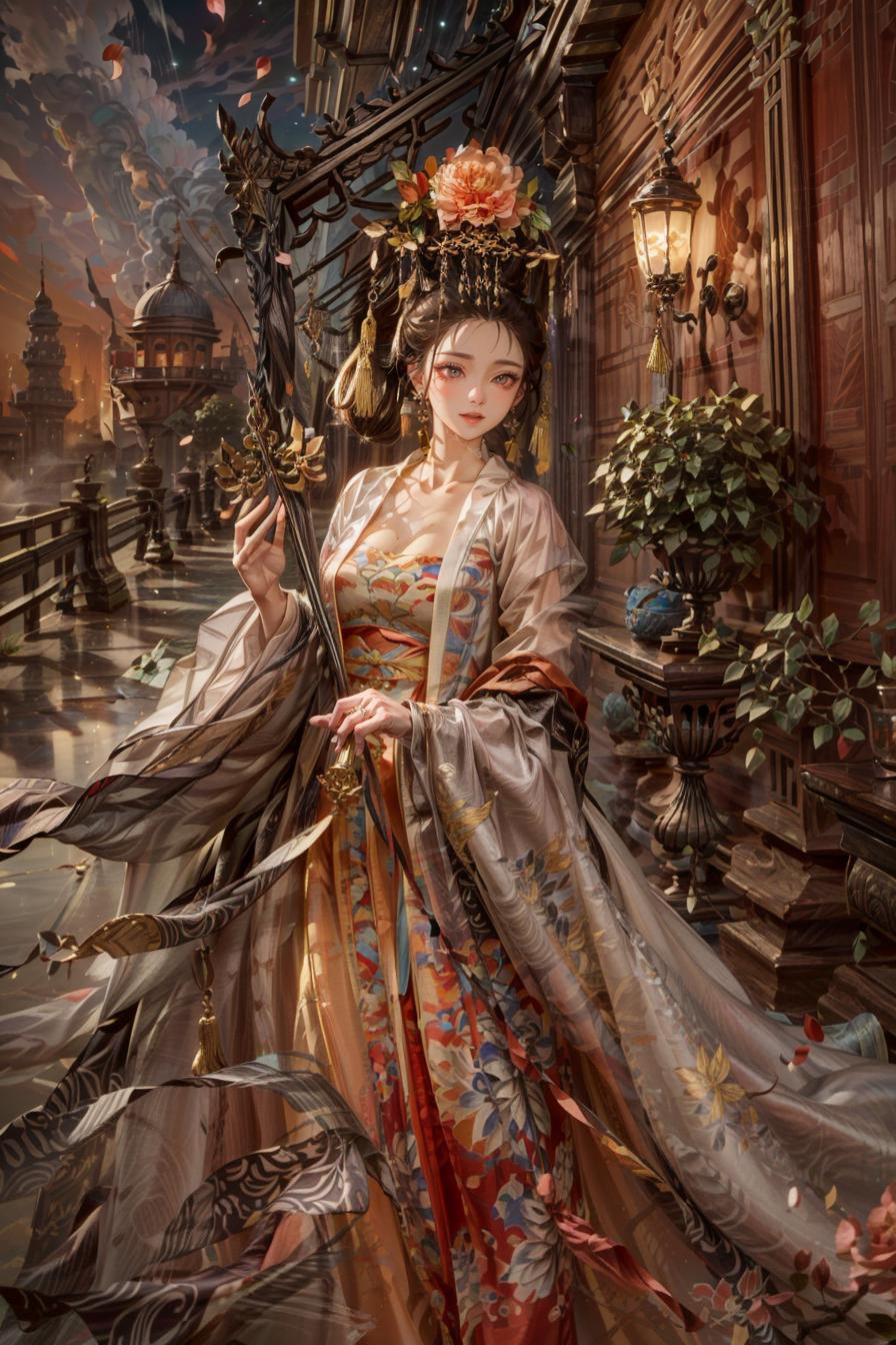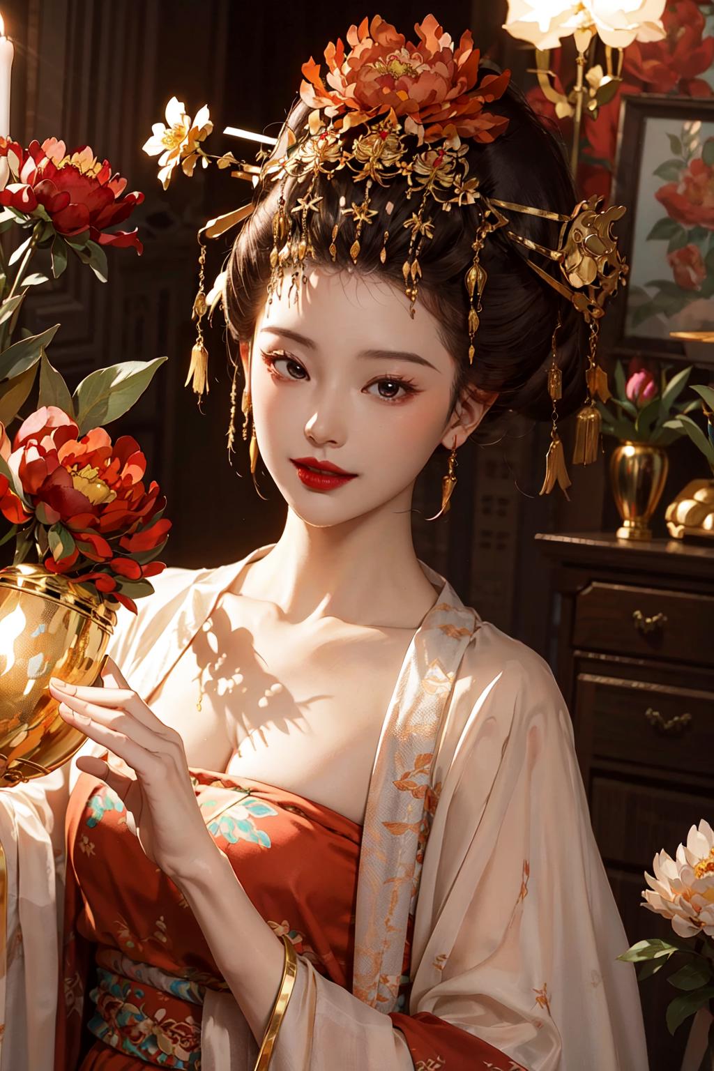 角色身穿唐风汉服襦裙,头戴簪花,手持鲜花(一定情况下也能触发琵琶和扇子)