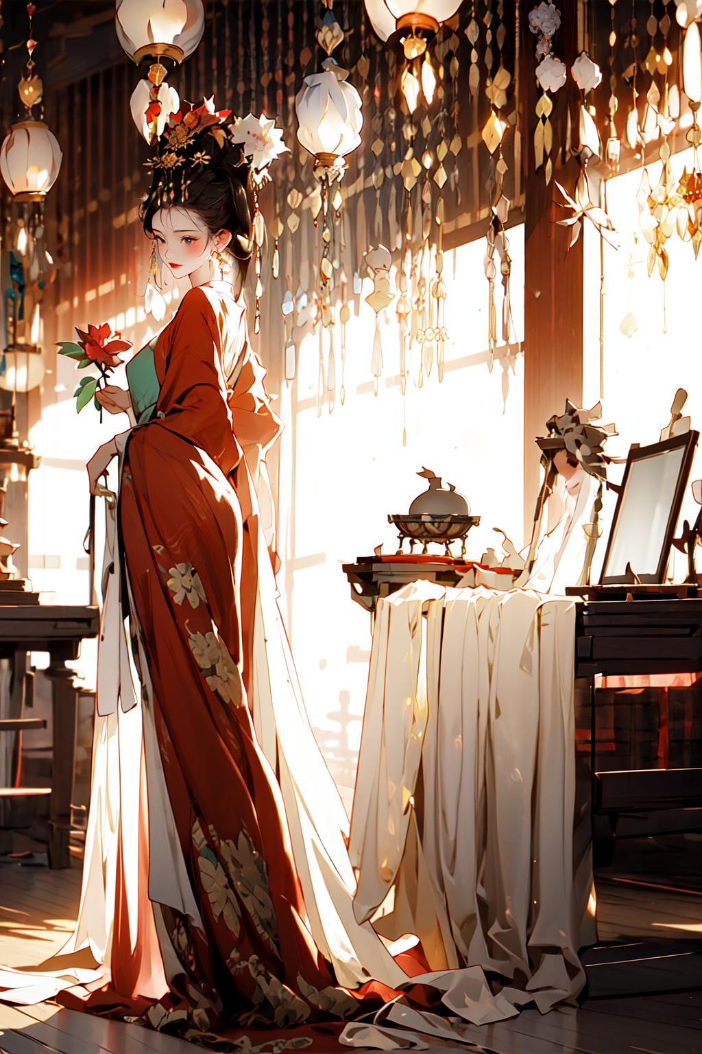 The inspiration of 【Zanhua】 comes from the chinese acient painting "ladies with head-pinned flowers". The character wears a Tang-style Hanfu ruqun, with a hairpin on her head and holding a bouquet of flowers (in some situations, she may also play the pipa or hold a fan).