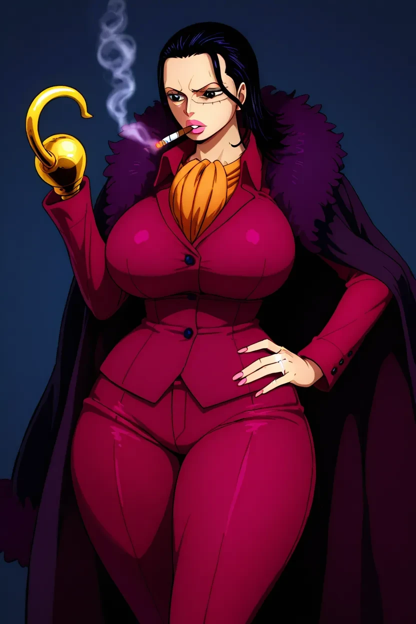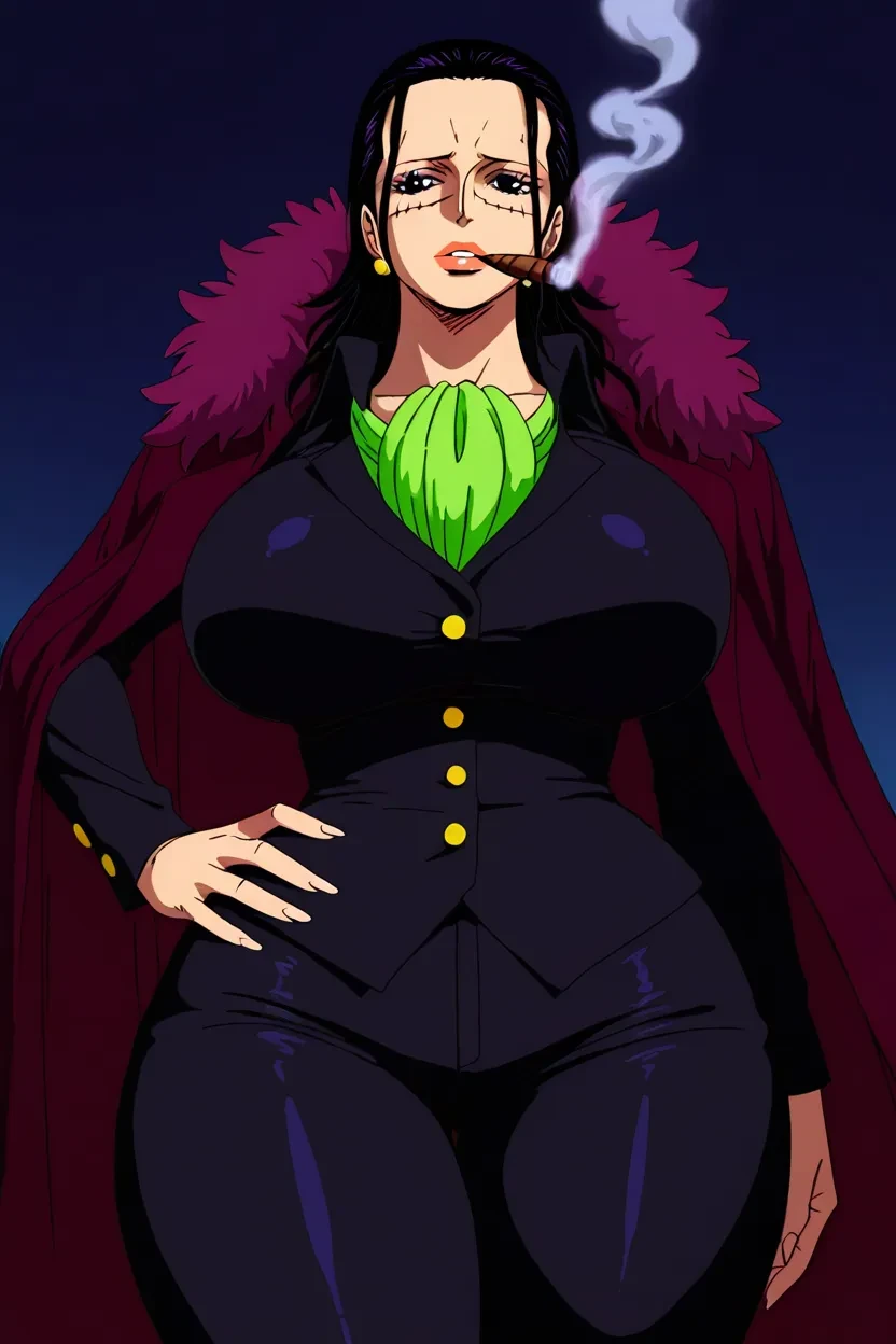 1girl, Crocodile Female (One Piece), black hair, long hair, black eyes, glossy lips, thick lips, massive breasts, curvy, sexy, wide hips, thick thighs, One_Piece_Art_Style, HD, superb Quality, High Resolution