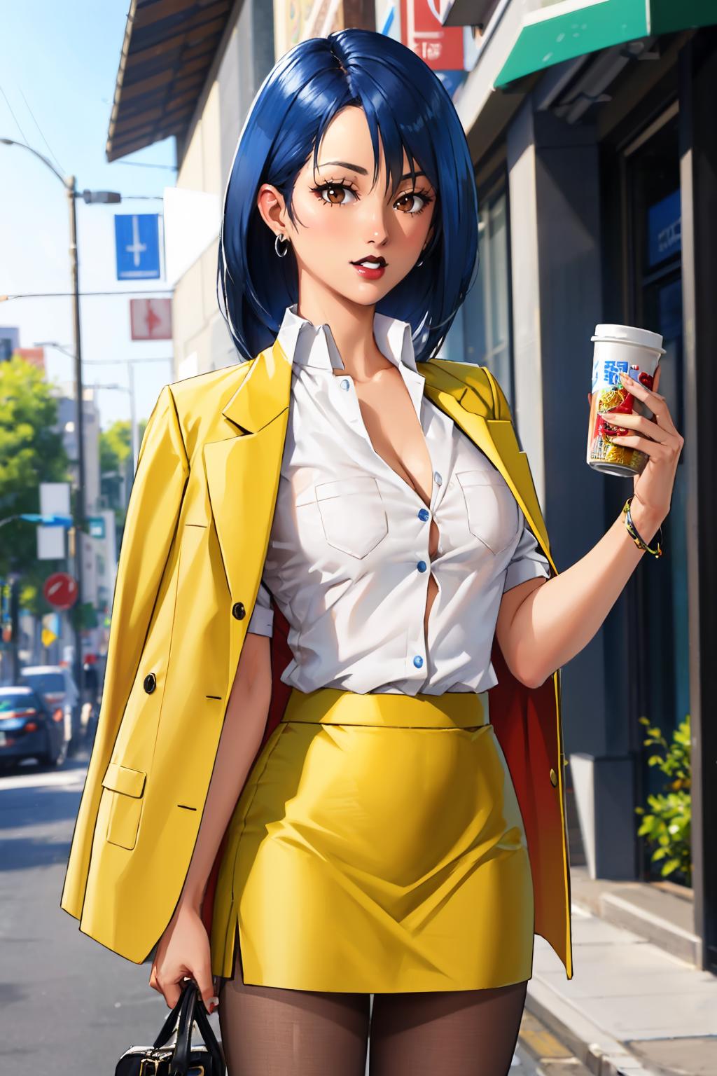 takamipersona, jewelry, earrings, blue hair, yellow skirt, white shirt, long hair, lipstick, pantyhose, jacket on shoulders