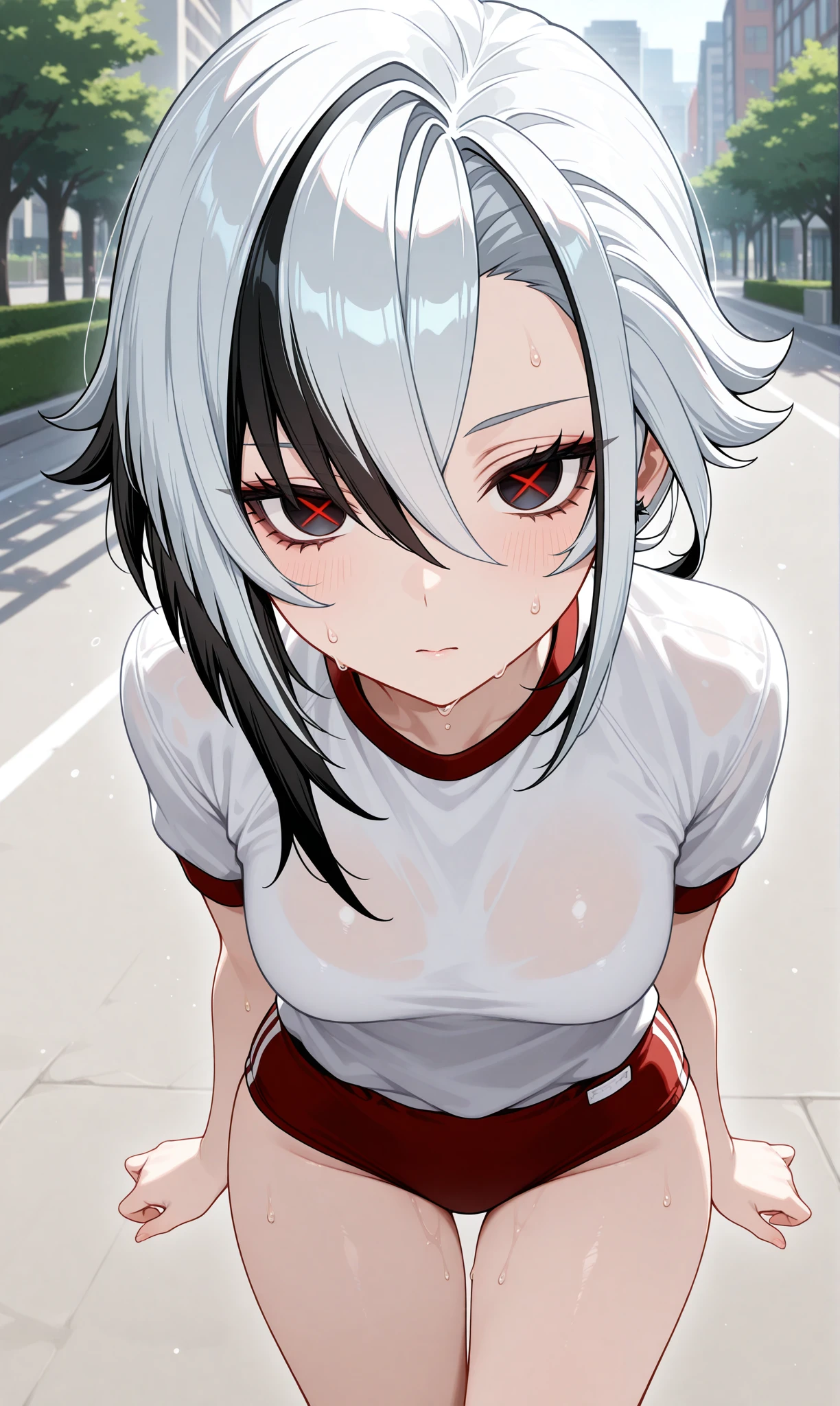 arlecchino (genshin impact), multicolored hair, black hair, bangs, white hair, low ponytail, symbol-shaped pupils, streaked hair, hair between eyes, x-shaped pupils, short hair, black eyes, red pupils, two-tone hair