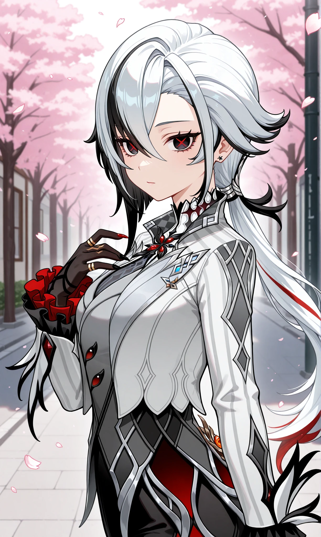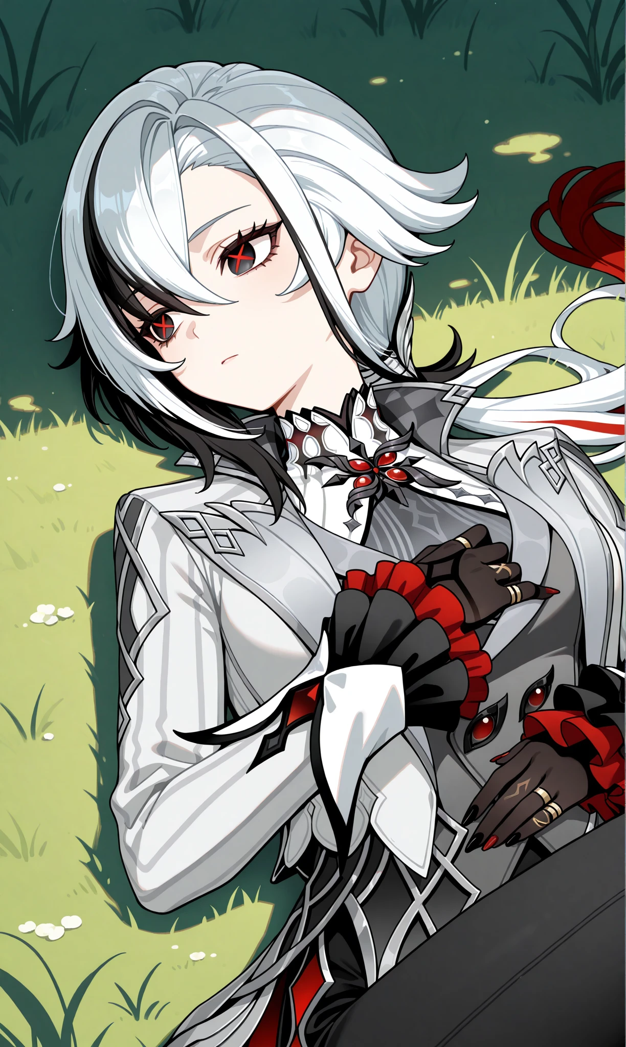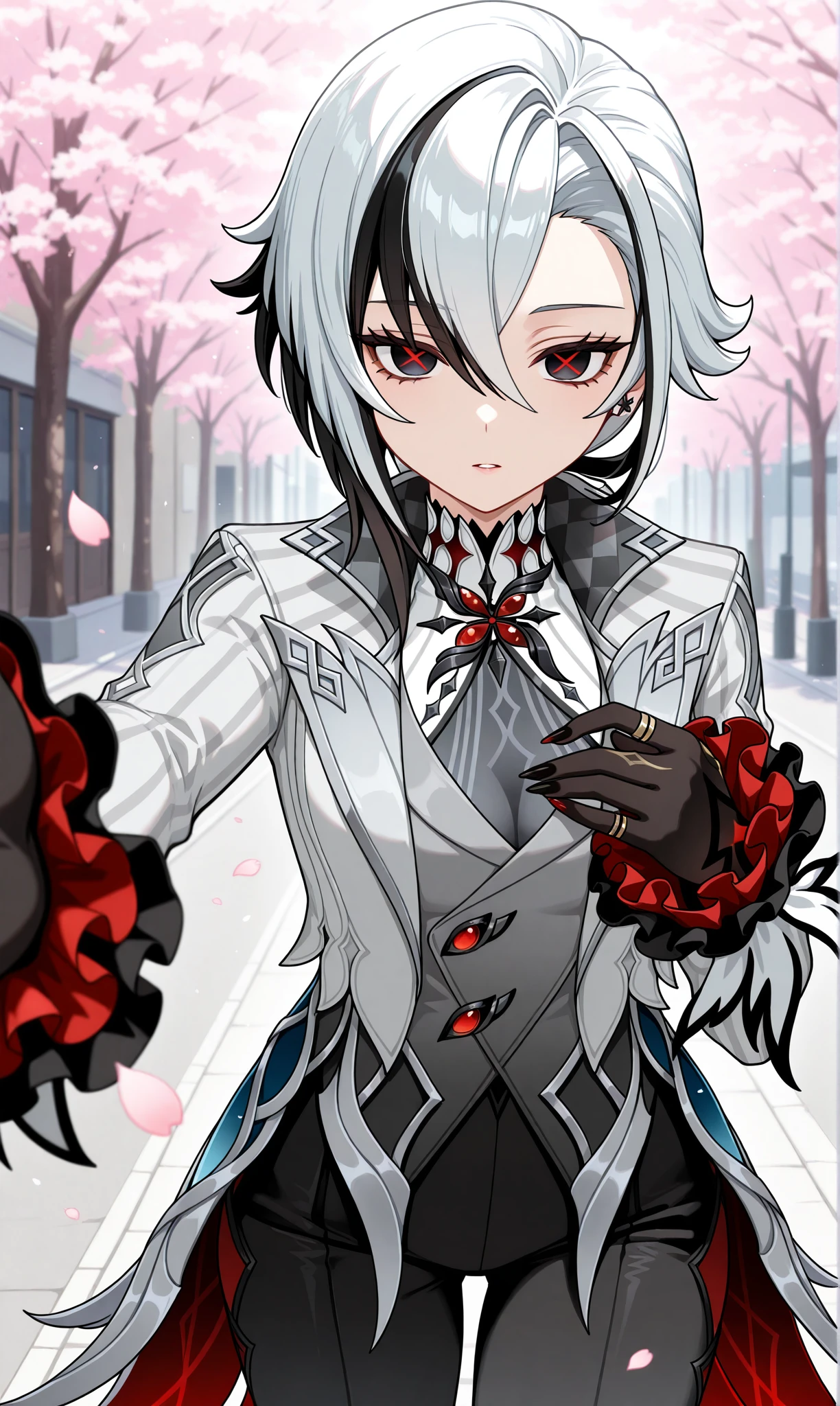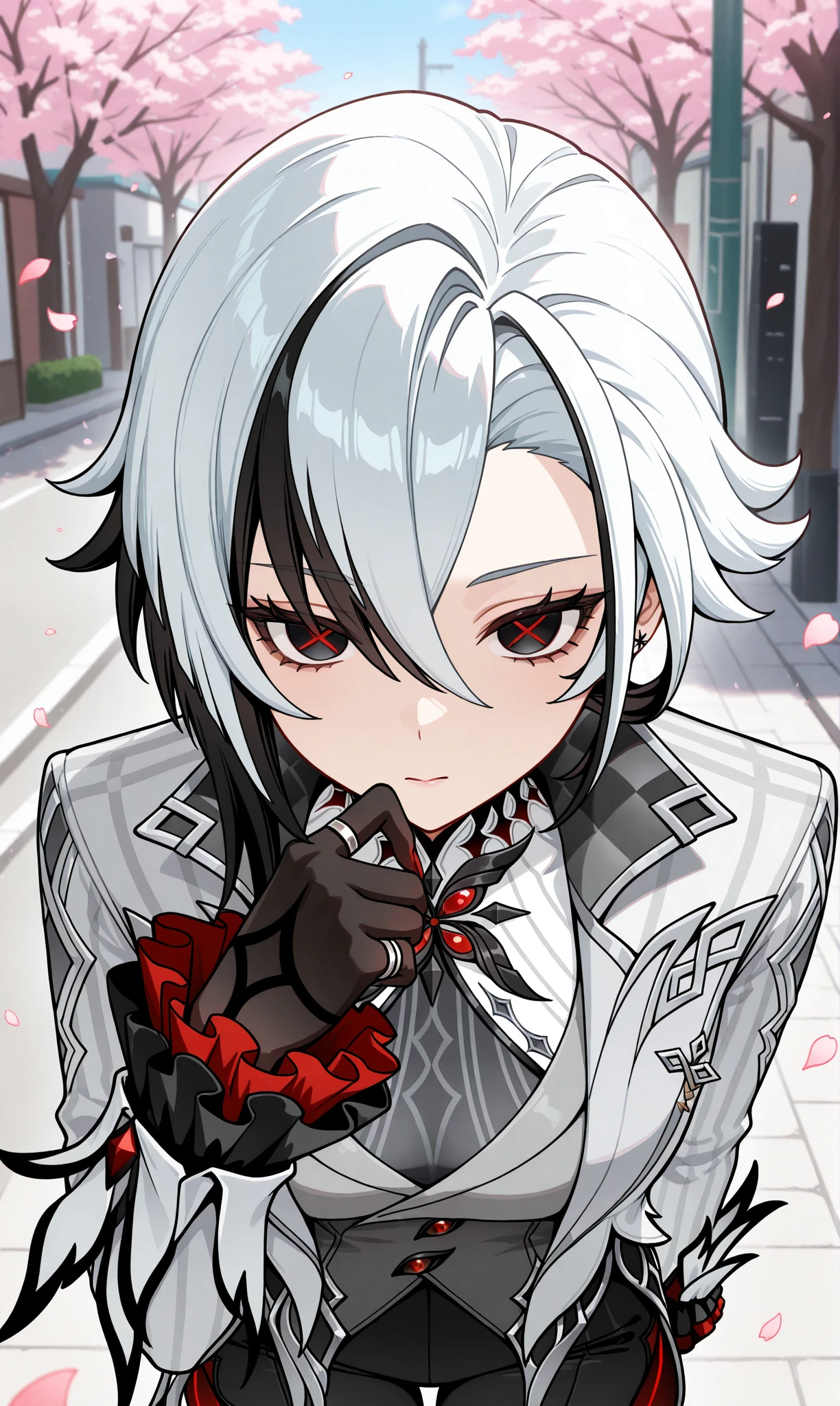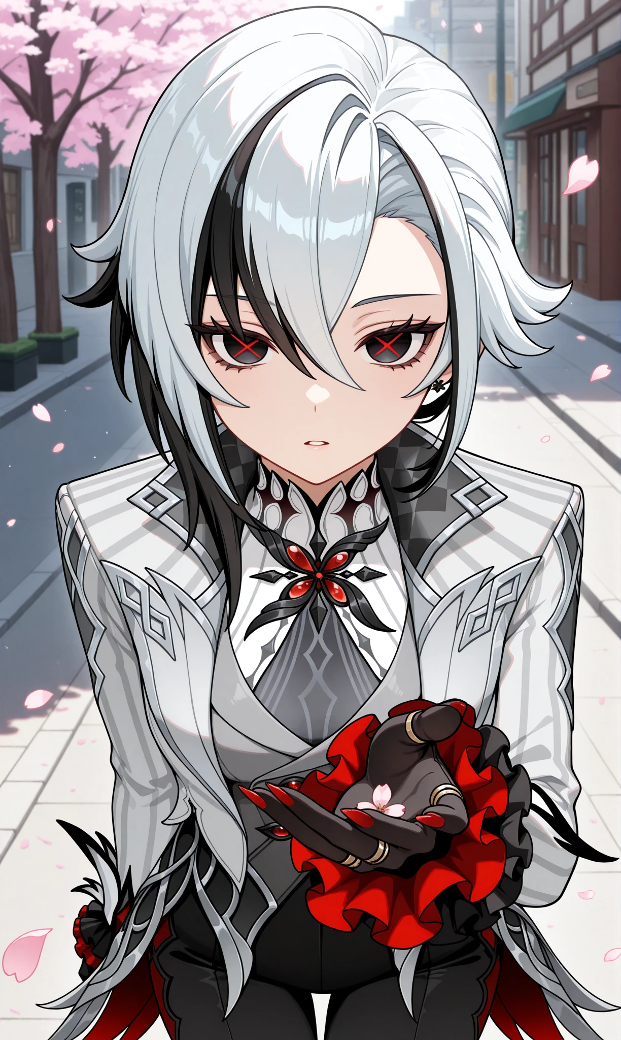 arlecchino (genshin impact), multicolored hair, black hair, bangs, white hair, low ponytail, symbol-shaped pupils, streaked hair, hair between eyes, x-shaped pupils, short hair, black eyes, red pupils, two-tone hair๐ข๐๐๐ณ๐ถ๐: