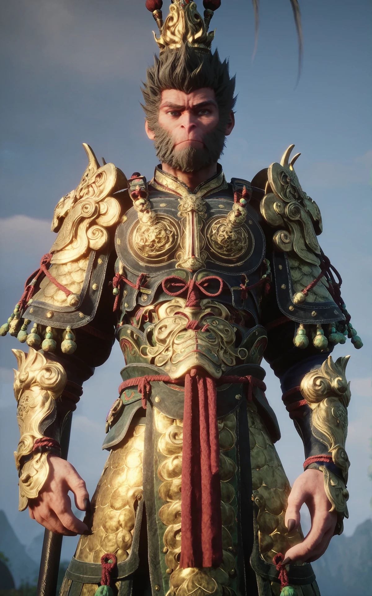 heishenhua artist style, wukong, dashen, golden armor, 1boy, male focus, beard, facial hair, armor, weapon,