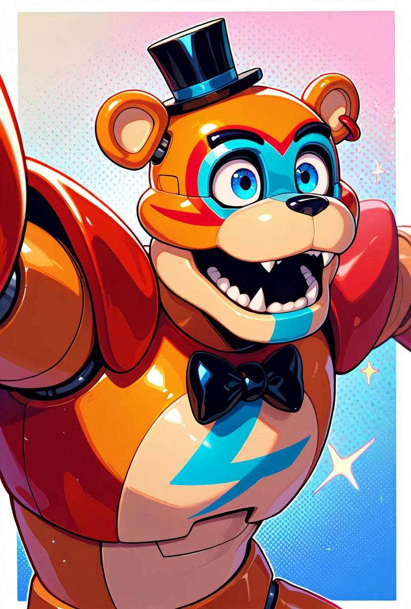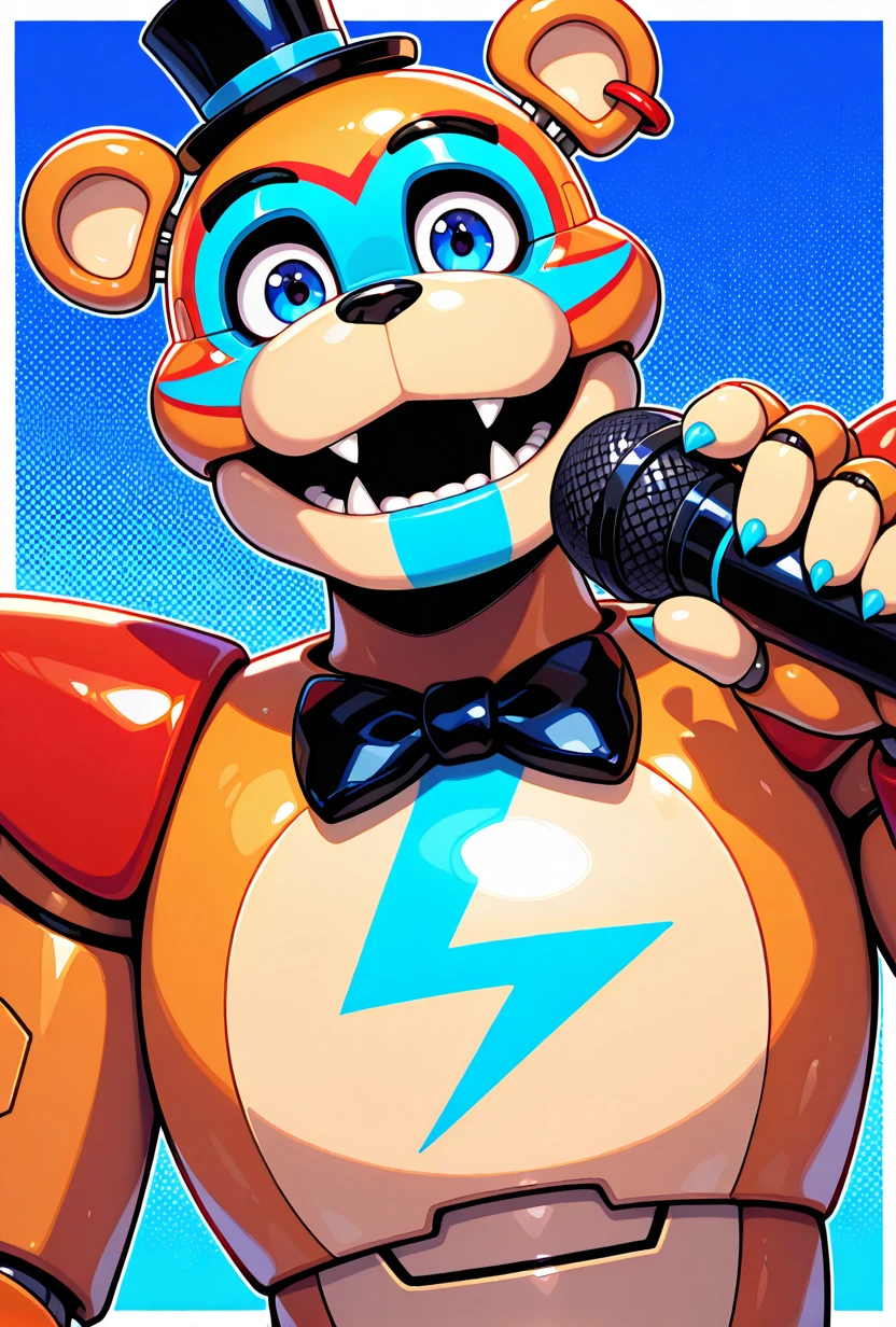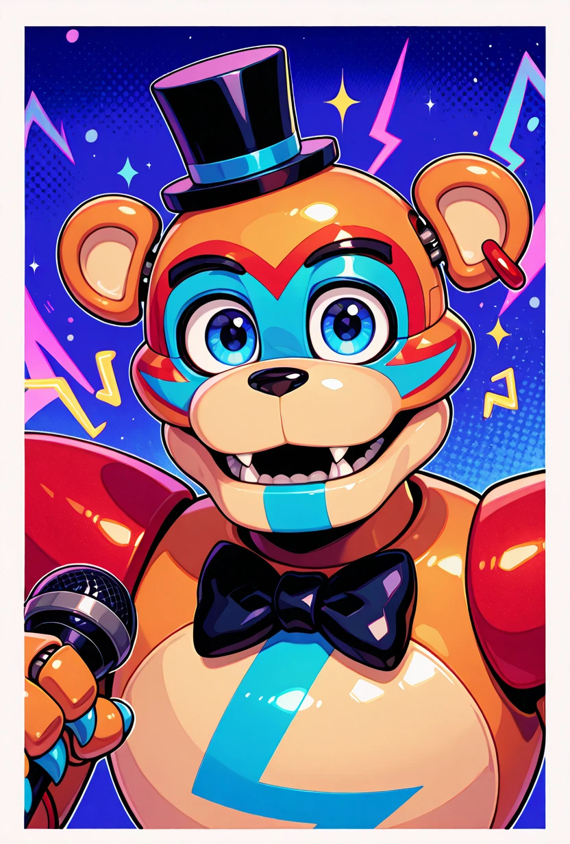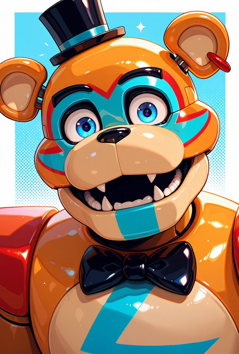 glamfred, male focus, bear ears, black mini top hat,, robot, black bowtie, blue eyes, fangs, wide jaw,