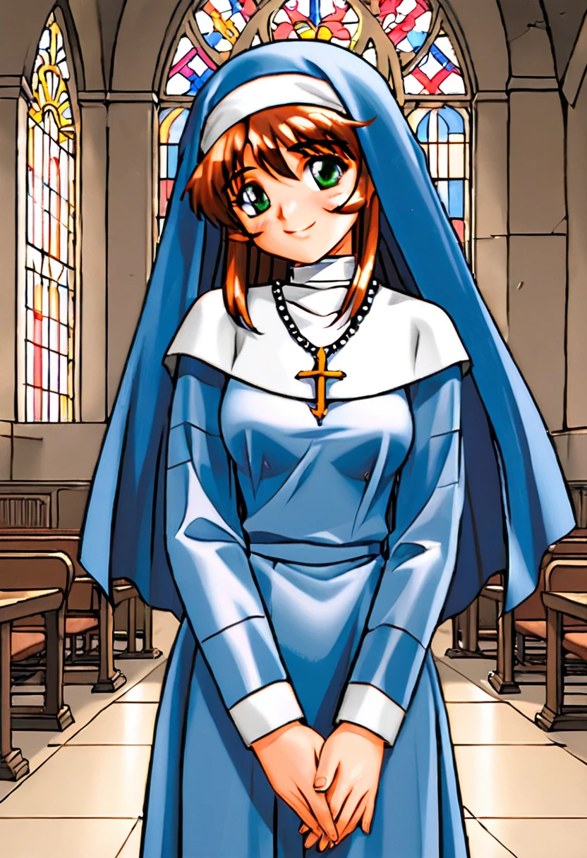 nun, blue habit, blue veil, cross necklace, long sleeves