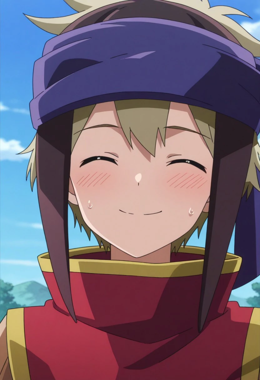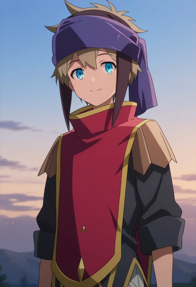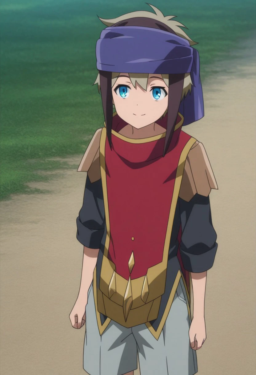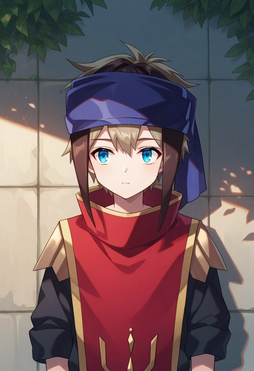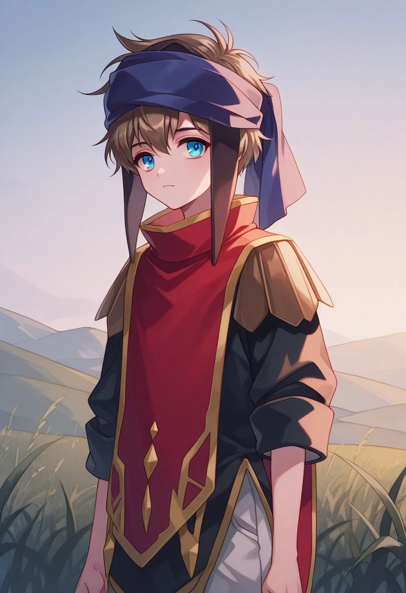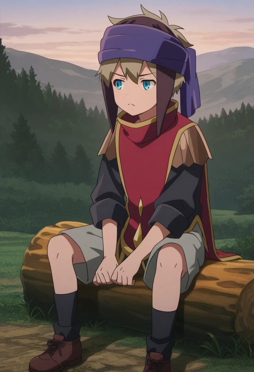 yuumc, 1boy, male focus, solo, blue eyes, brown hair, headband, blue headband, lappet, shirt, black shirt, sleeves rolled up, cape, red cape, shorts, grey shorts, socks, black socks, shoes, brown footwear,