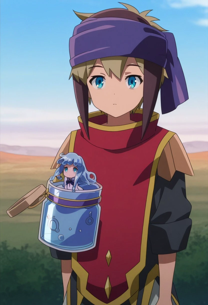 EXTRA: 1girl, blue hair, slime girl, monster girl, in container, minigirl,