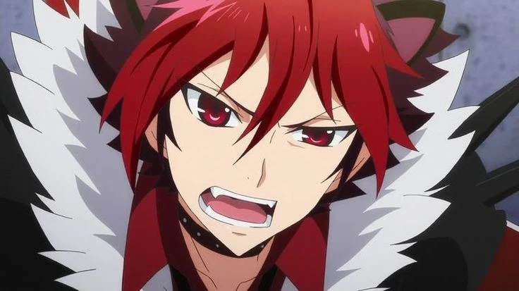 Crow, two-tone hair, red hair, ahoge, animal ears, red eyes, neck collar, black open cropped jacket, long sleeves, black shoulder spikes, white fur trim hoodie, red collared undershirt, long back hem, ripped hem, black necktie, red arm belts, black fingerless gloves, double studded belts, black pants, red thigh belts, black pointed high heel shoes, black tail, red electric guitar