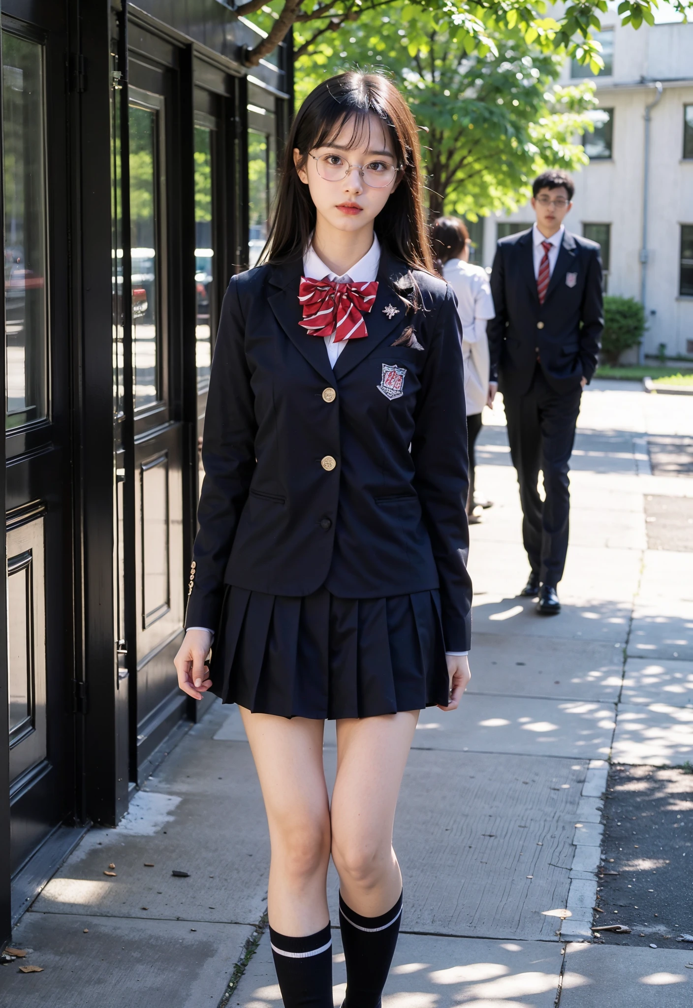 Trigger words: (uniform),long sleeves,black suit,shirt,red bow,pleated shirt,