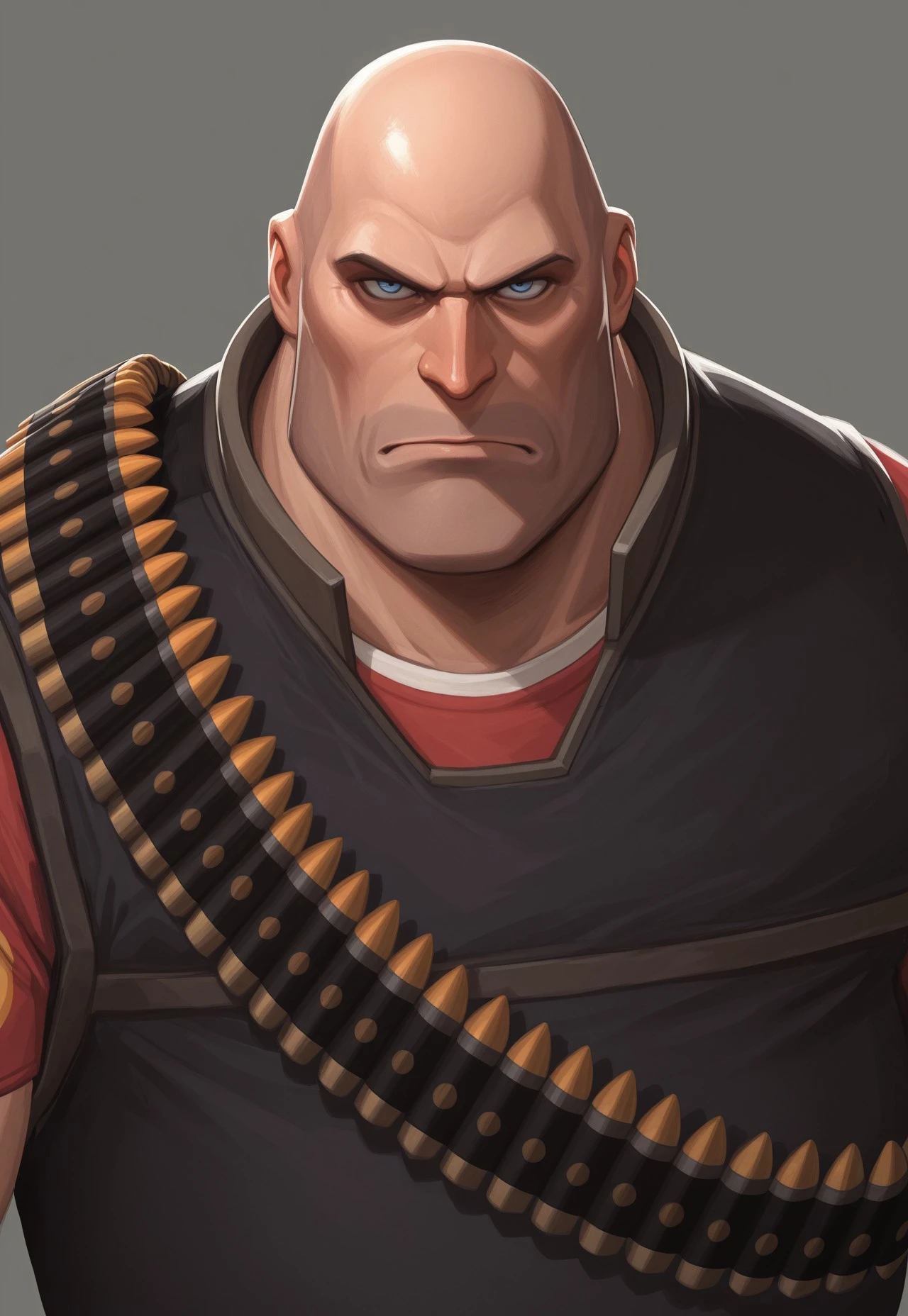 heavy (tf2), mature man, bald, facial hair, blue eyes, muscular, fat man, red shirt, black vest, bandolier, fingerless gloves, belt, belt pouch, brown pants, black shoes,