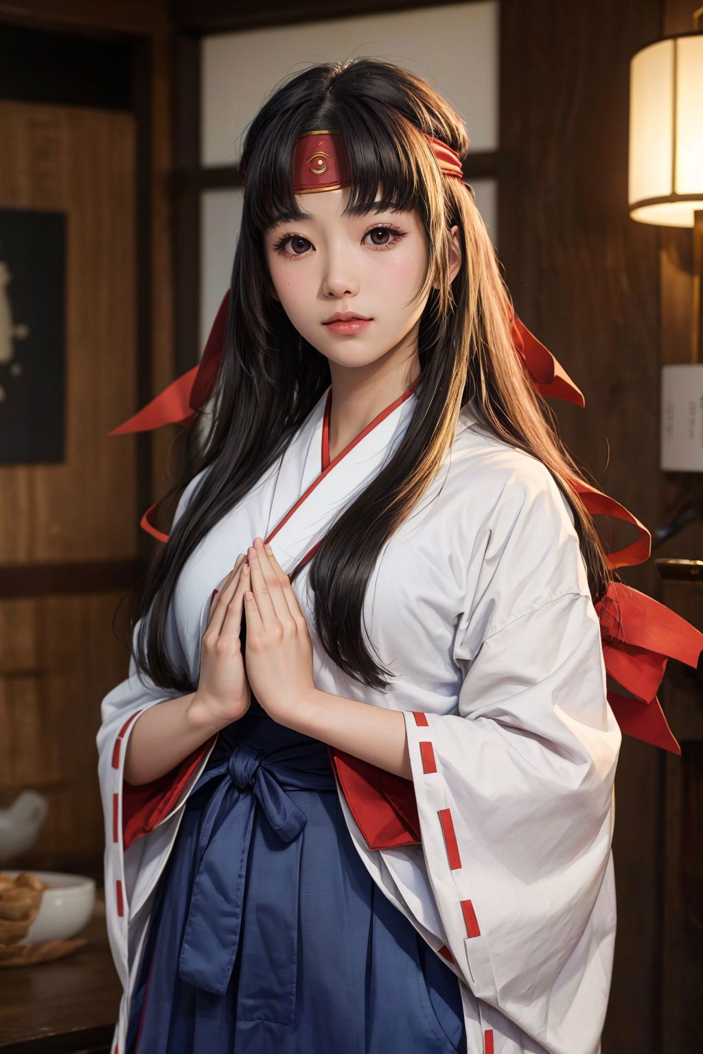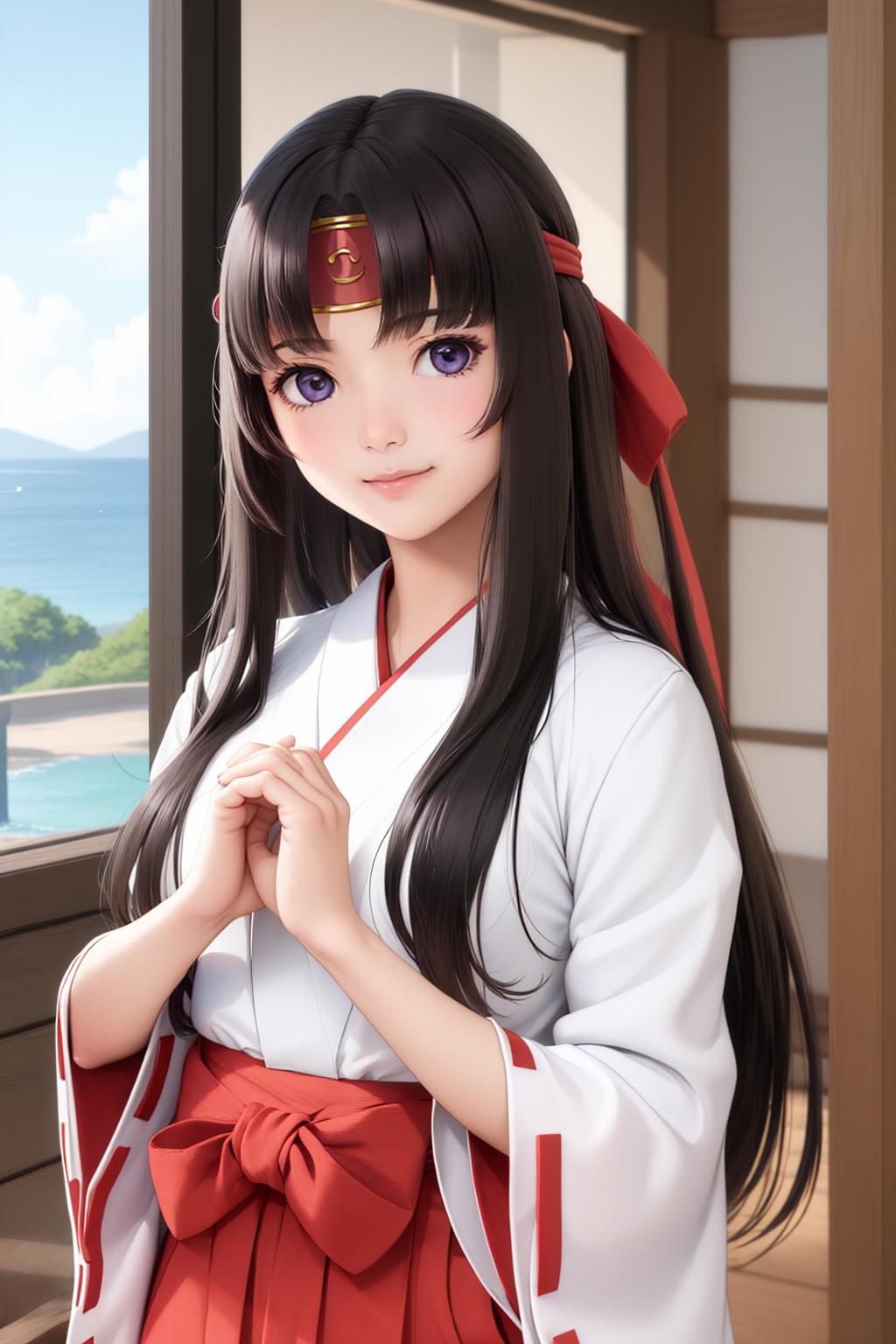 Default Outfit: headband, miko, japanese clothes, ribbon-trimmed sleeves, red hakama, hakama skirt