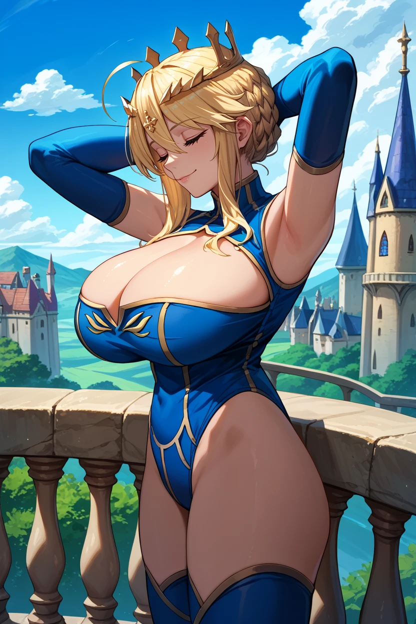 crown, blue leotard, sleeveless, cleavage cutout, elbow gloves, blue gloves, blue thighhighs