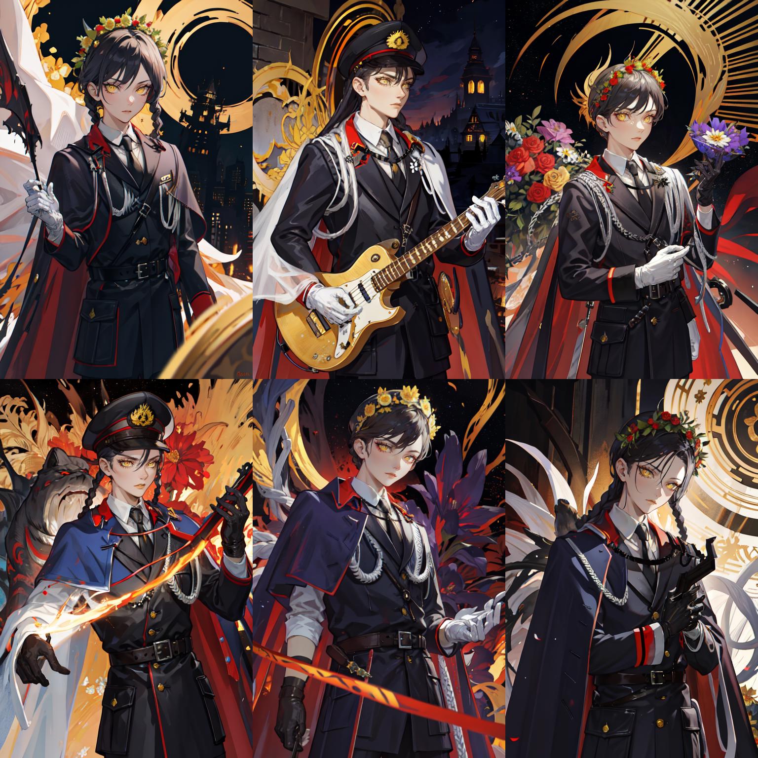 Tags: yakumosmt, hat, uniform, necktie, yellow eyes, black hair, gloves, cape