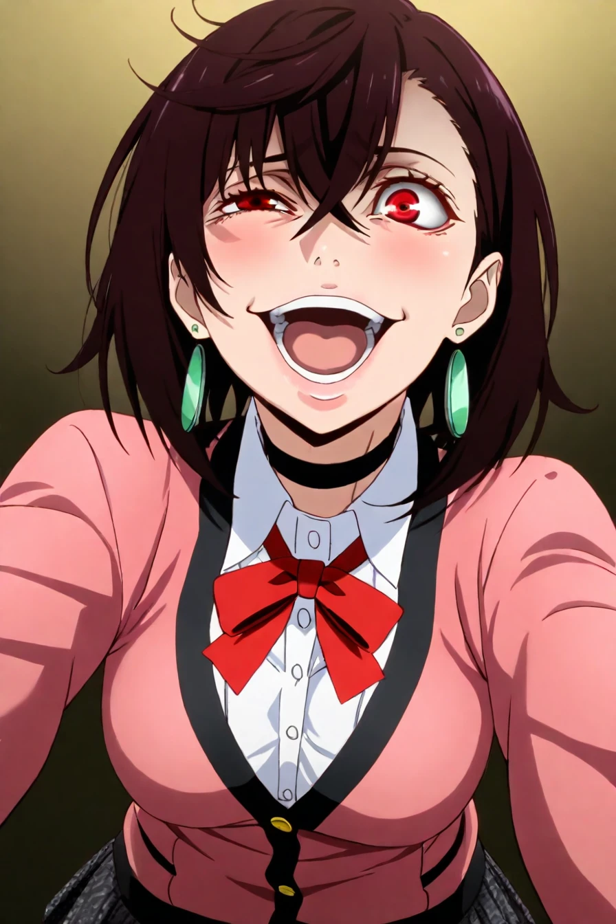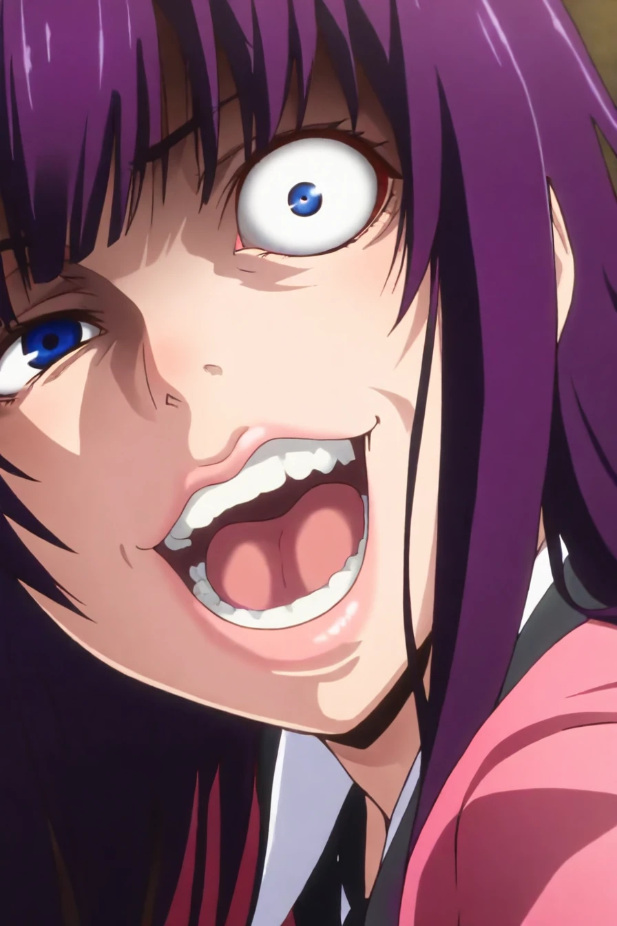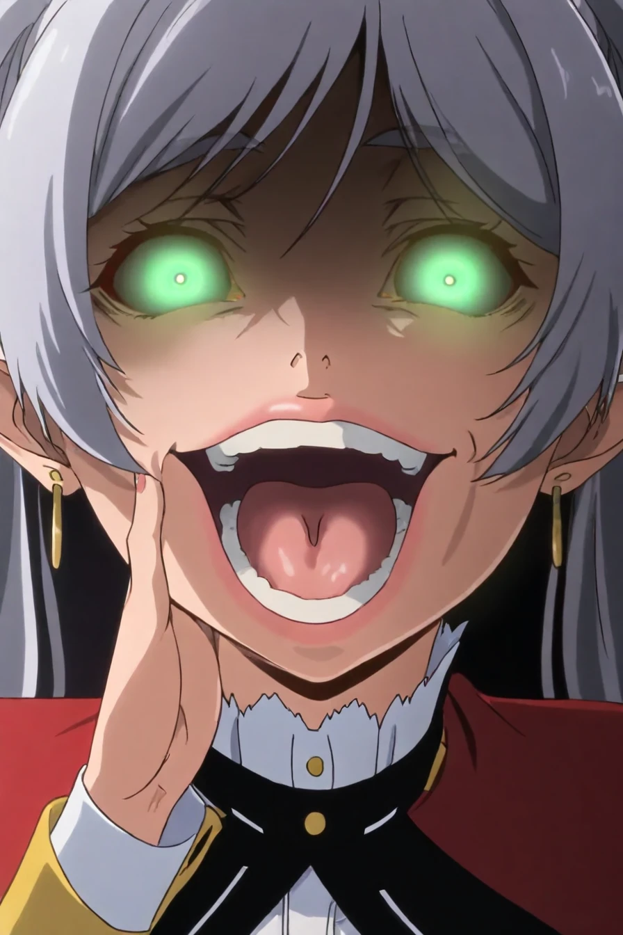 kakegurui_face_expression, glowing eyes, asymmetrical open eyes, open mouth, teeth, tongue, crazy face