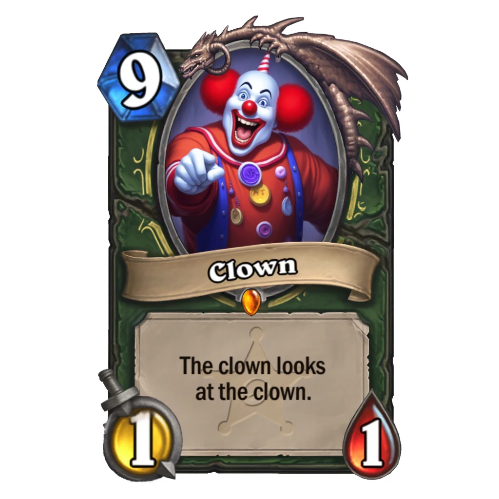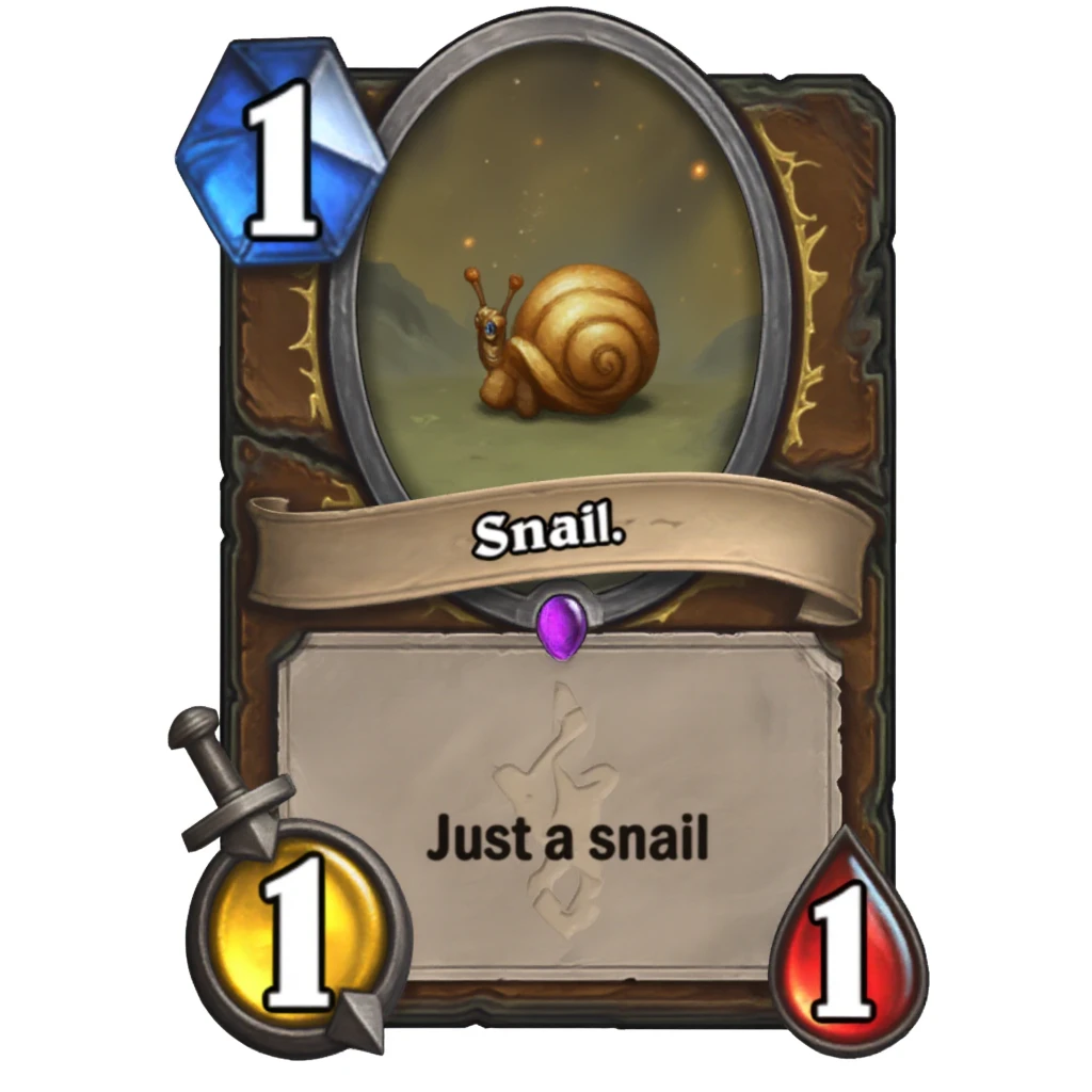 Example prompt: Deathknight card. The card has purple gem under it's name. The name of the card is Snail. In the center of the card is a small snail. The cost of the card is 1, which is located in the upper left corner of the card on the blue crystal. The card has an attack power of 1, which is located in the lower left corner of the card on a yellow circle pierced by a sword. The card has 1 health, which is located in the bottom right corner of the card on a drop of blood. The description of the card in the middle reads: "Just a snail." White background.