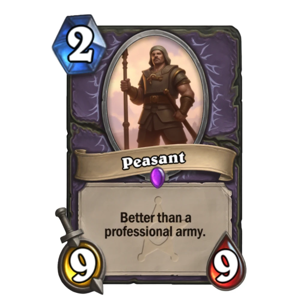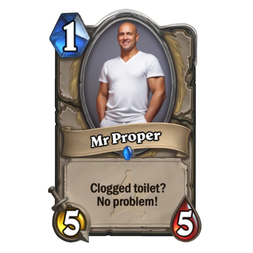 Prompt template: (Any class) card. The card has (no, gray, blue, purple, orange) gem under it's name. The name of the card is (Short name of the card). In the center of the card is (description). The cost of the card is (from 1 to 9), which is located in the upper left corner of the card on the blue crystal. The card has an attack power of (from 1 to 9), which is located in the lower left corner of the card on a yellow circle pierced by a sword. The card has (from 1 to 9) health, which is located in the bottom right corner of the card on a drop of blood. The description of the card in the middle reads: "(Description)" White background.