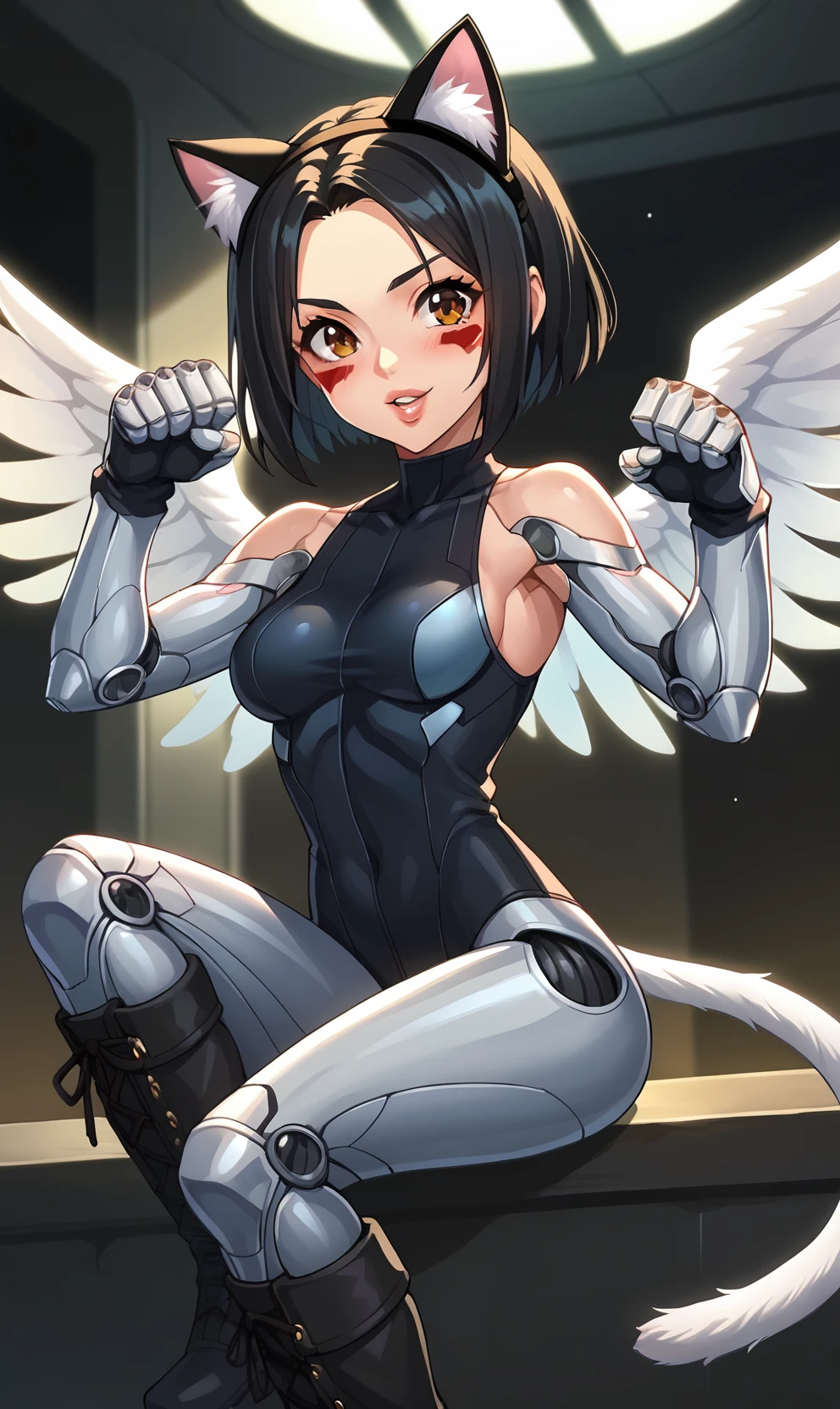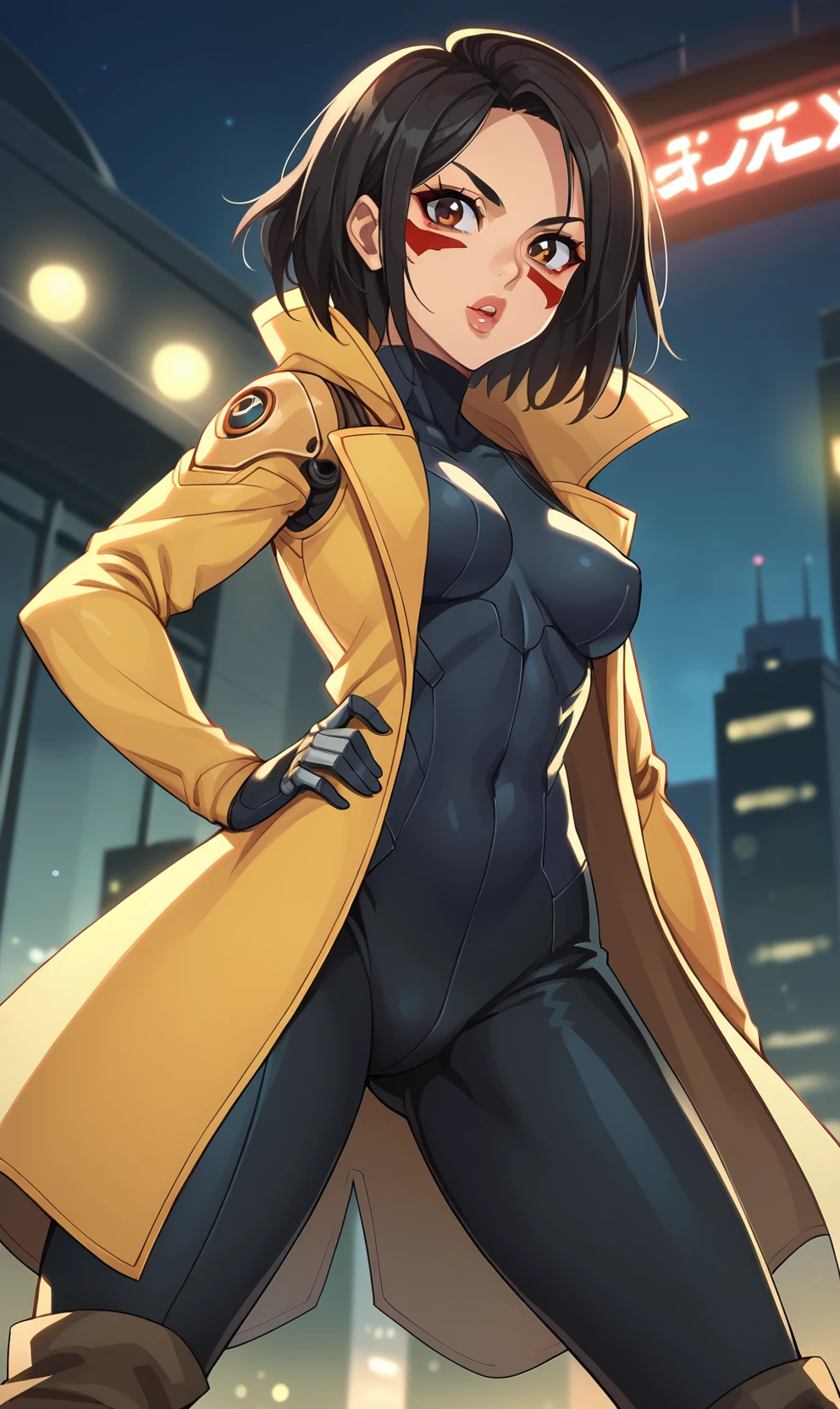 gallyxl, short hair, black hair, brown eyes, lips, facepaint, facial mark, leotard, bare shoulders, pants, mechanical arms, android, cyberpunk, science fiction