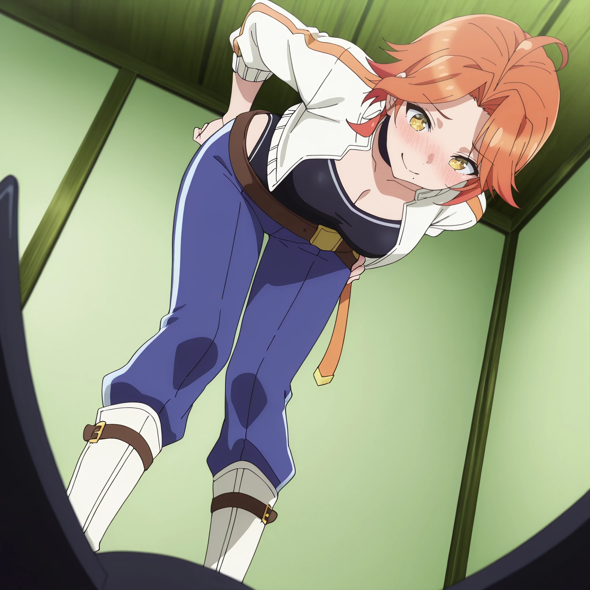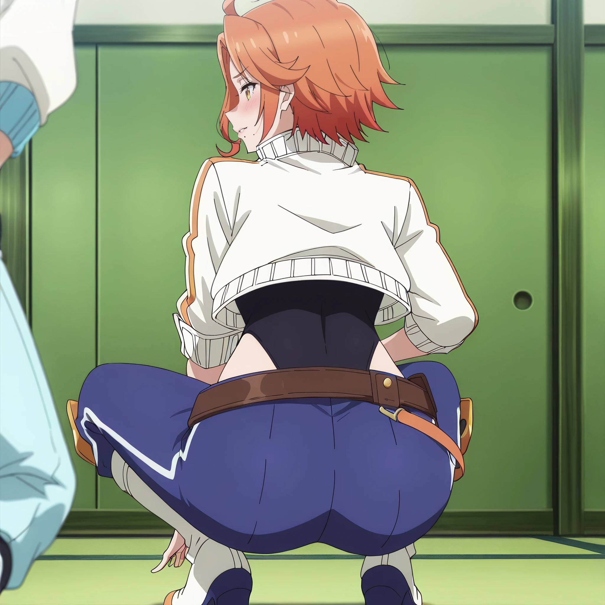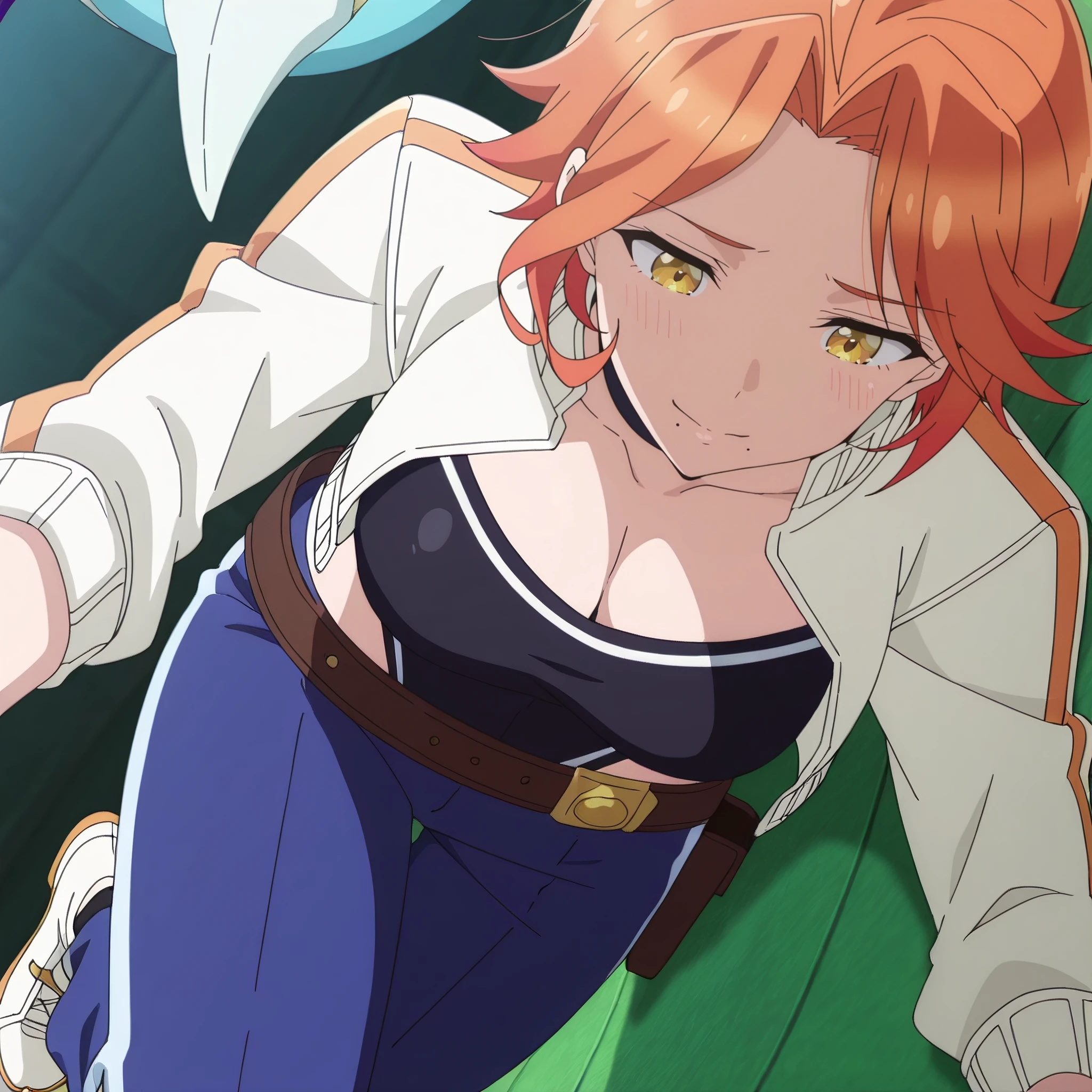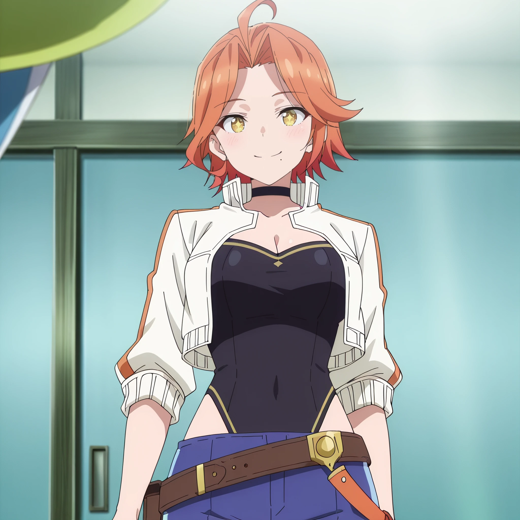white jacket, cropped jacket, cleavage, black leotard, leotard under clothes, blue pants, belt,