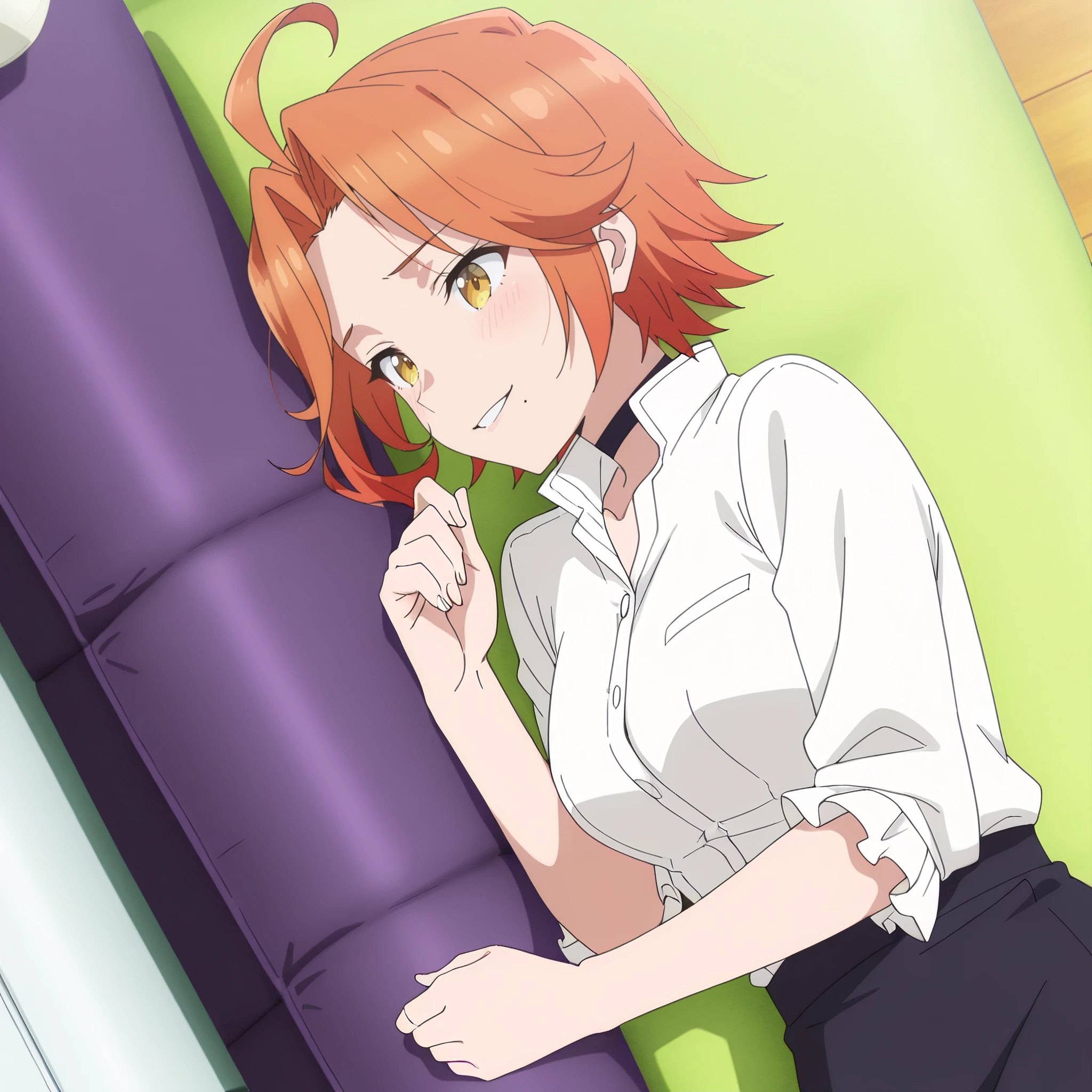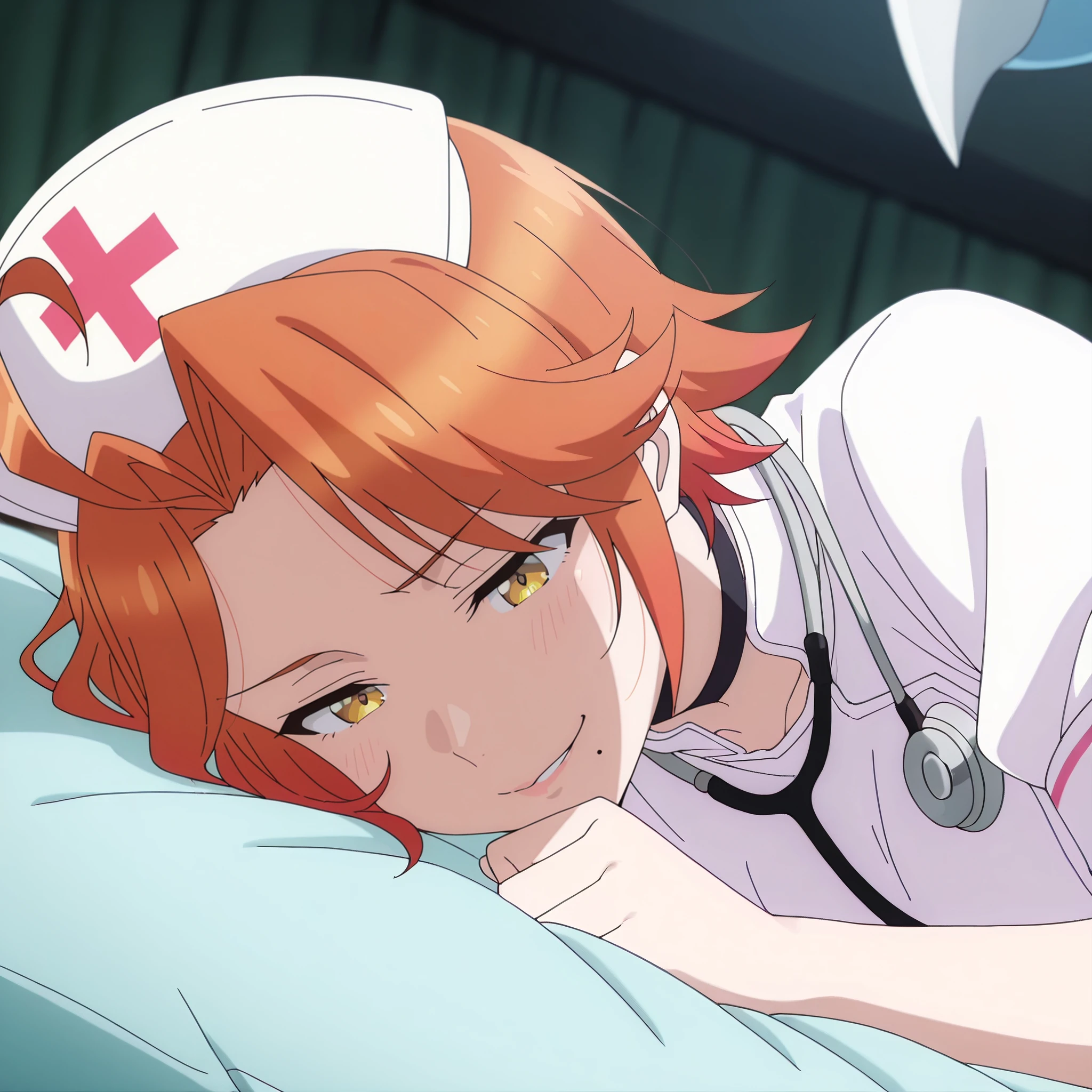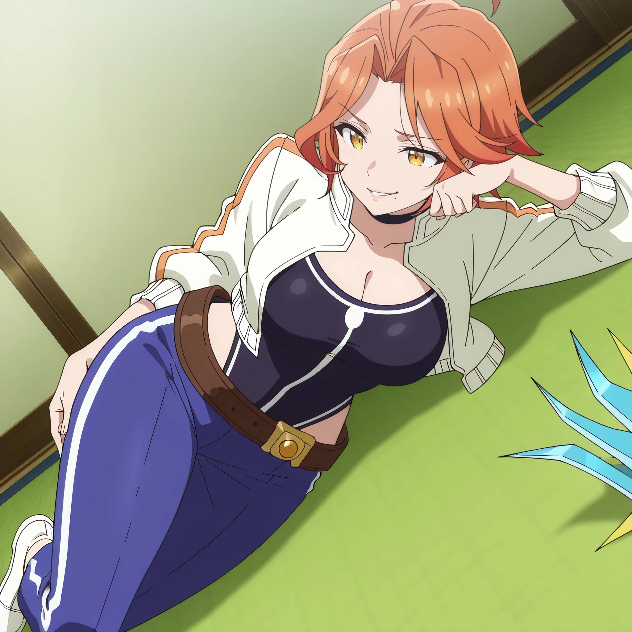 SRAKlum, multicolored hair, orange hair, short hair, yellow eyes, mole under mouth, black choker, ahoge,
