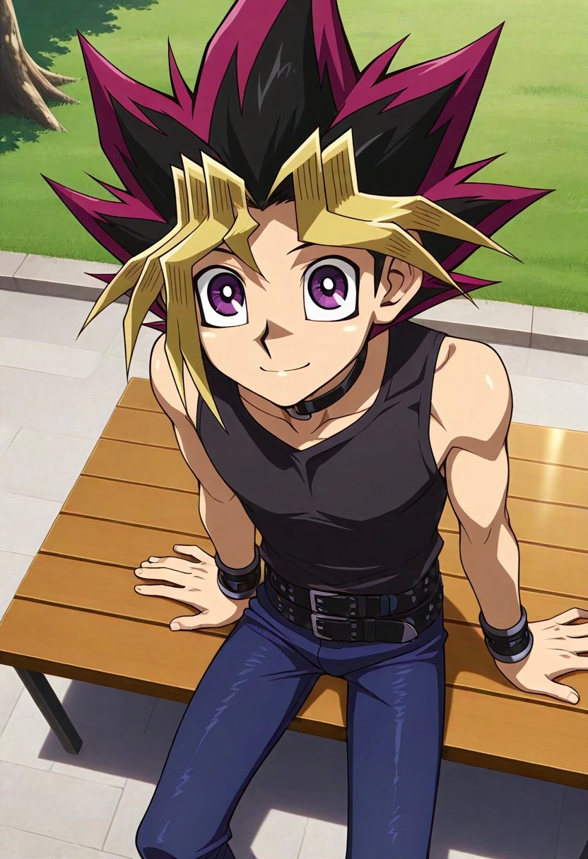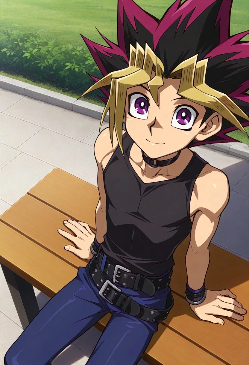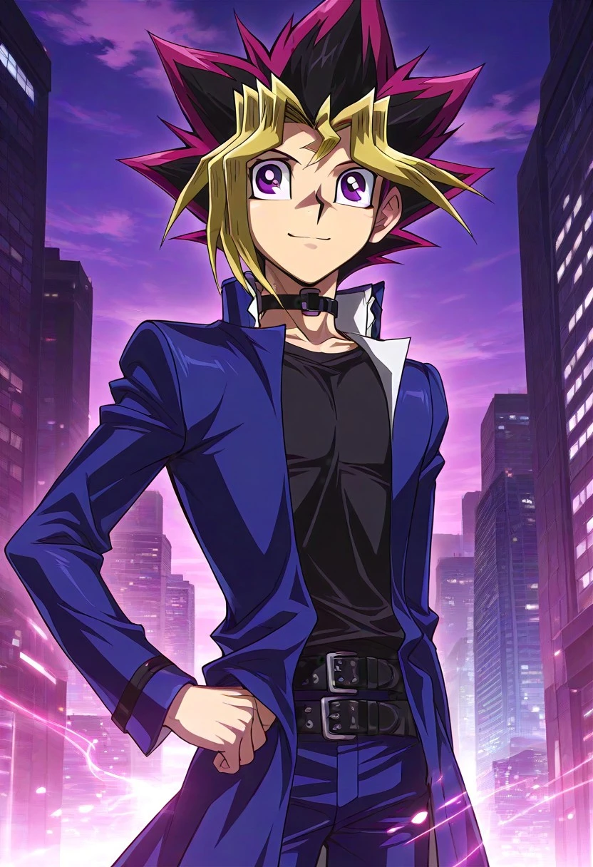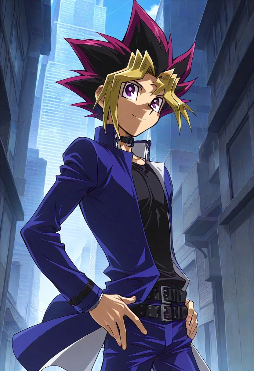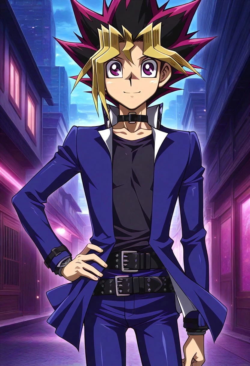Yugi Muto, three-toned hair, spiked hair, purple eyes, black neck choker, black sleeveless shirt, blue gakuran uniform, open gakuran, long sleeves, black wristbands, two black belts, blue pants