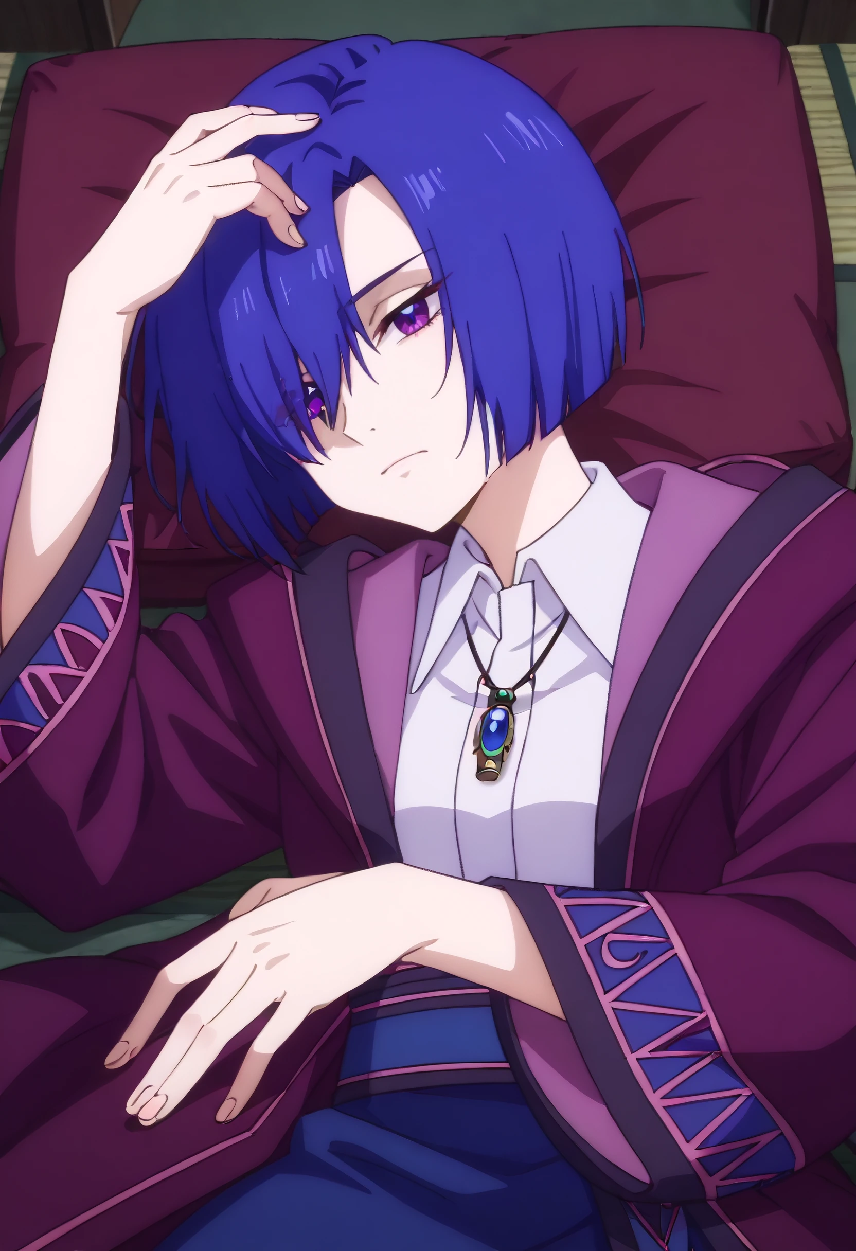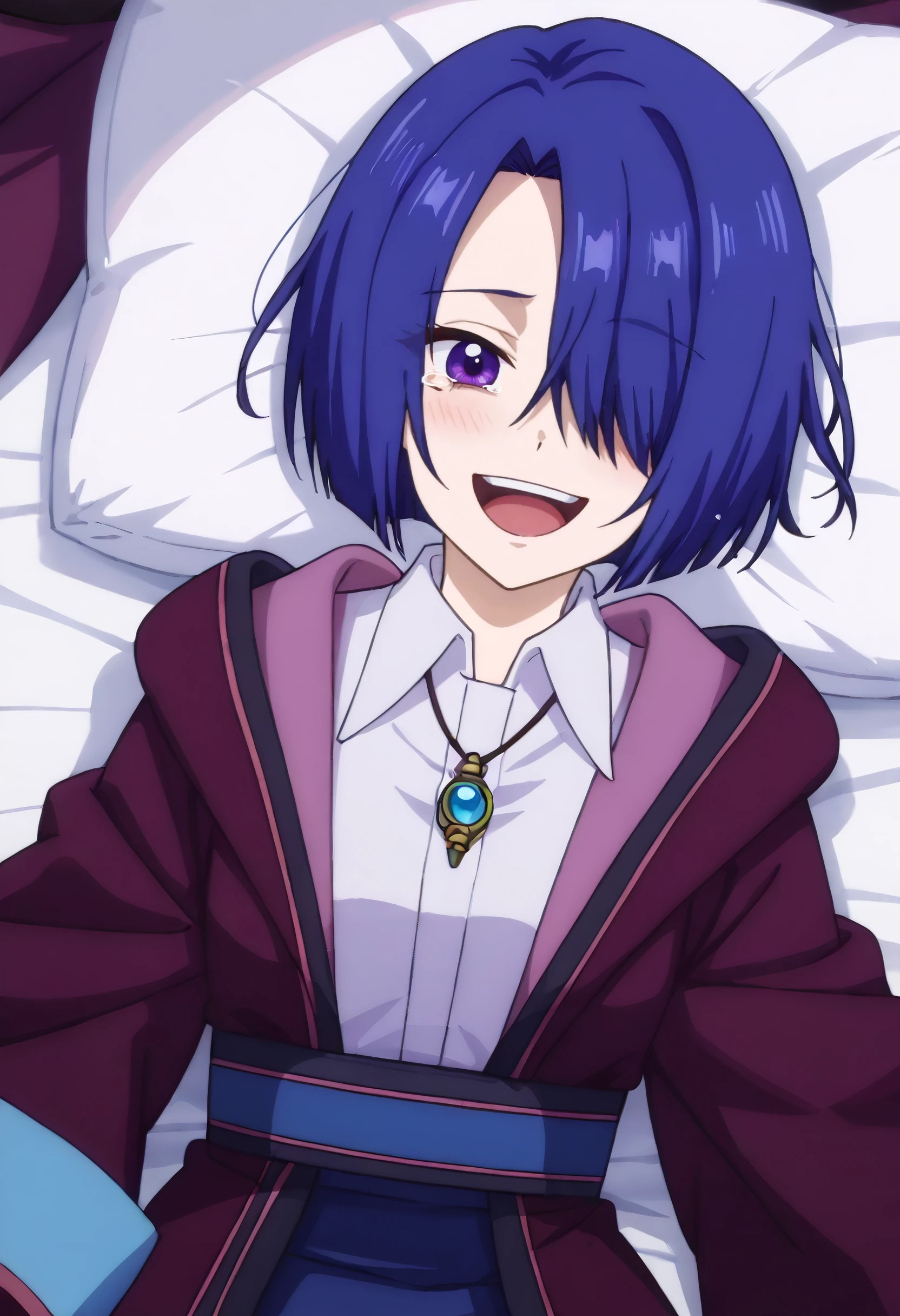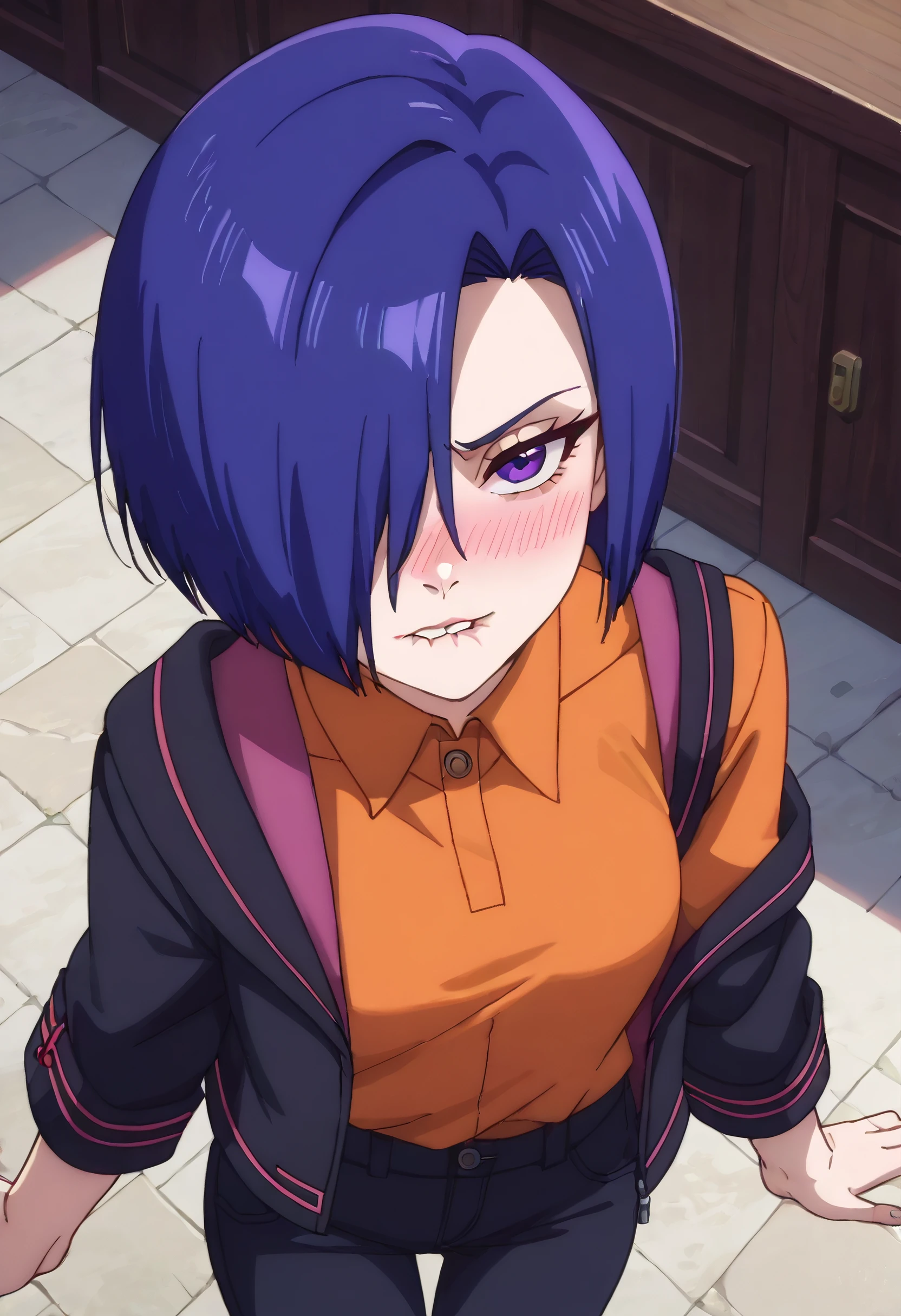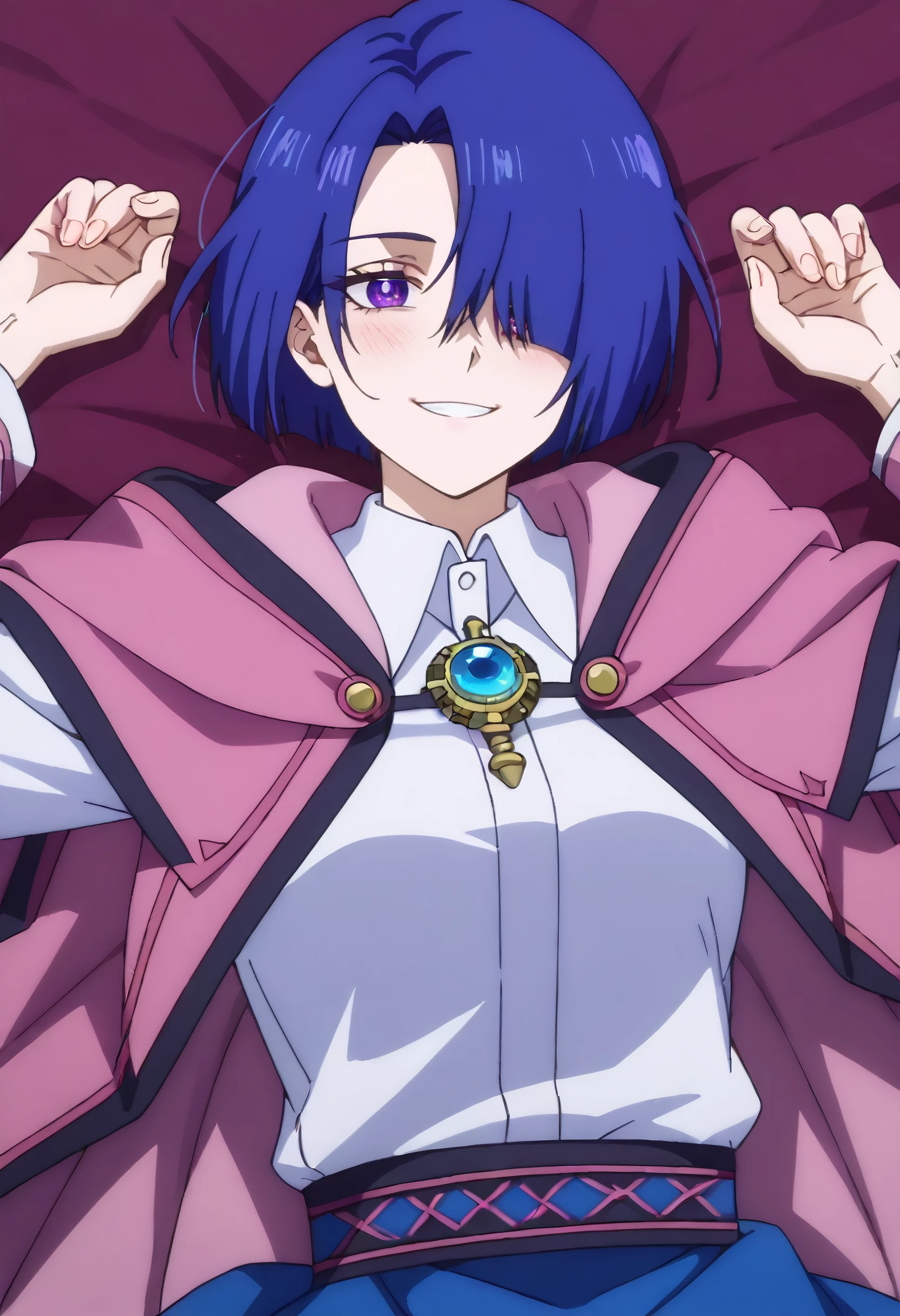 HNMHelena, blue hair, short hair, hair over one eye, purple eyes, bob cut,