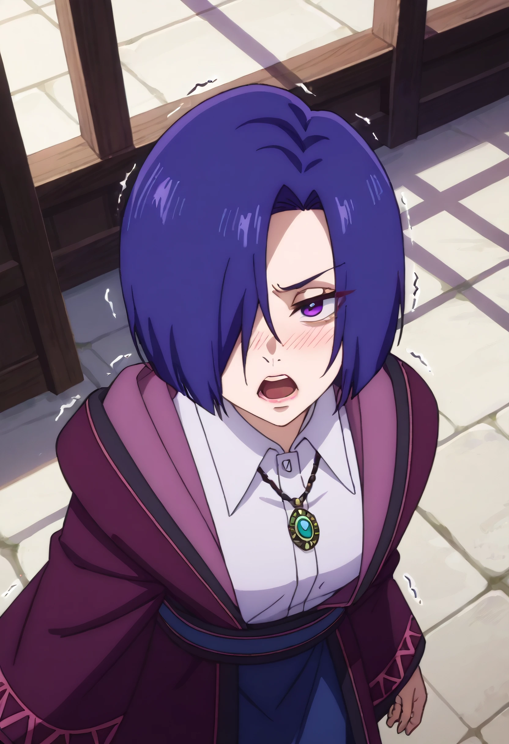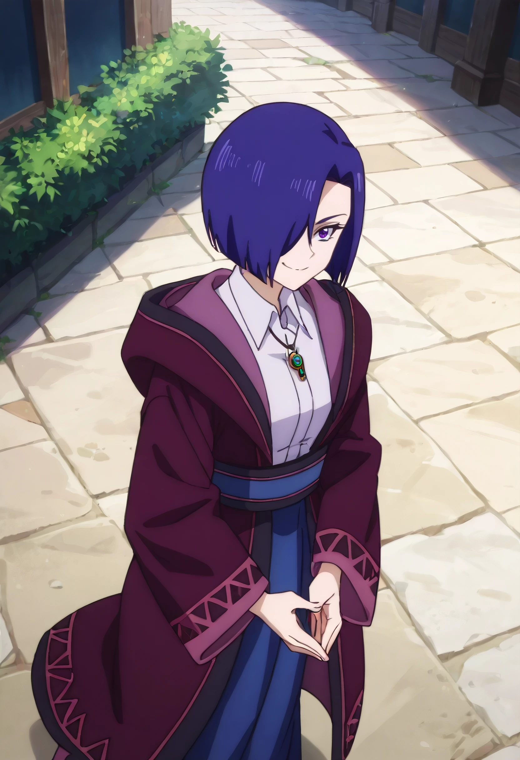 HelenaOutfit, shirt, collared shirt, robe, white shirt, jewelry, necklace, hood, long sleeves, hooded robe, wide sleeves, jacket, coat, open robe, hood down, skirt, purple robe, blue skirt,