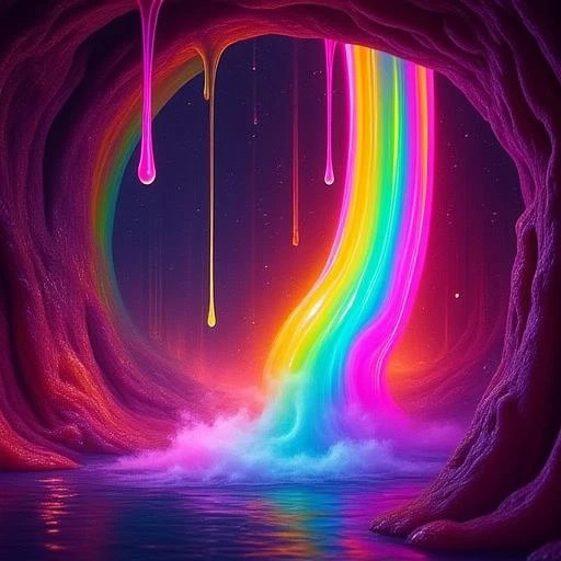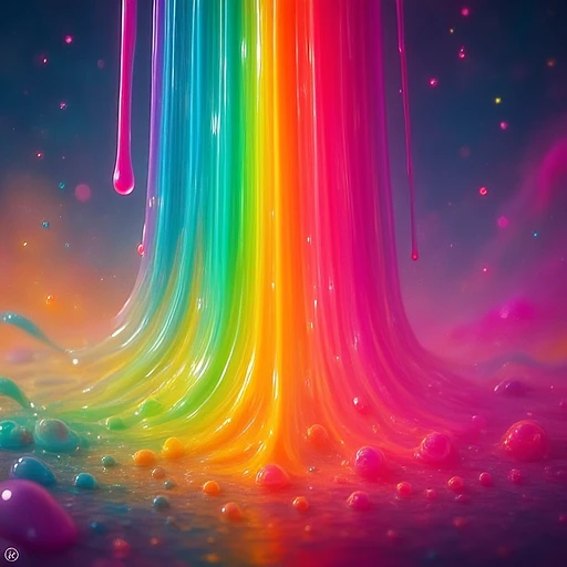 vibrant colors, rainbow slime, glossy texture, photorealistic lighting, high contrast, semi-translucent goo, sticky surface, colorful fluid, liquid motion, cinematic glow, surreal lighting, volumetric glow, slime bubbles, macro details, dripping effect, rainbow streaks, psychedelic slime, colorful reflections, thick slime, organic shapes, hyper saturated colors, shiny liquid, glowing goo, wet surface, multicolored storm, surreal environment, colorful waves, bouncing blobs, dreamy lighting, slime physics