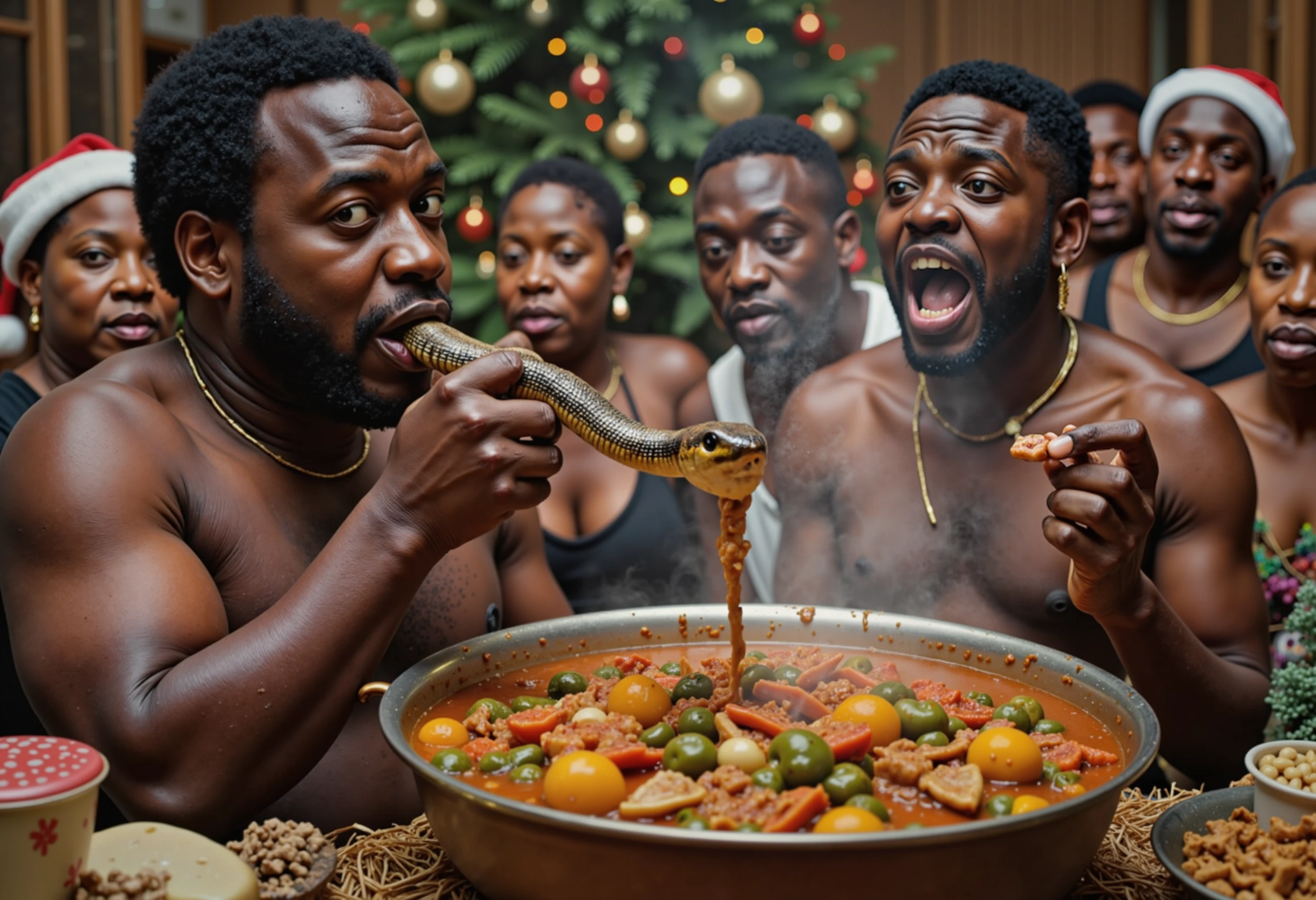 Bobbing for sausage in a vat/tub of brown gravy (side note: the sausages are sausage bird and not pork. Perfectly fine for Hanukkah cards)