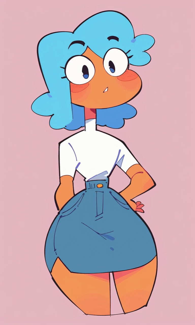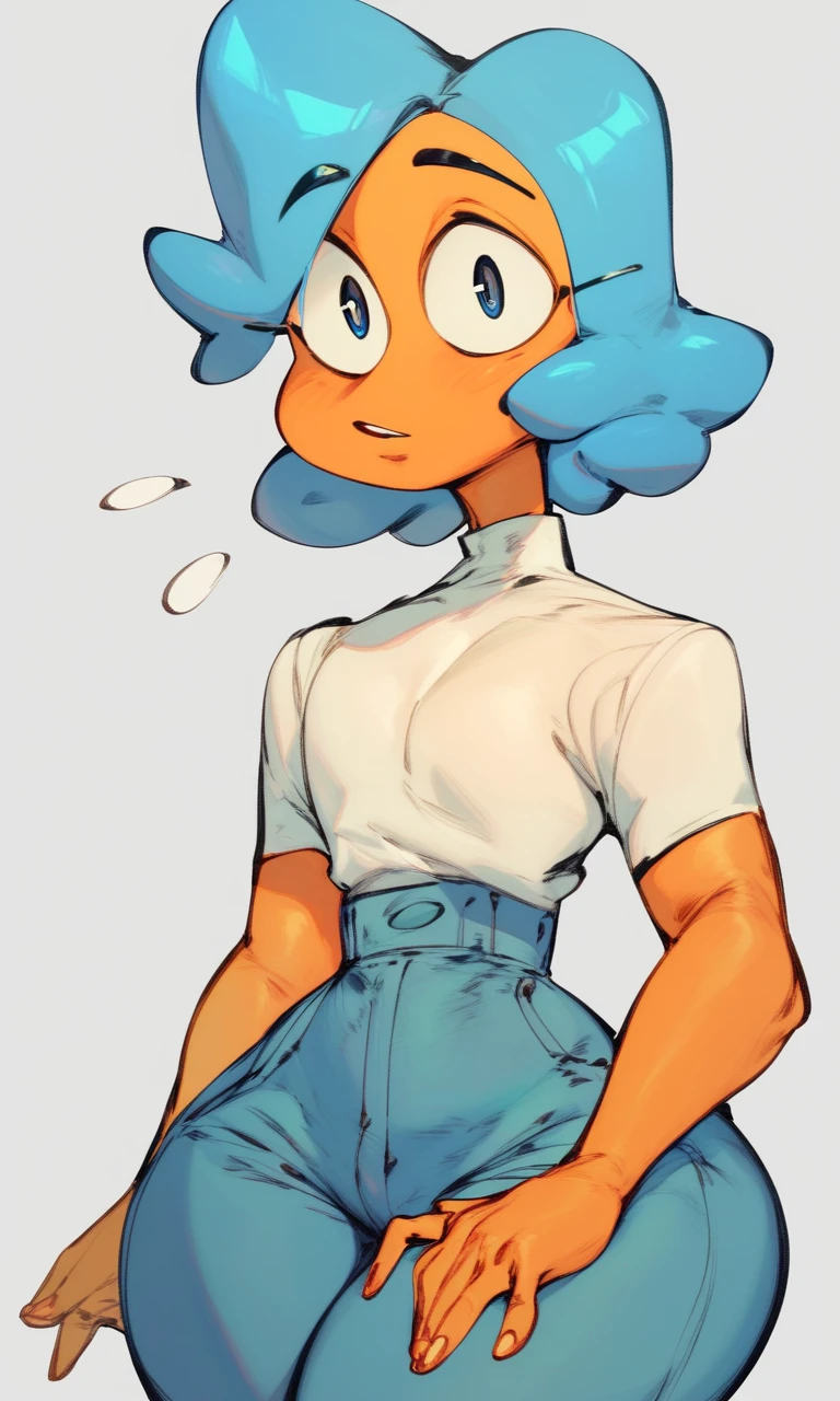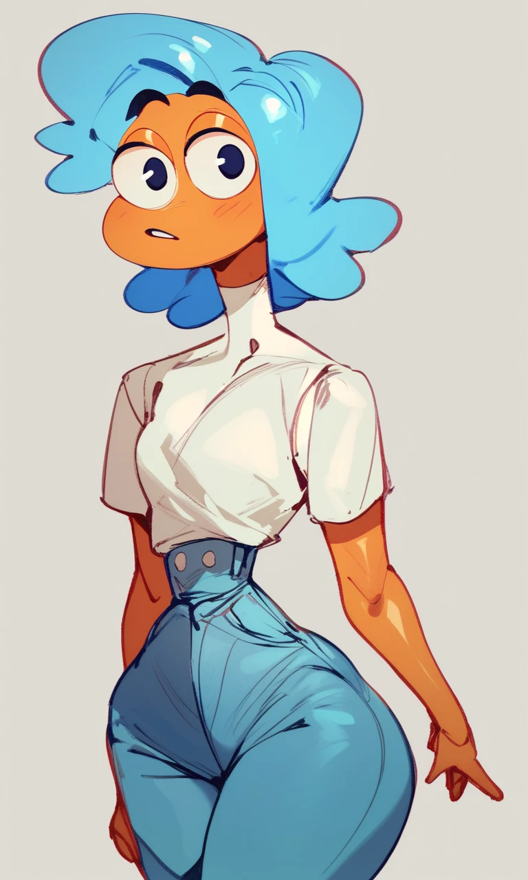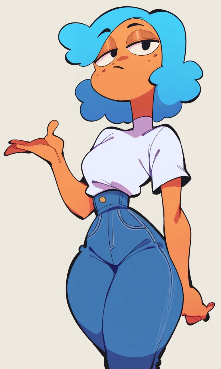 blue hair, orange skin, white shirt, blue jeans, cartoon, short hair, wide hips, narrow waist, bubble eyes