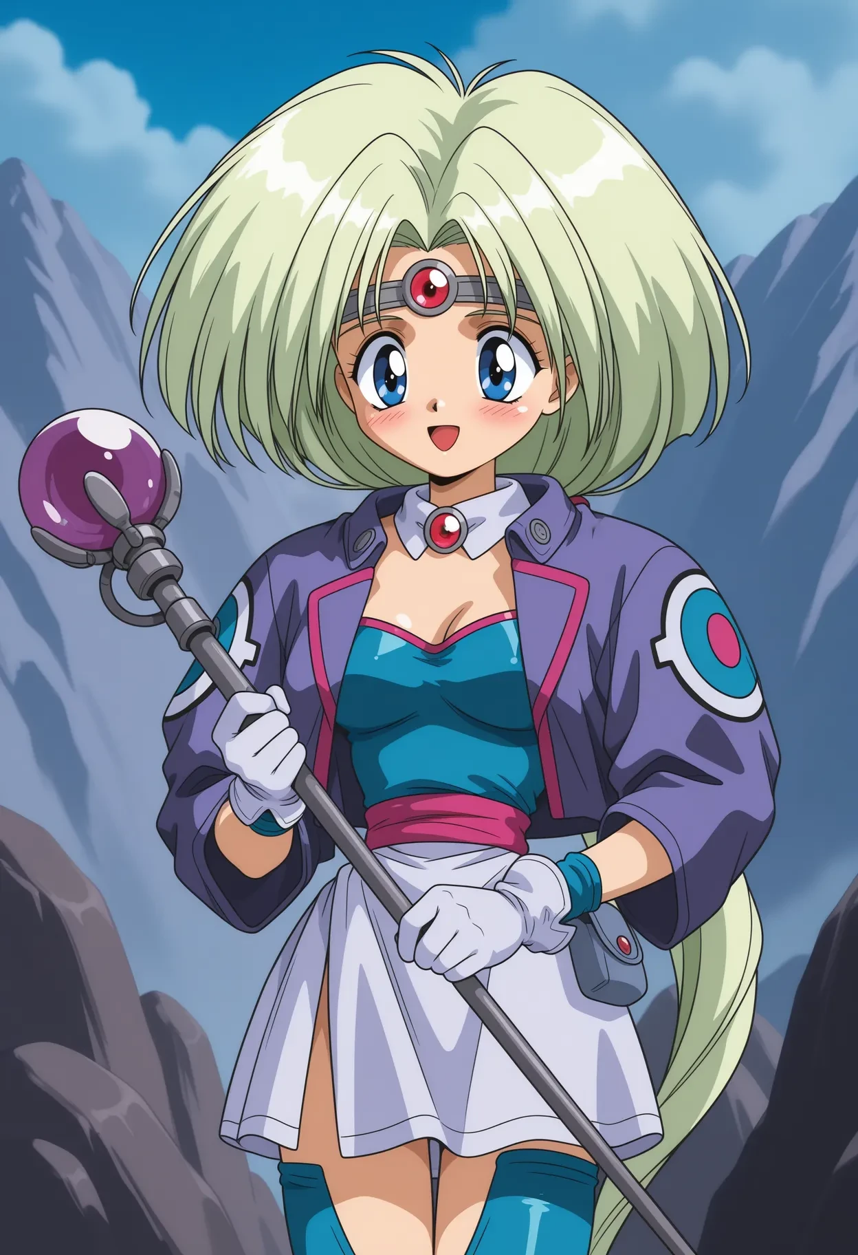 Appearance : PaffyRAD, 1990s \(style\), very long hair, green hair, low ponytail, bangs, circlet, blue eyes, medium breasts,