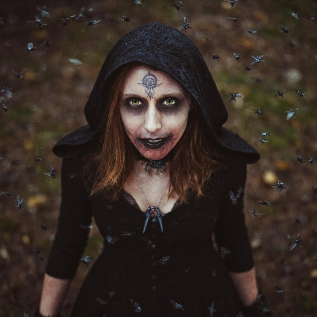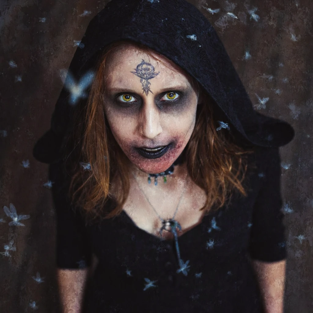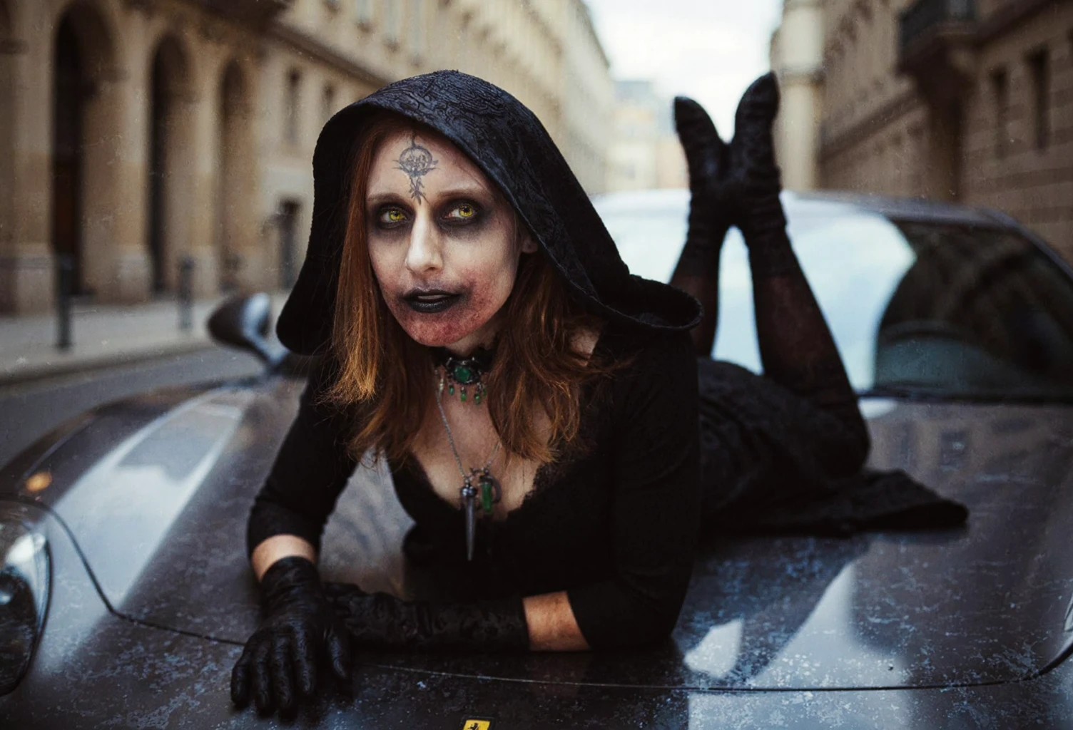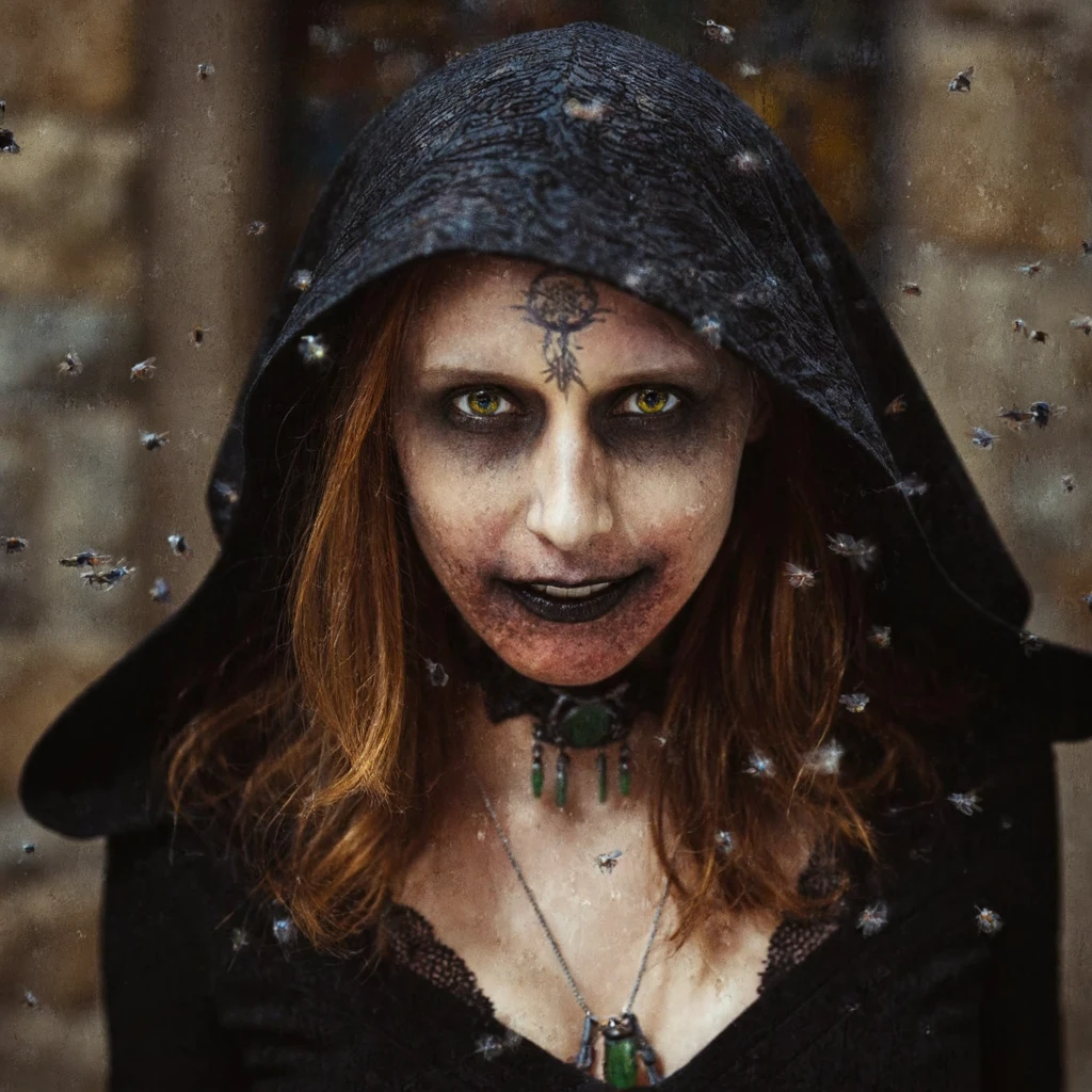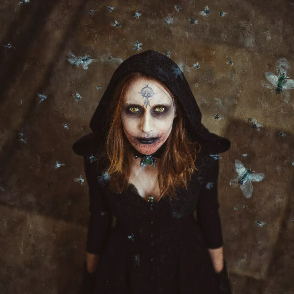 Daniela Dimitrescu, she has yellow eyes, ruined make up, tattoo on forehead, red hair, she is wearing a hooded Gothic dress