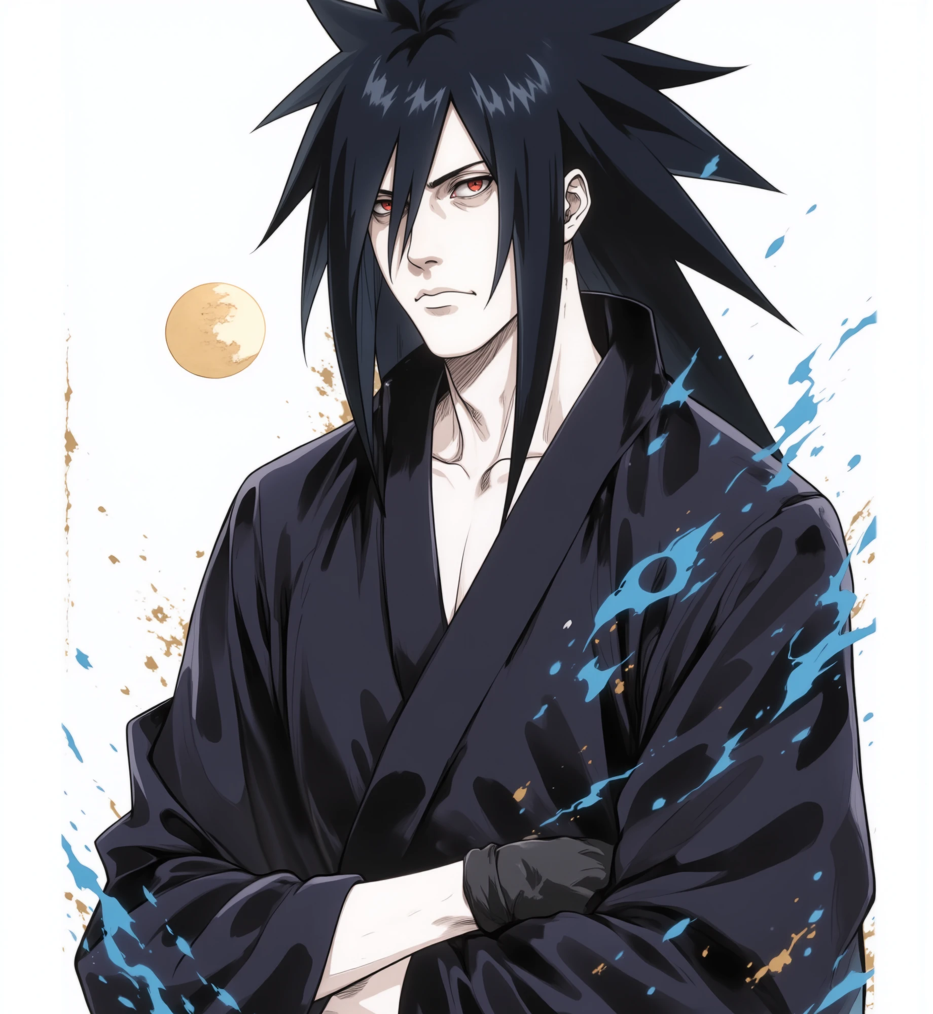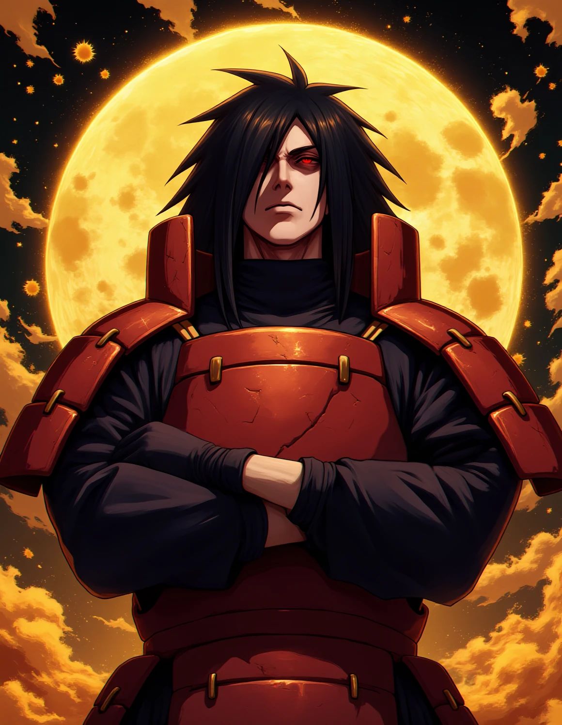 madara, 1boy, solo, male focus, brutal man, red armor, black hair, very long hair, spiky hair, hair over one eye, bangs covering the right side of his face, red eyes, black gloves, black pants
