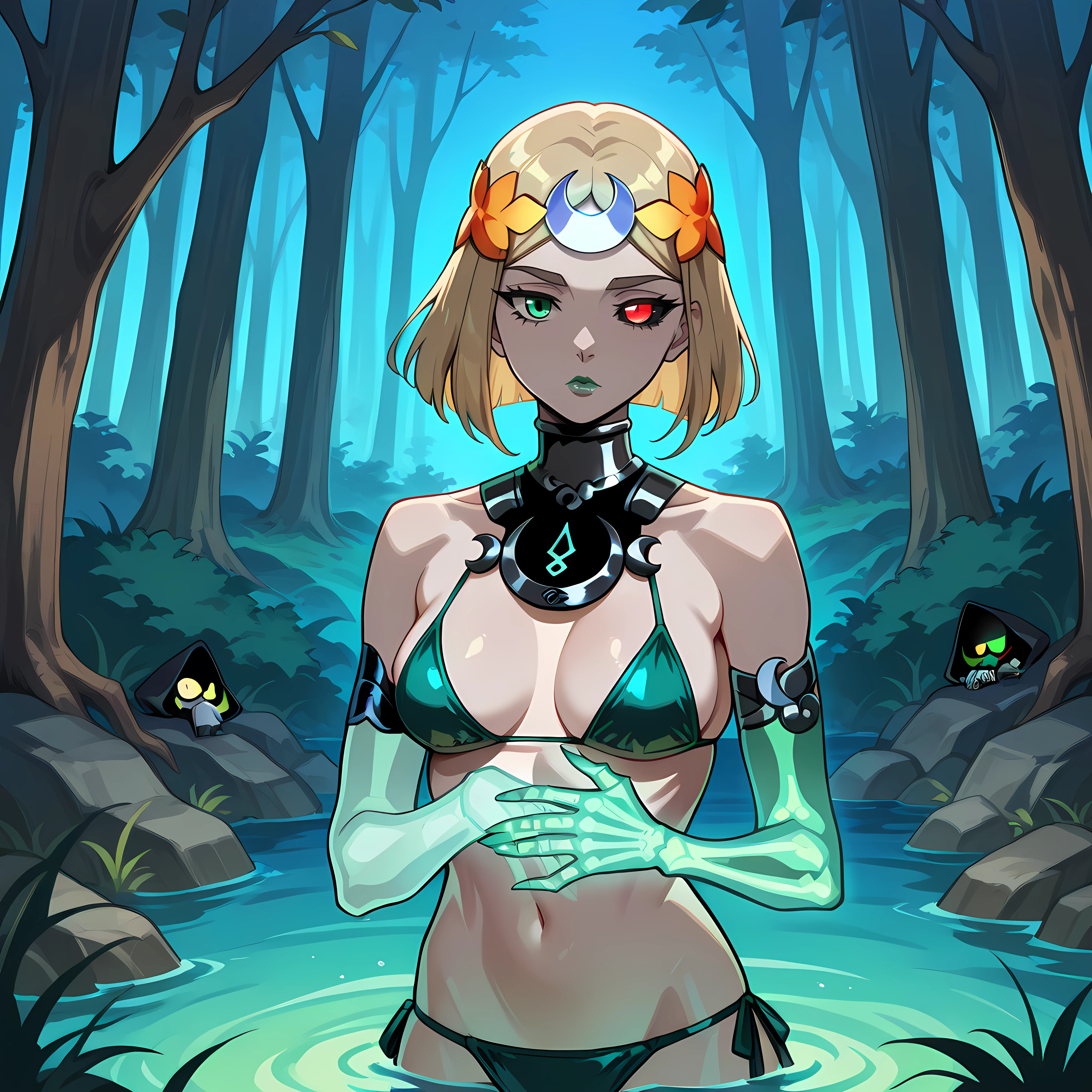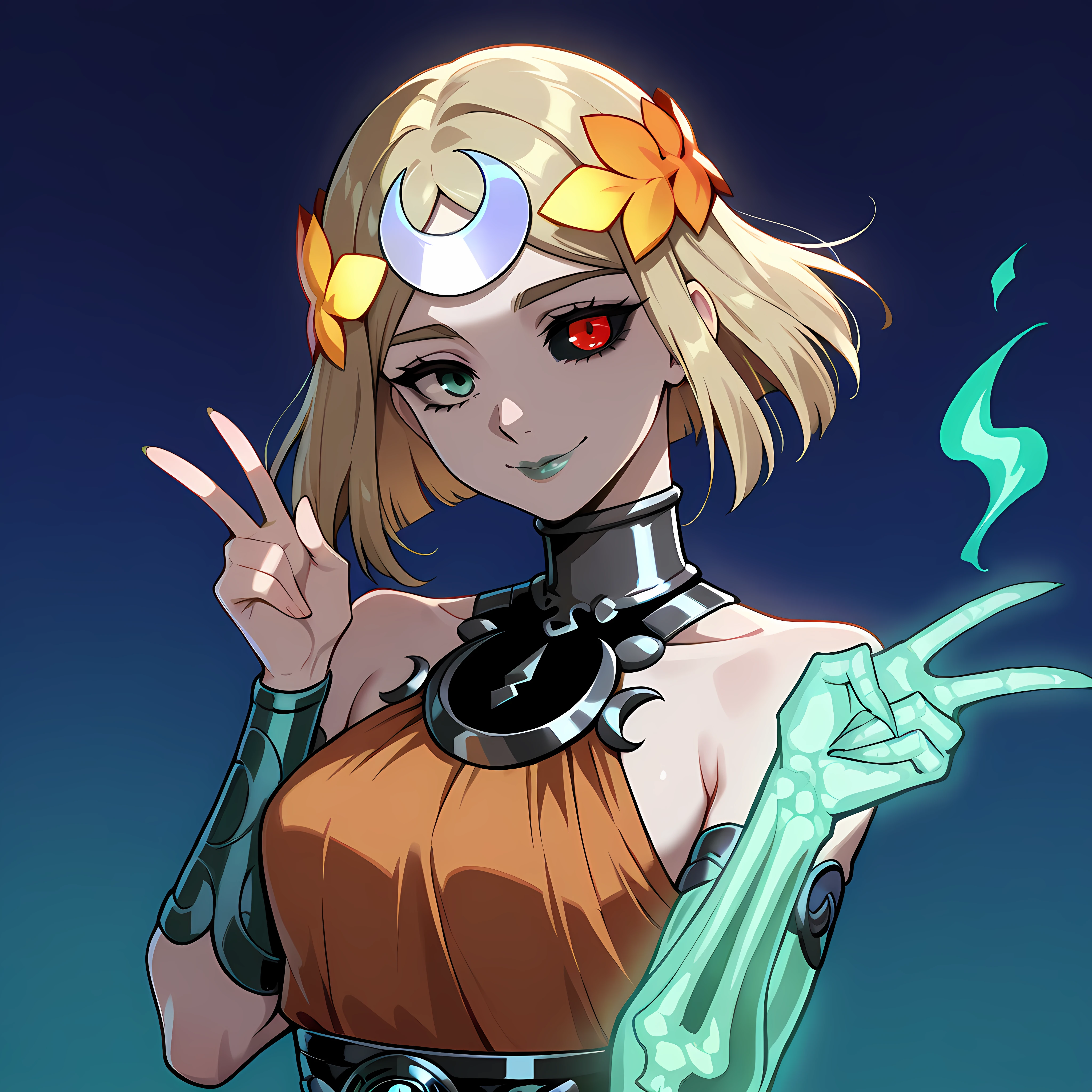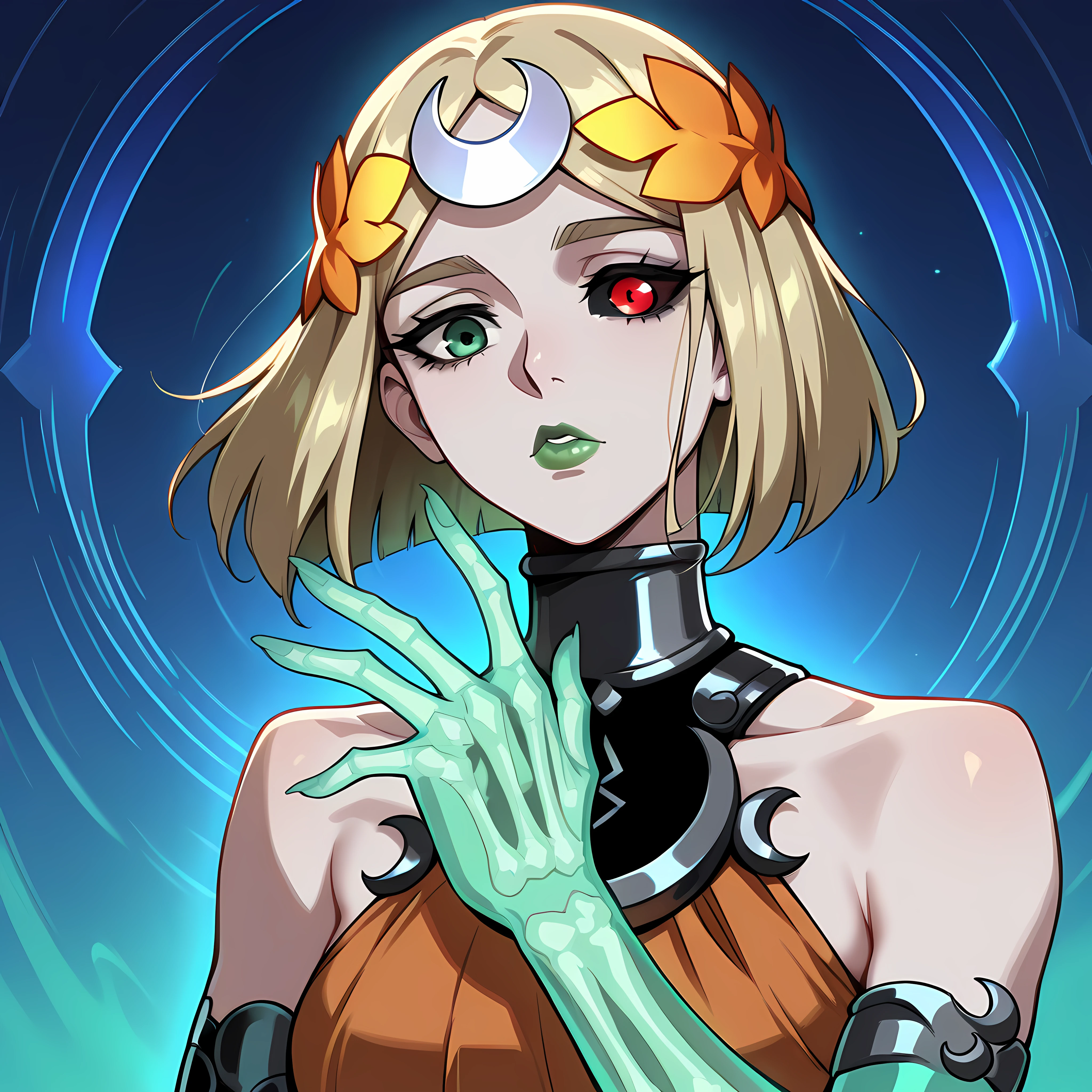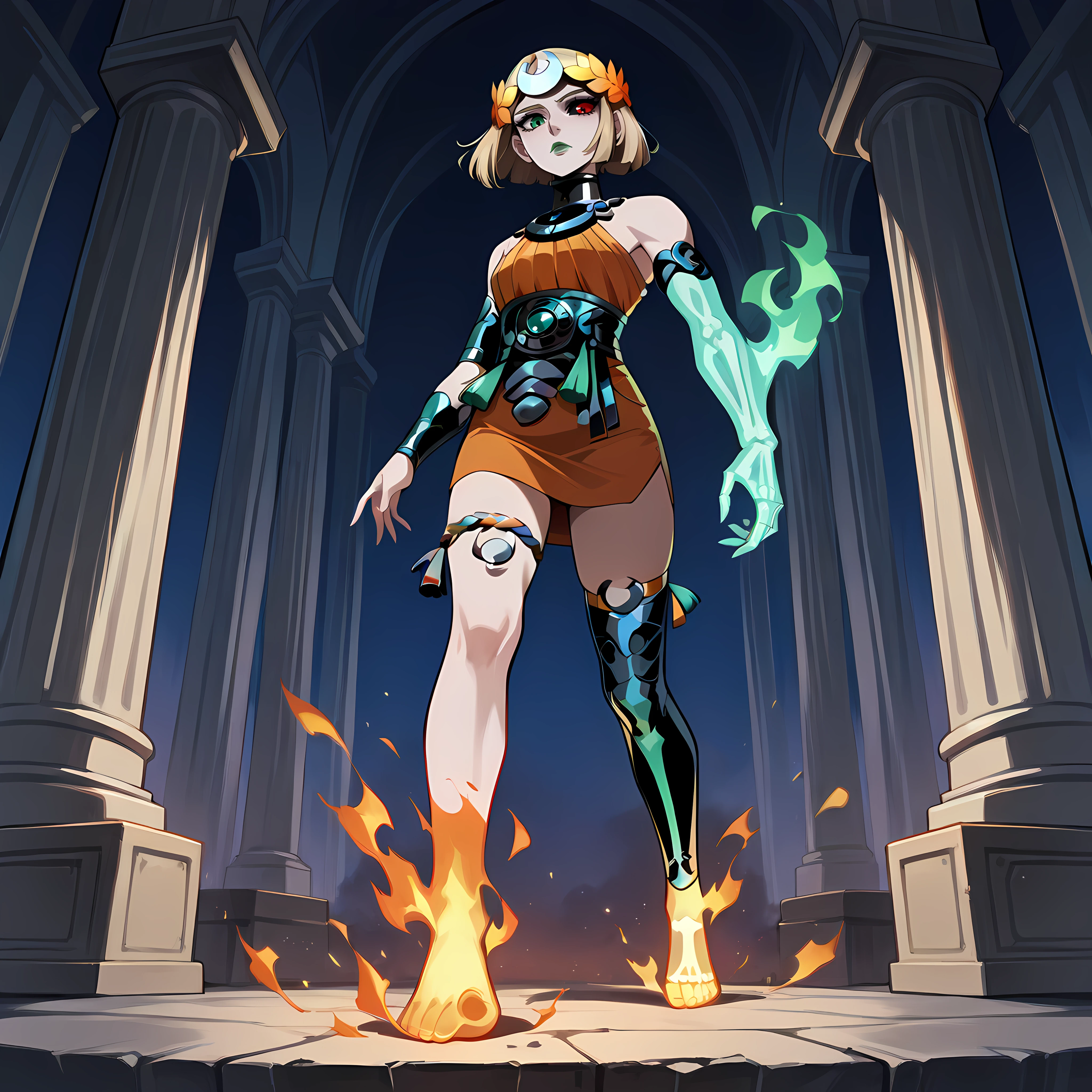 Additional: transparent arm, skeletal arm, blonde hair, short hair, heterochromia, colored sclera, mismatched sclera,green eyes, black sclera, green lips, laurel crown, ancient greek clothes, greco-roman clothes, bare shoulders, orange dress