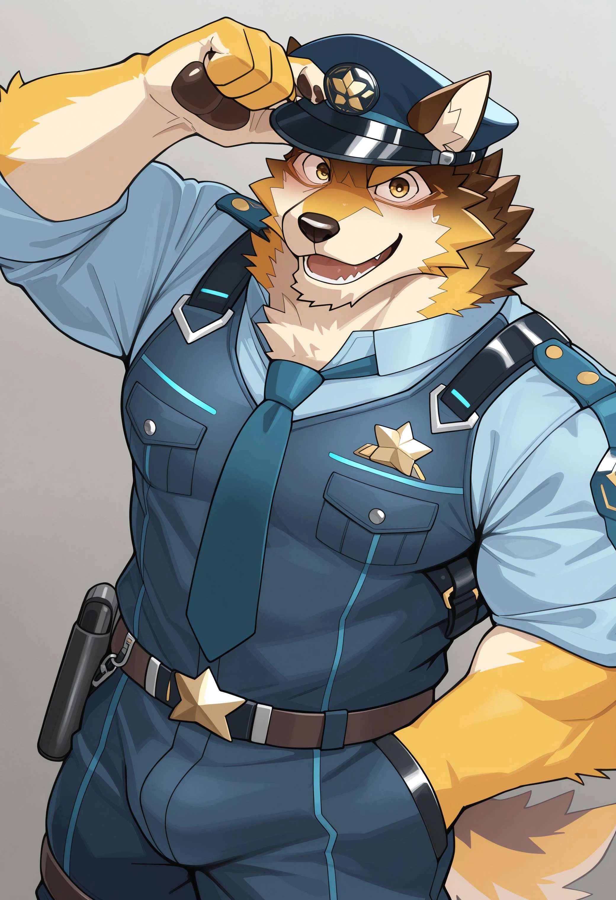 b4rre1, live a hero, furry, furry male, muscular, 1boy, solo, dog boy, yellow eyes, officer clothes